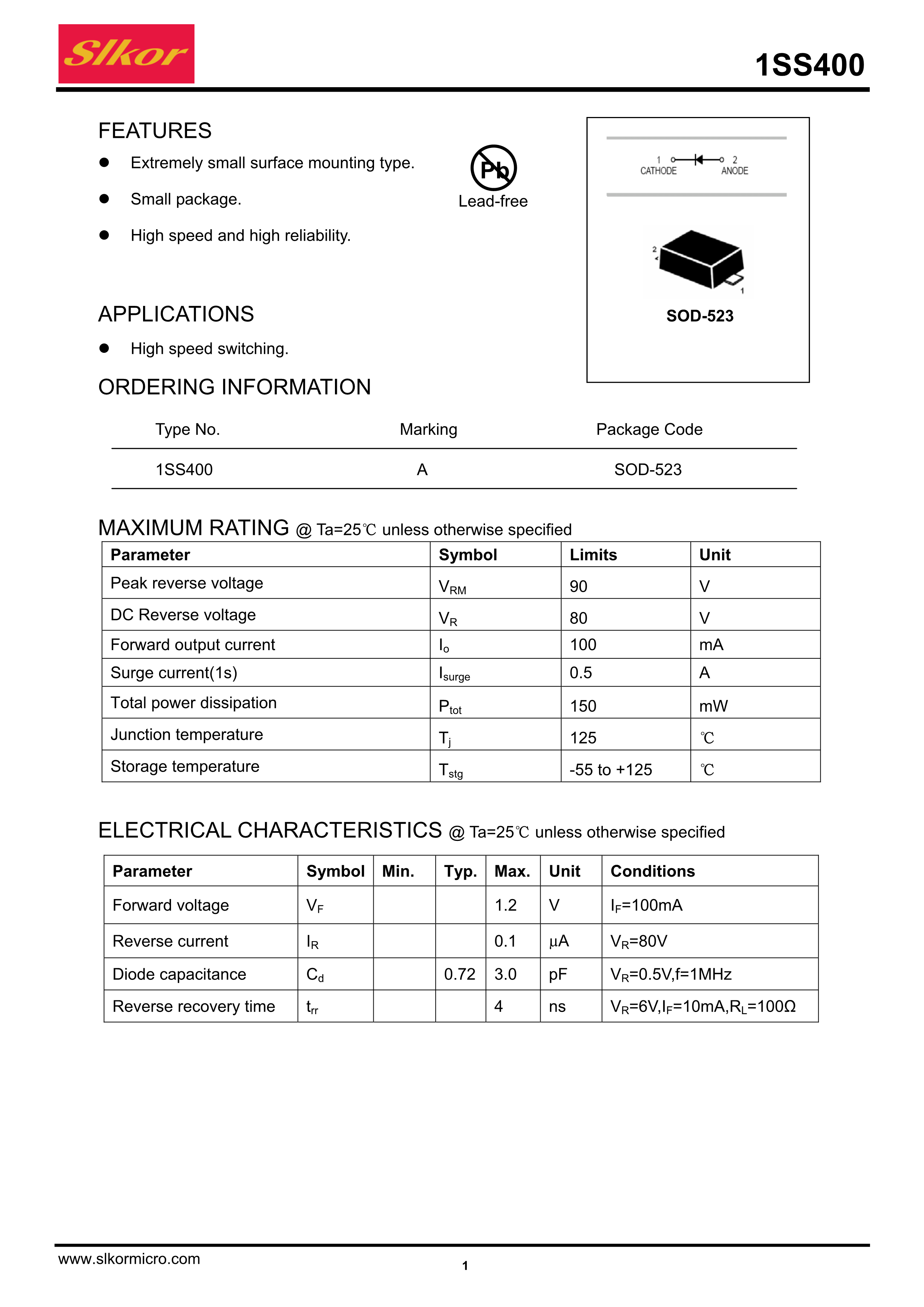 1SS400数据手册SOD-523封装Slkor(萨科微)PDF规格书,中英文下载