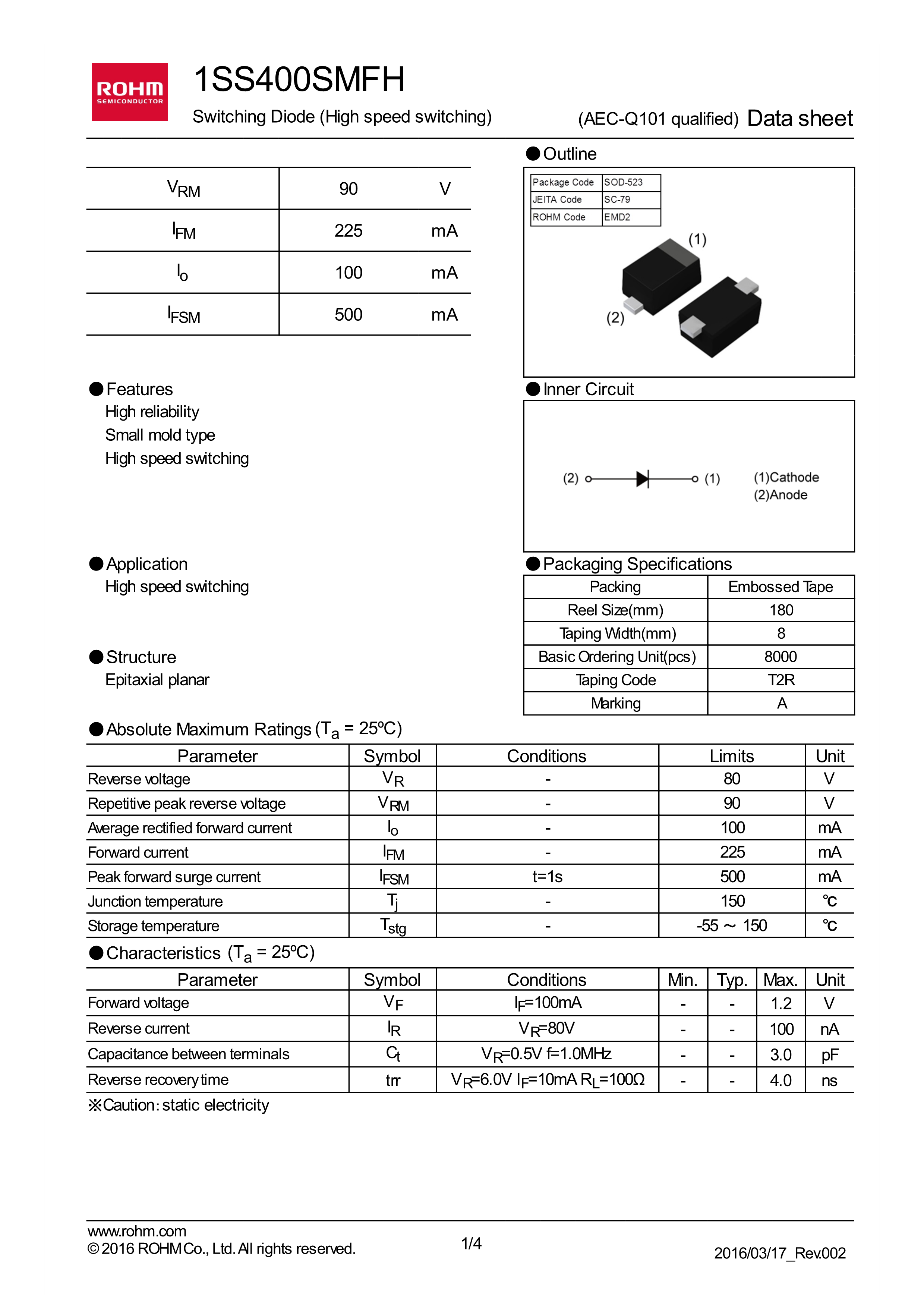 1SS400SMFHT2R数据手册SOD-523封装ROHM(罗姆)PDF规格书,中英文下载