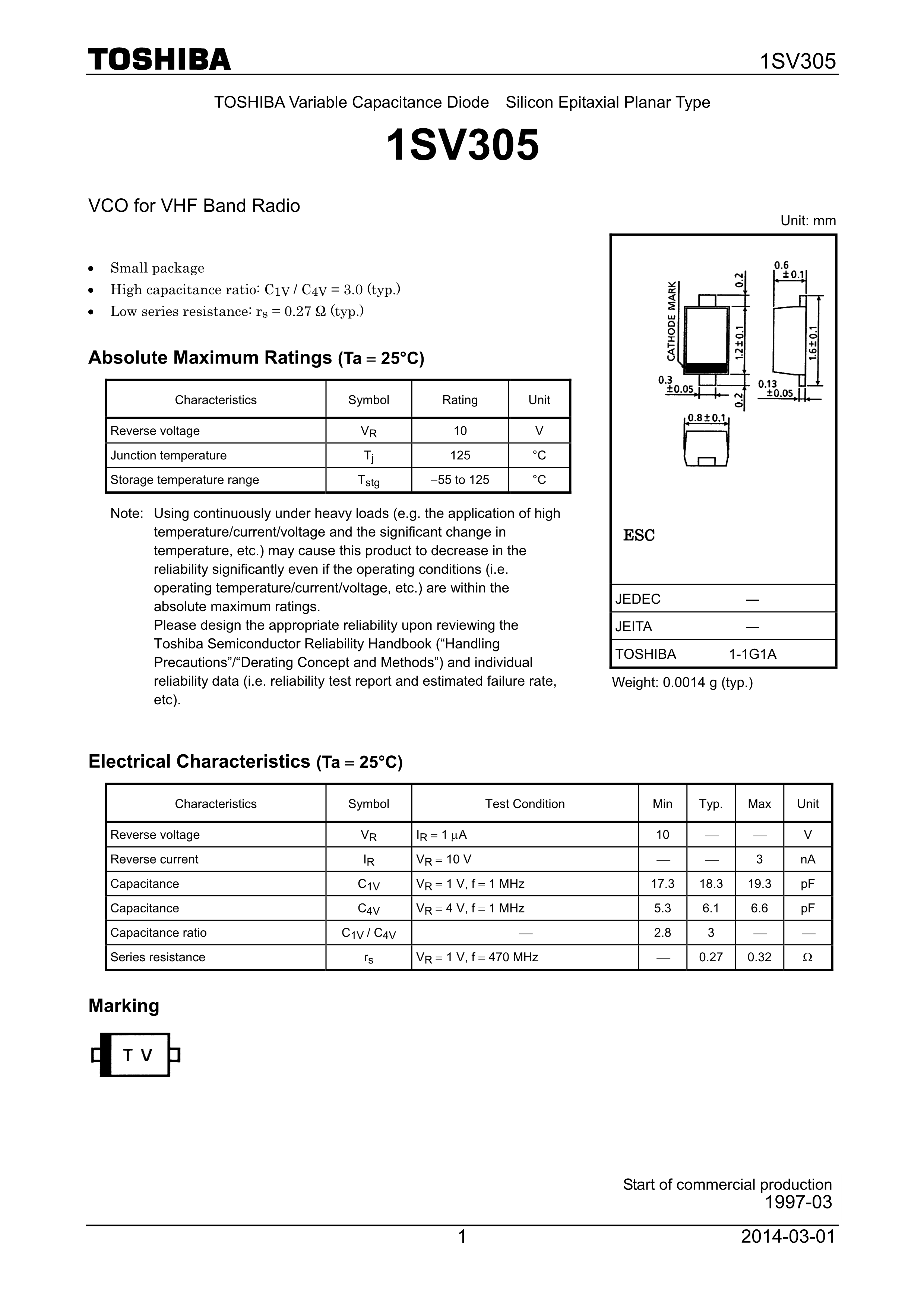 1SV305(TPH3F)数据手册SOD-523封装TOSHIBA(东芝)PDF规格书,中英文下载