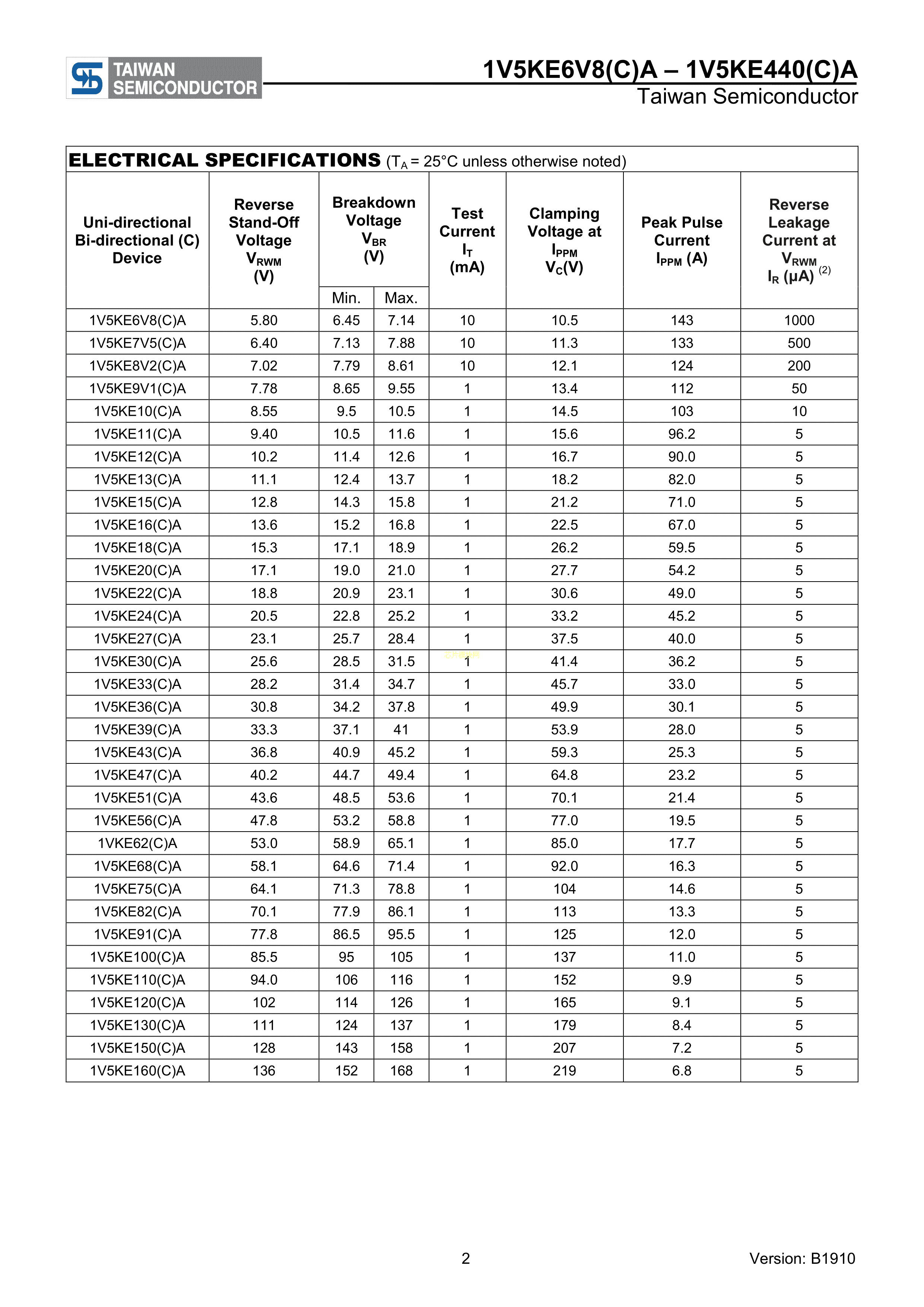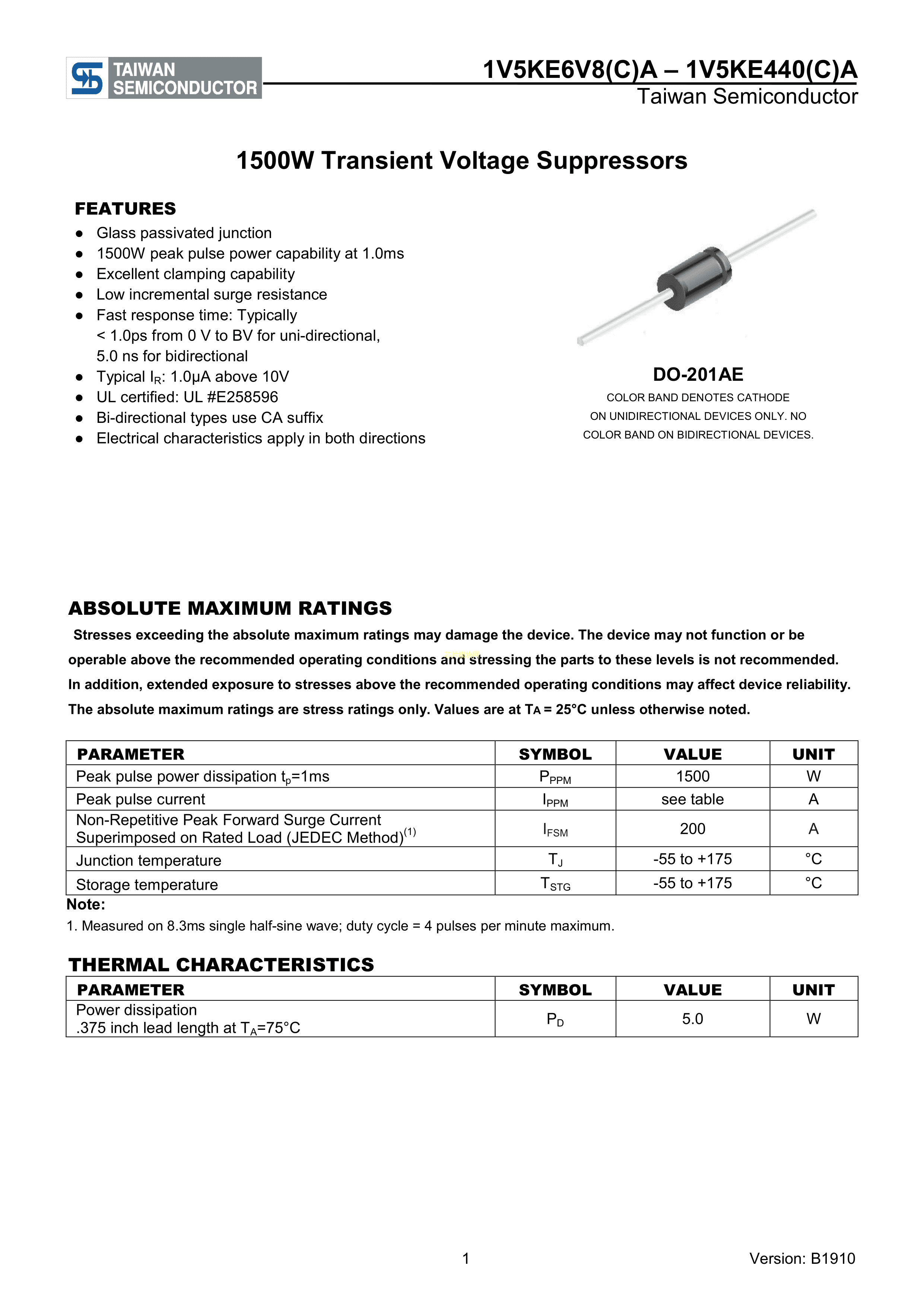 1V5KE200CA数据手册DO-201AD封装TaiwanSemiconductor(台湾半导体)
