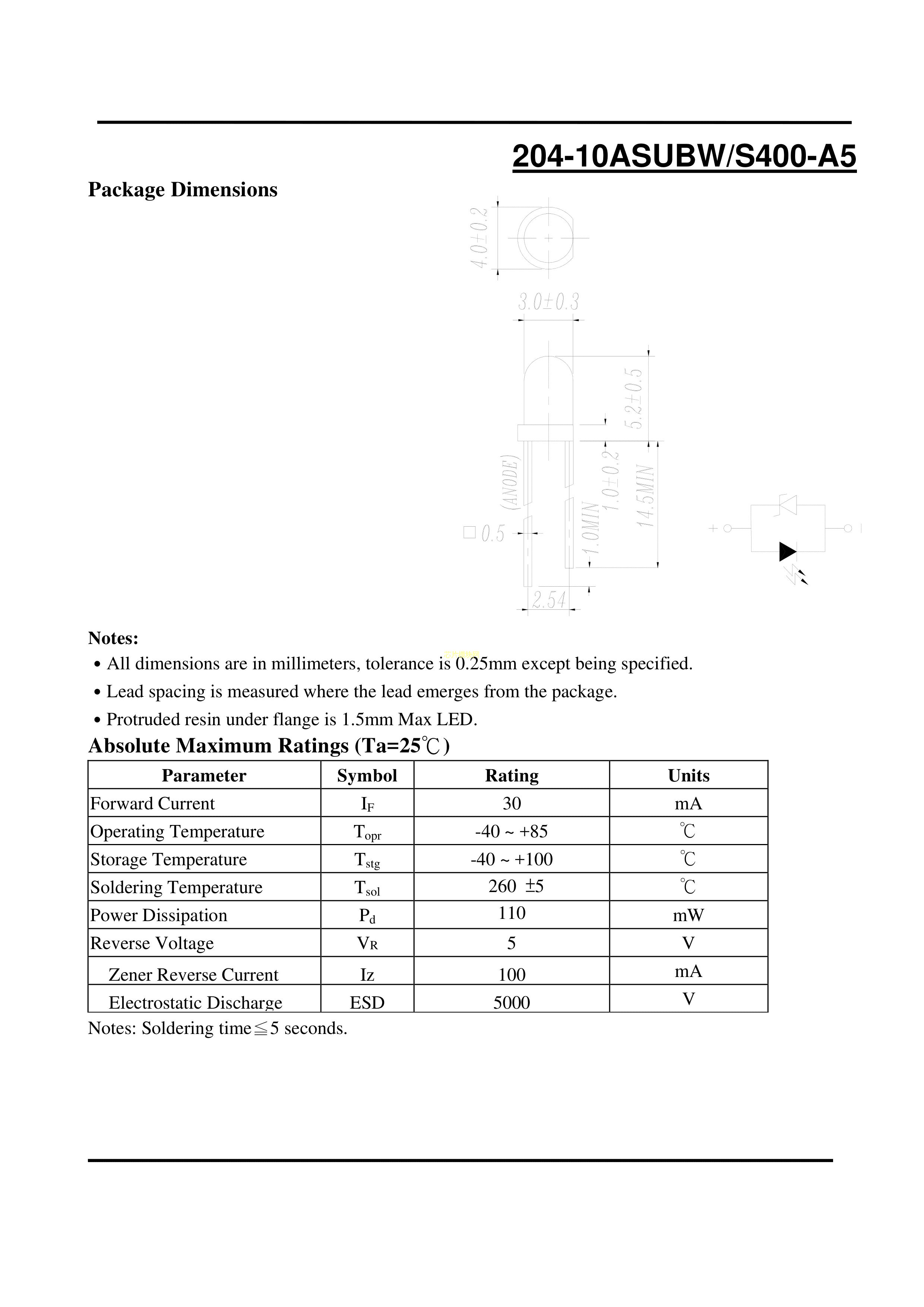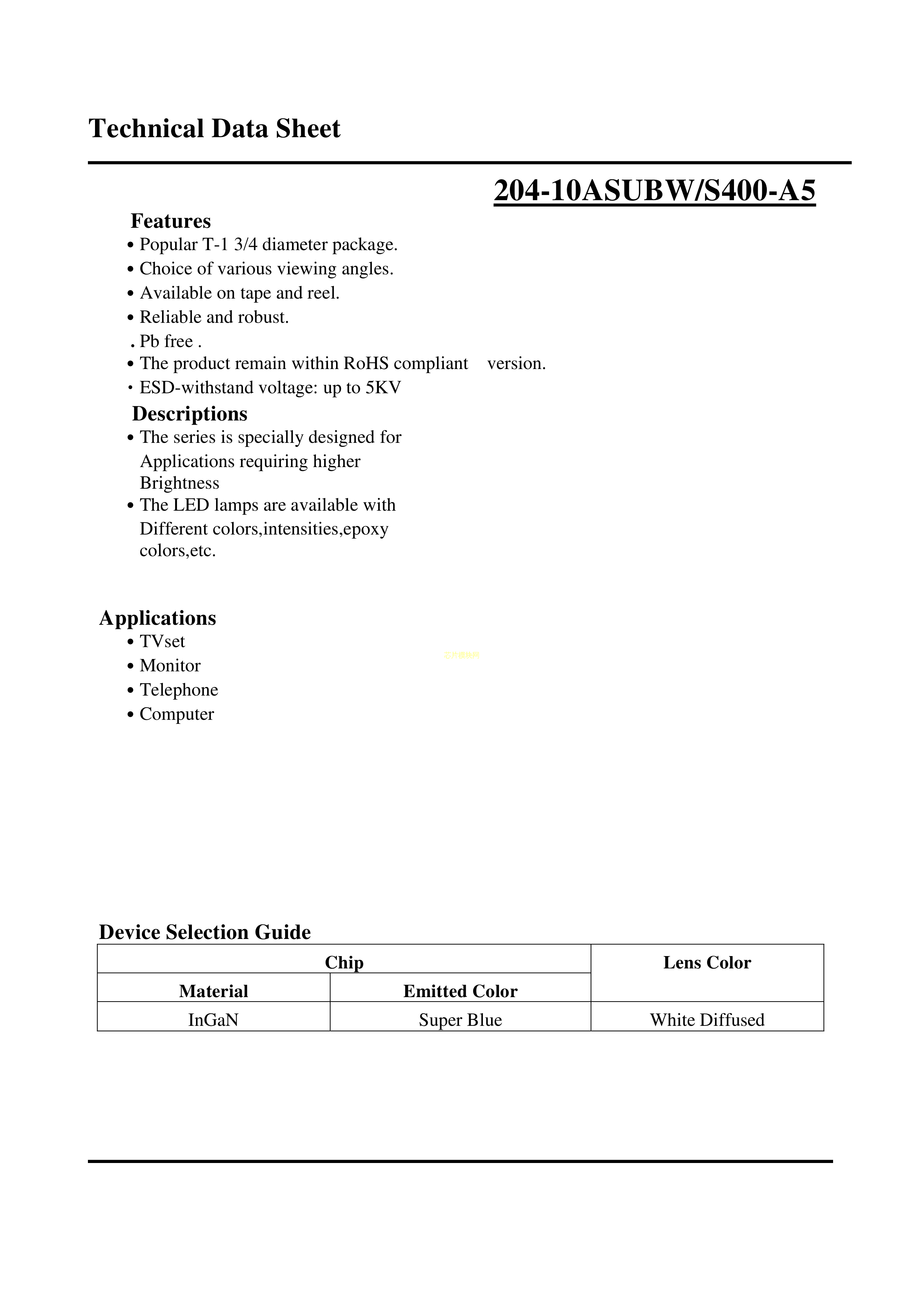 204-10ASUBW-S400-A5数据手册插件封装EVERLIGHT(台湾亿光)PDF规格书,中