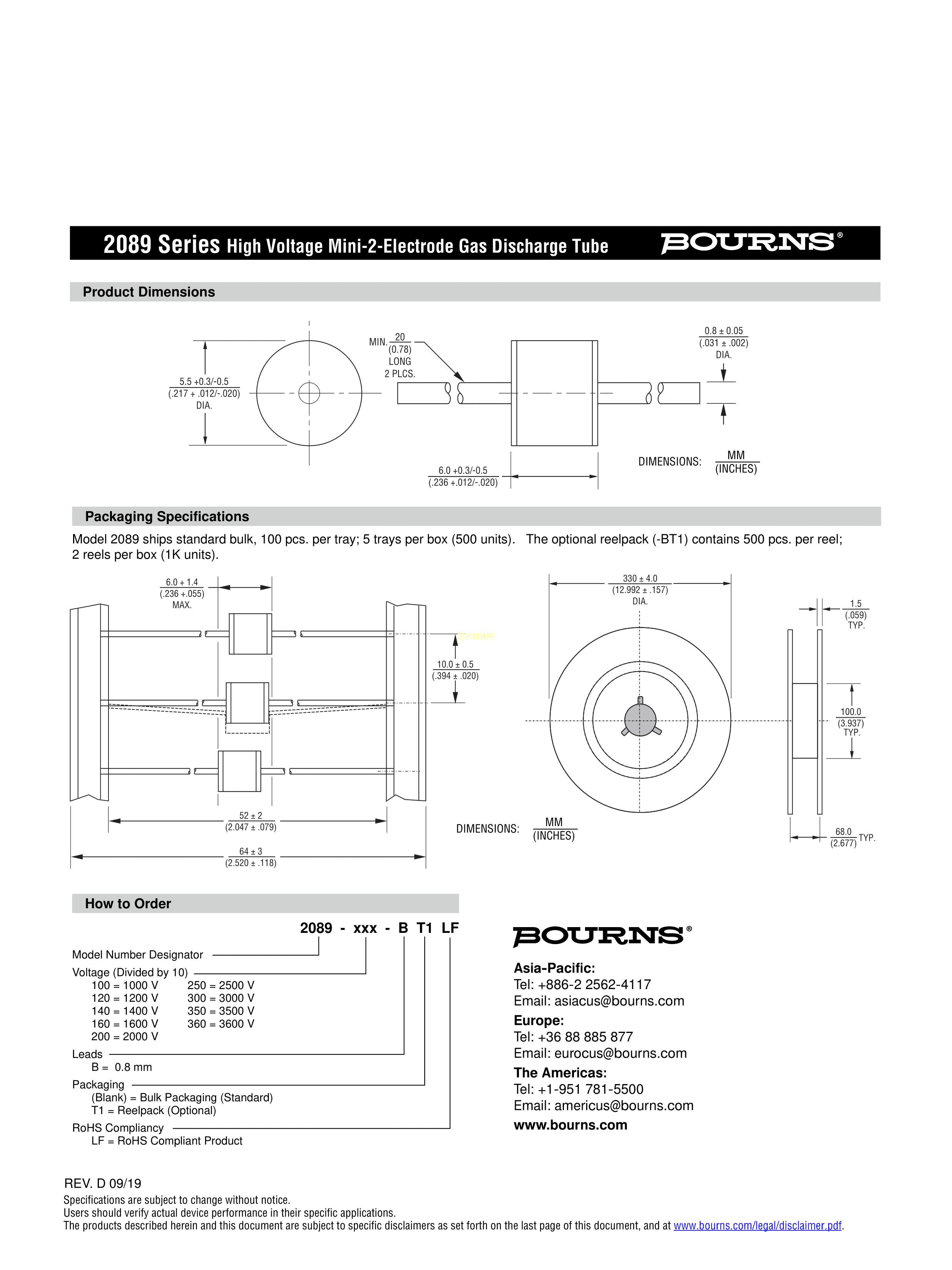 2089-300-BT1LF数据手册轴向引线封装BOURNSPDF规格书,中英文下载