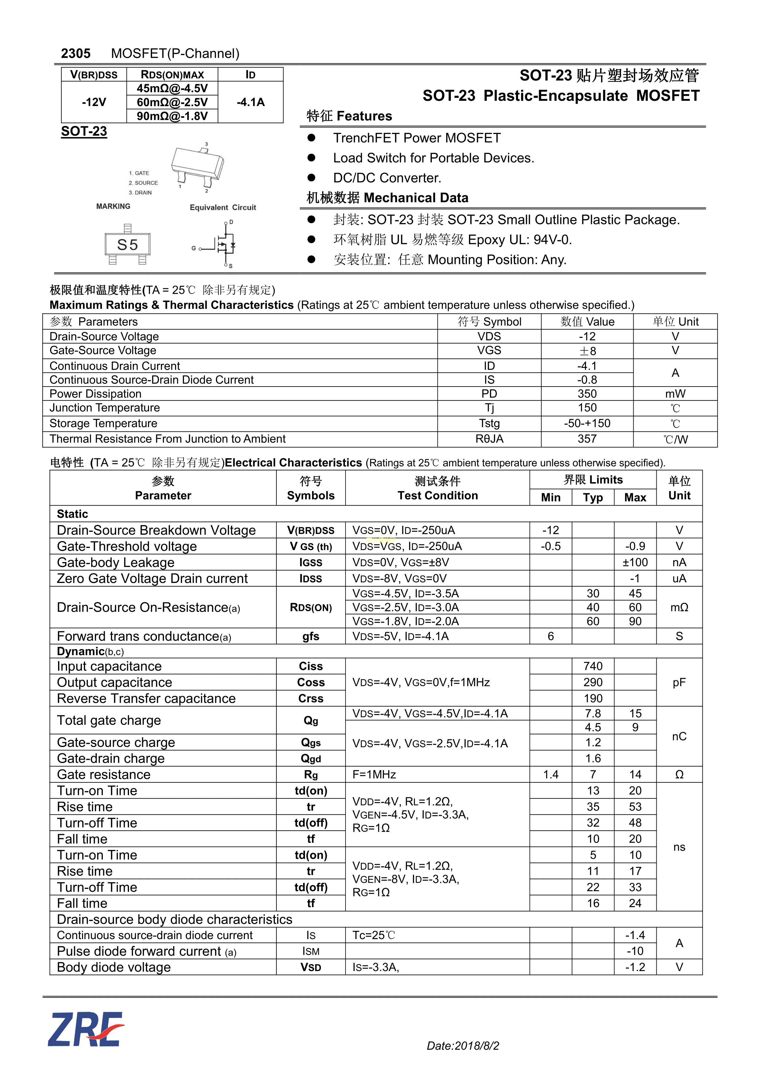 2305数据手册SOT-23封装ZRE(治润)PDF规格书,中英文下载