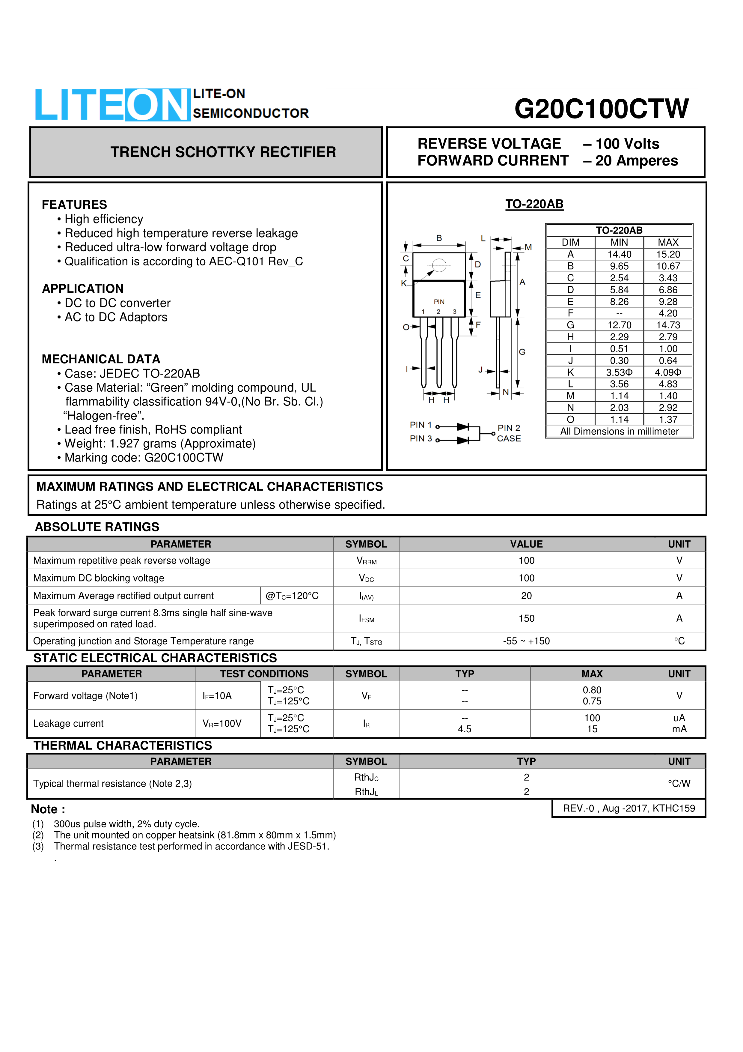 G20C100CTW数据手册TO-220AB封装LITEON(台湾敦南)PDF规格书,中英文下载