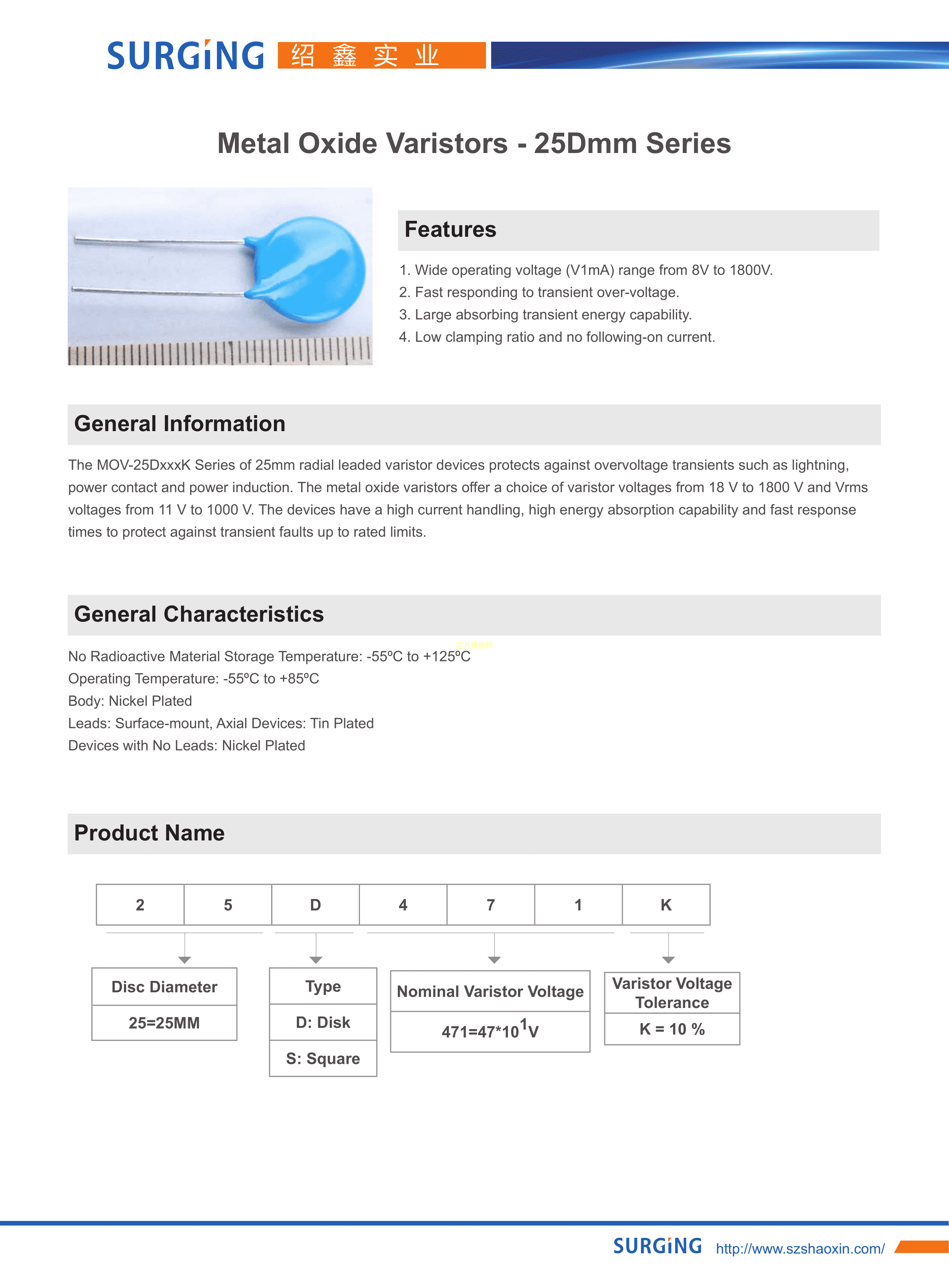25D511K数据手册径向引线P10mm封装SURGING(绍鑫)PDF规格书,中英文下载