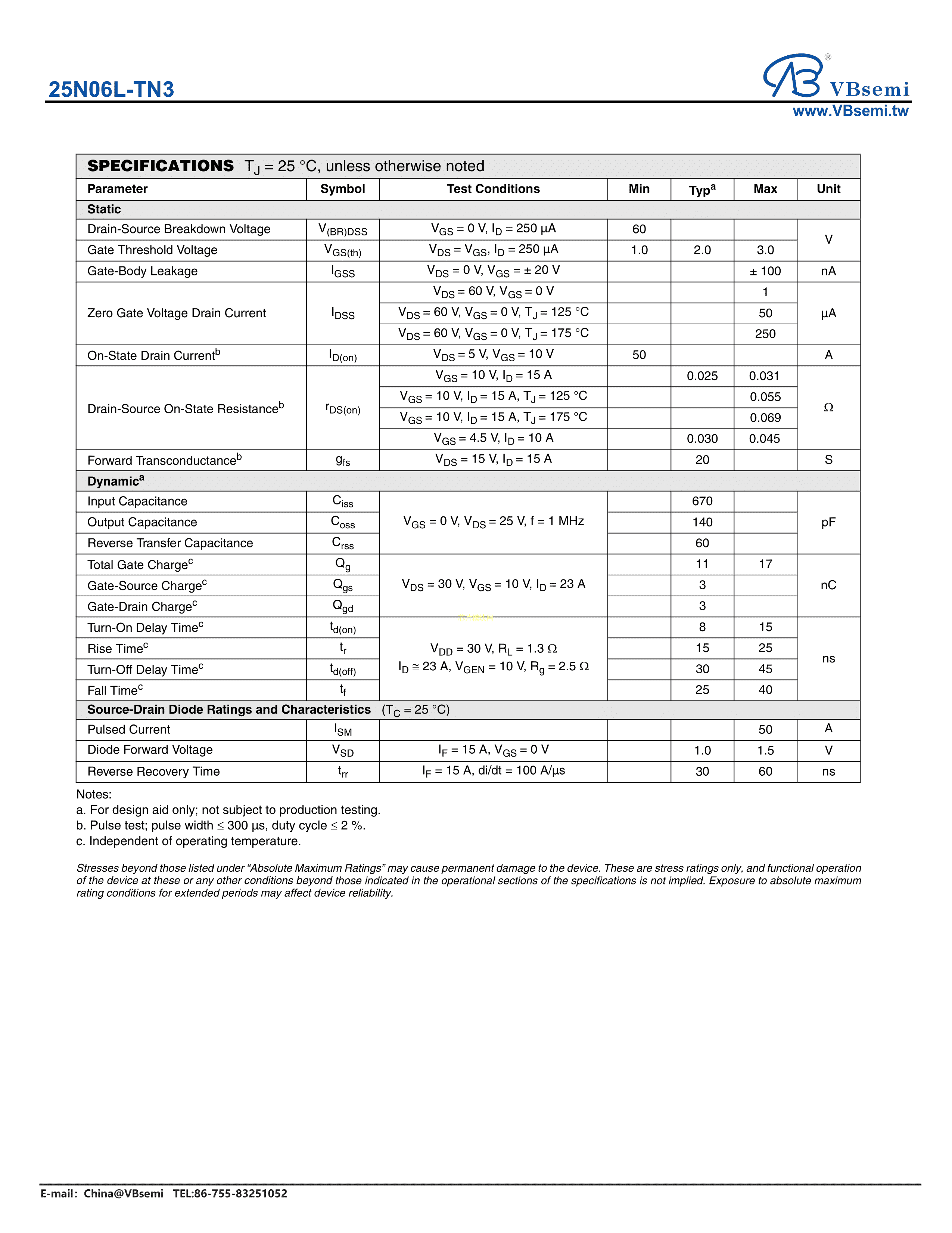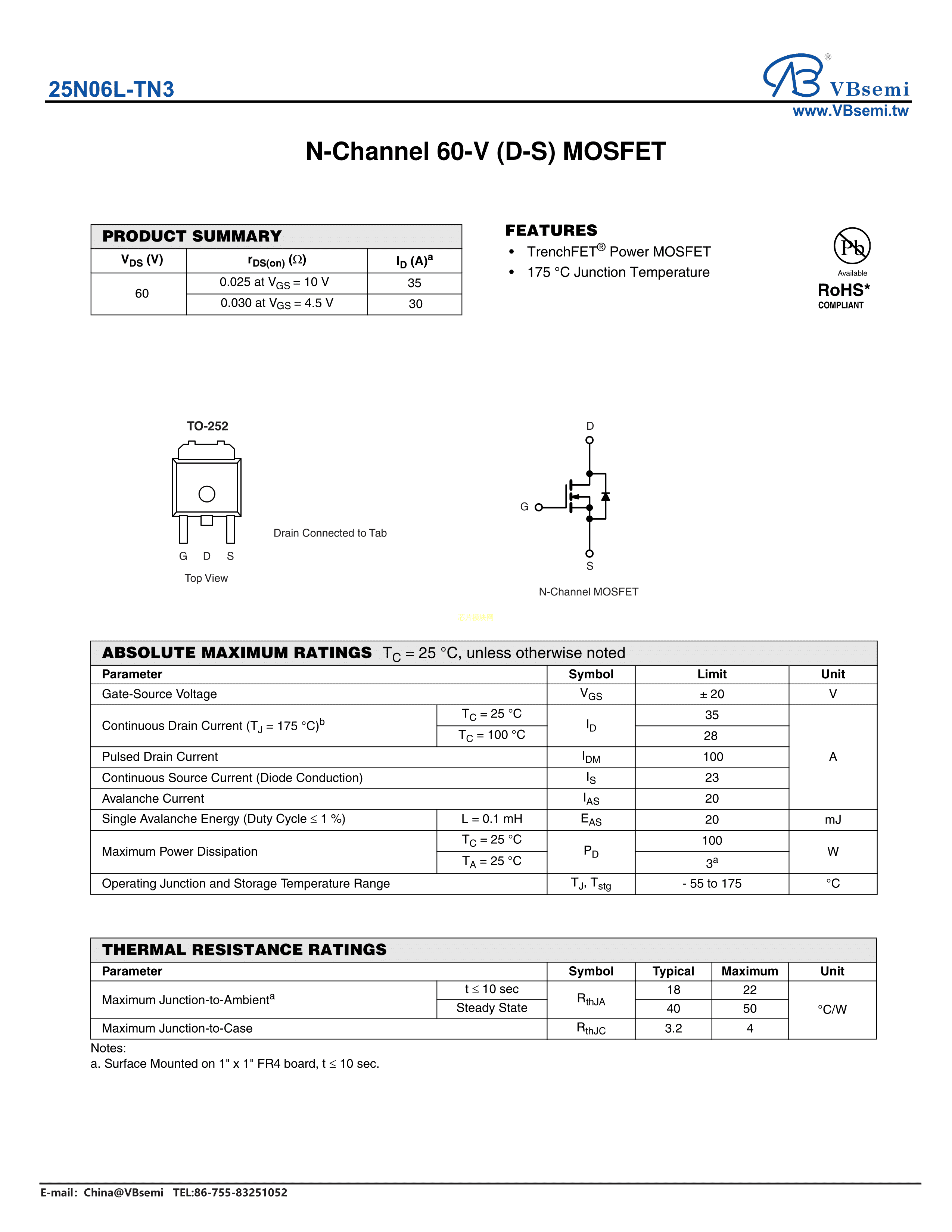 25N06L-TN3数据手册TO-252封装VBsemi(台湾微碧)PDF规格书,中英文下载