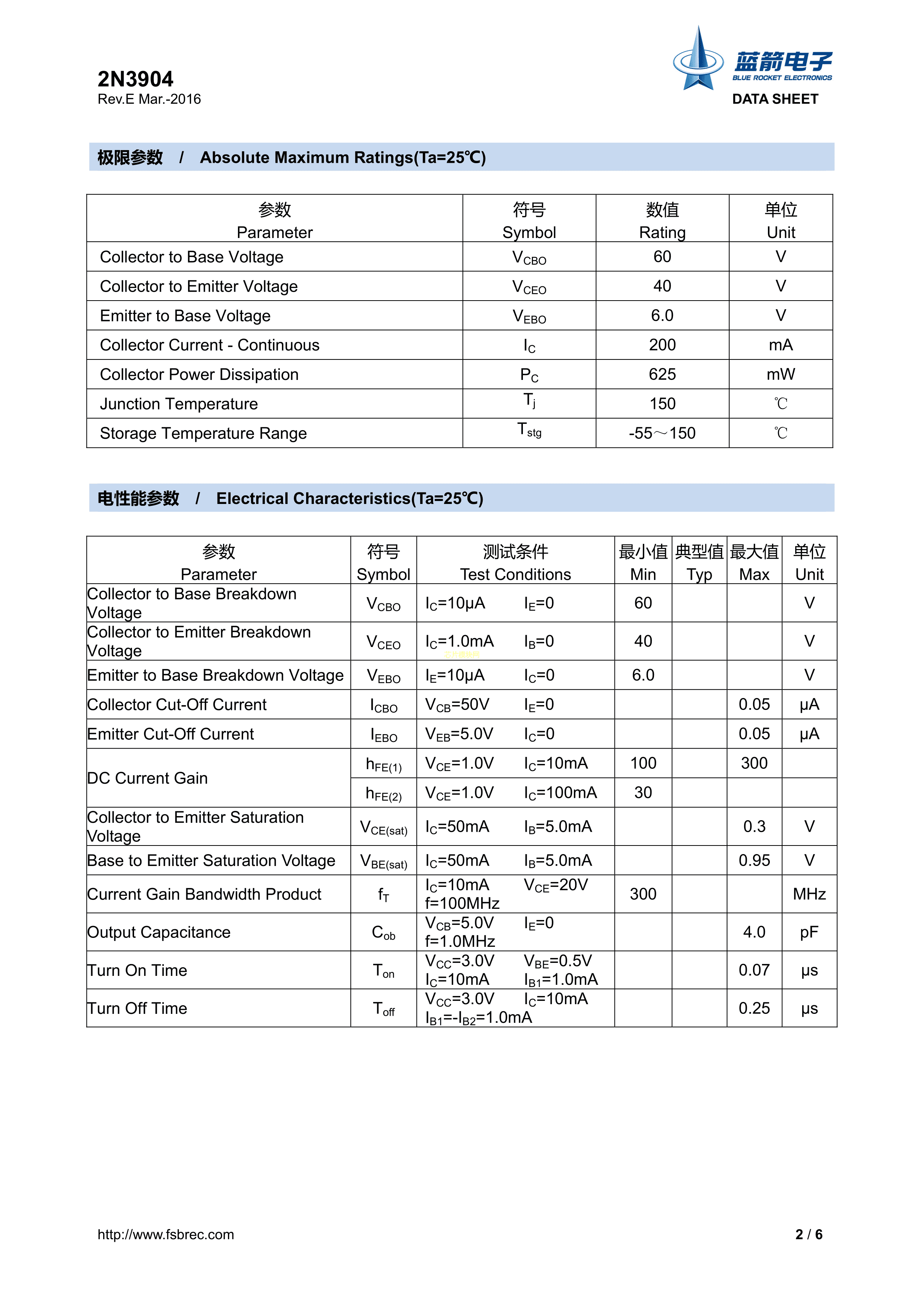 2N3904数据手册TO-92封装BLUEROCKET(蓝箭)PDF规格书,中英文下载