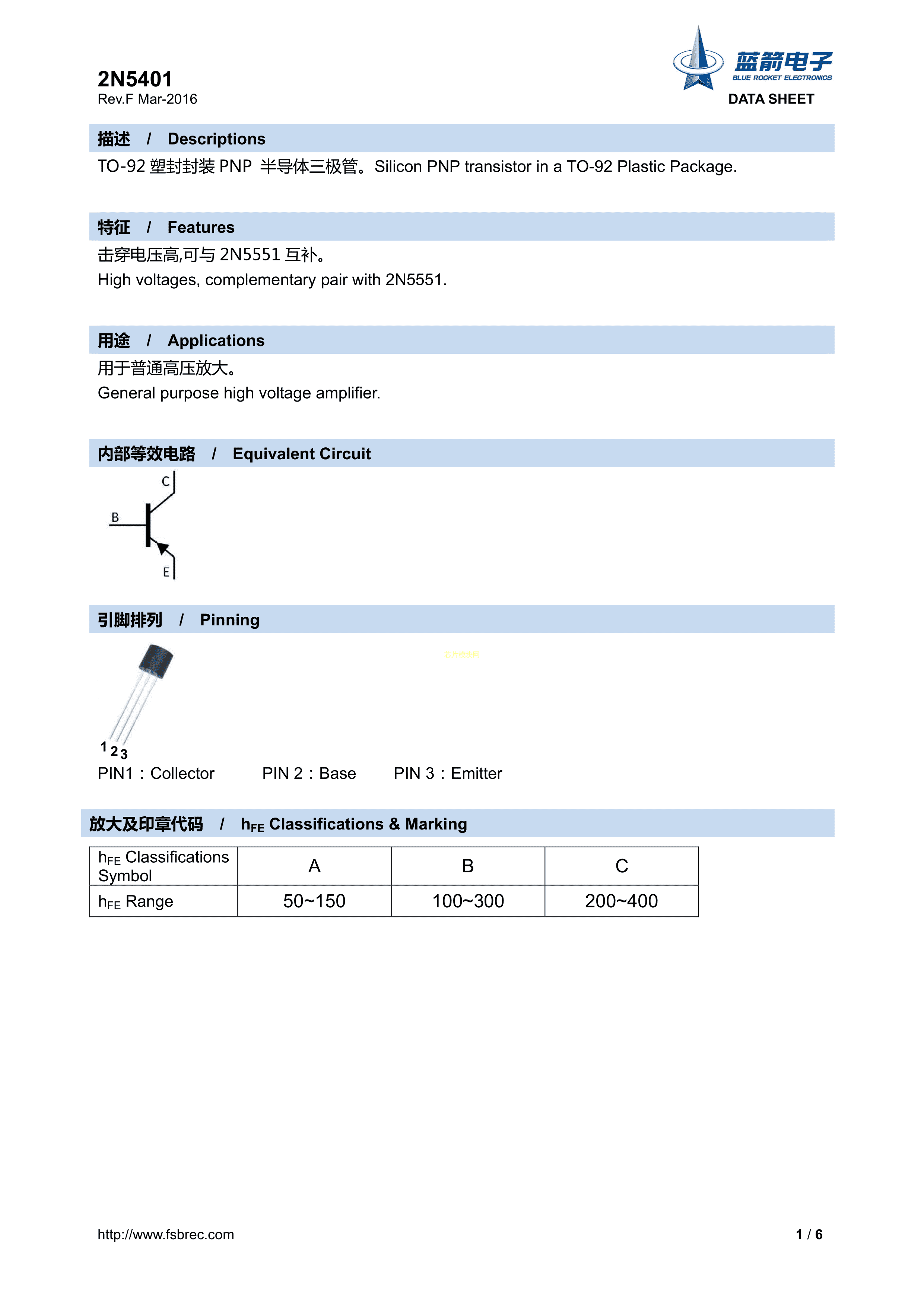 2N5401-B数据手册TO-92封装BLUEROCKET(蓝箭)PDF规格书,中英文下载