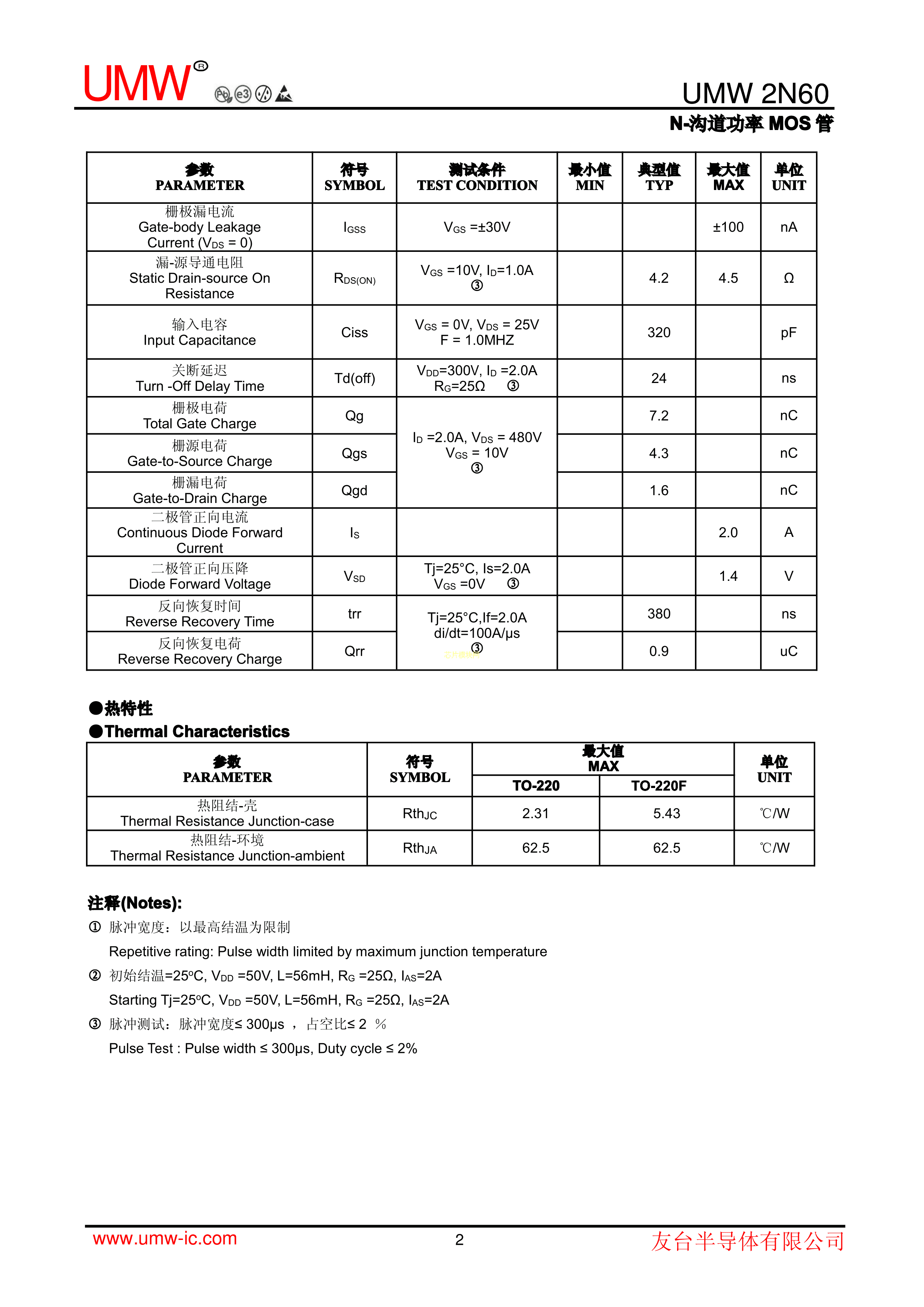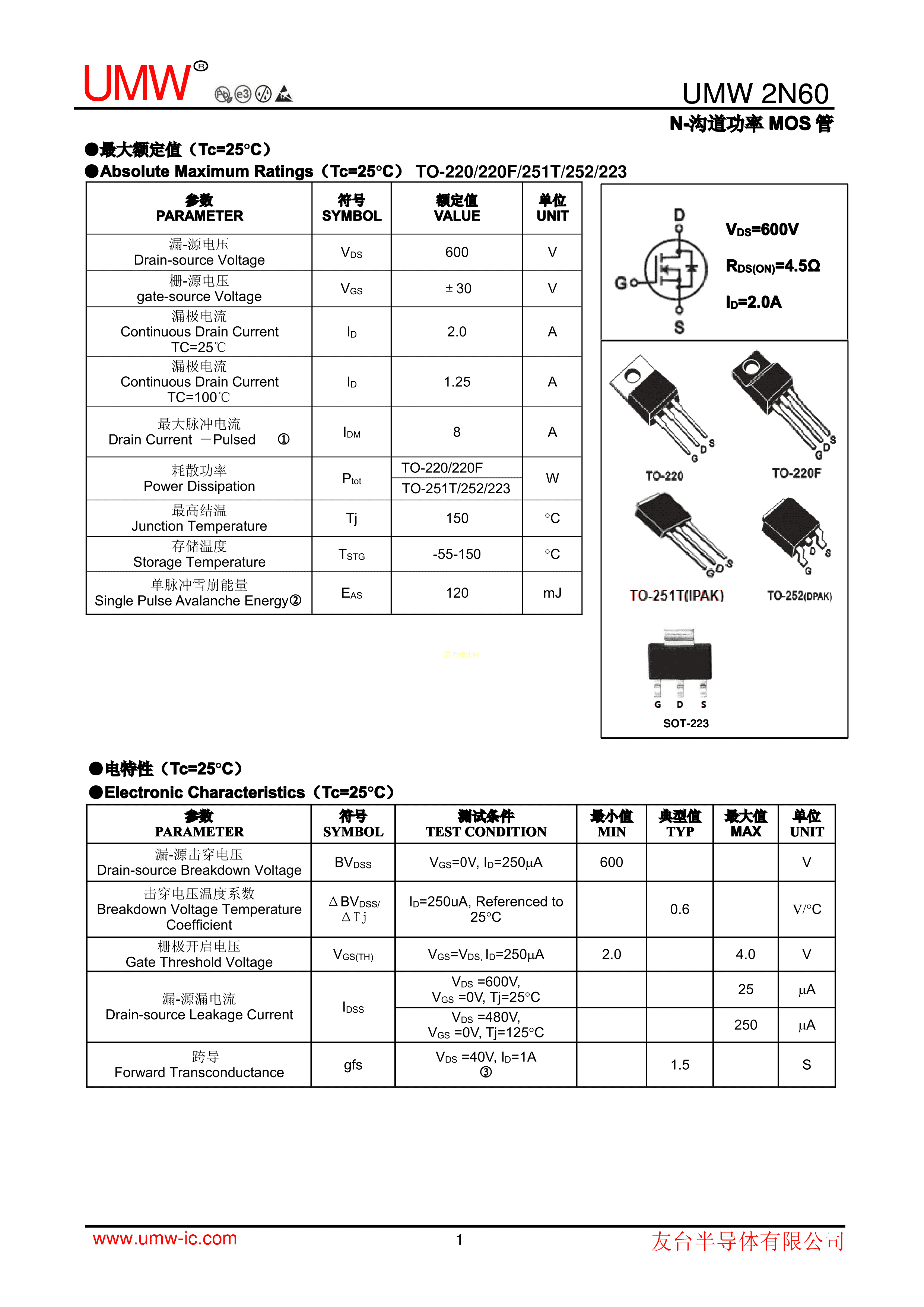 2N60G数据手册SOT-223封装UMW(友台半导体)PDF规格书,中英文下载