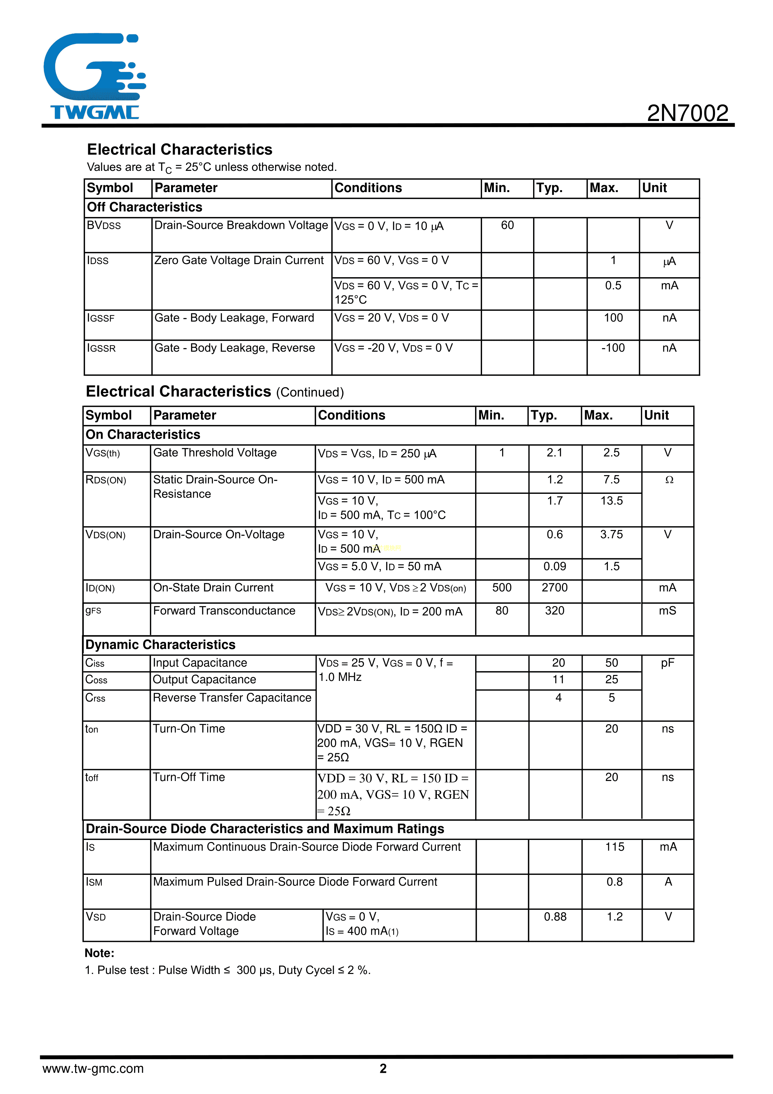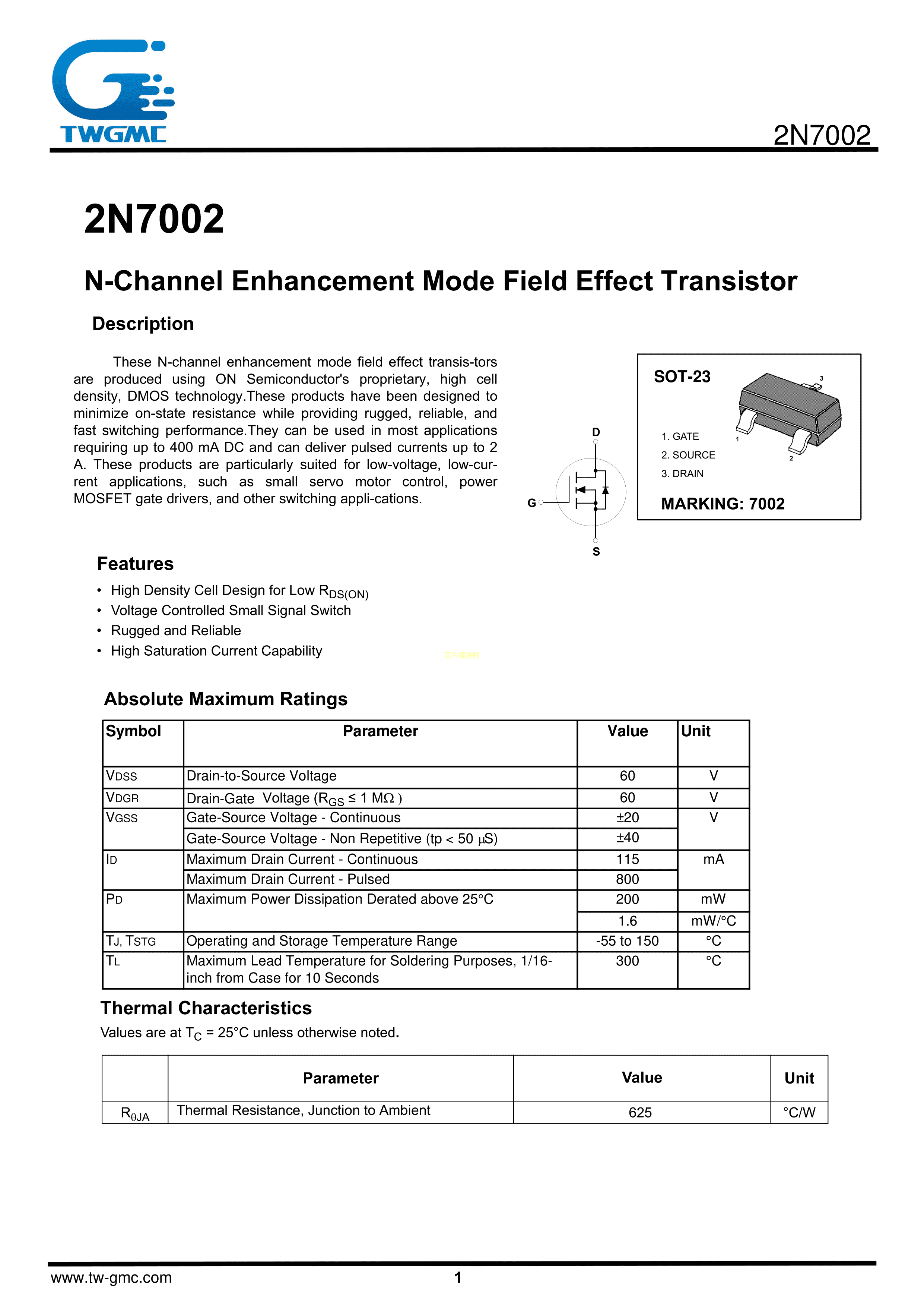 2N7002数据手册SOT-23封装TWGMC(台湾迪嘉)PDF规格书,中英文下载