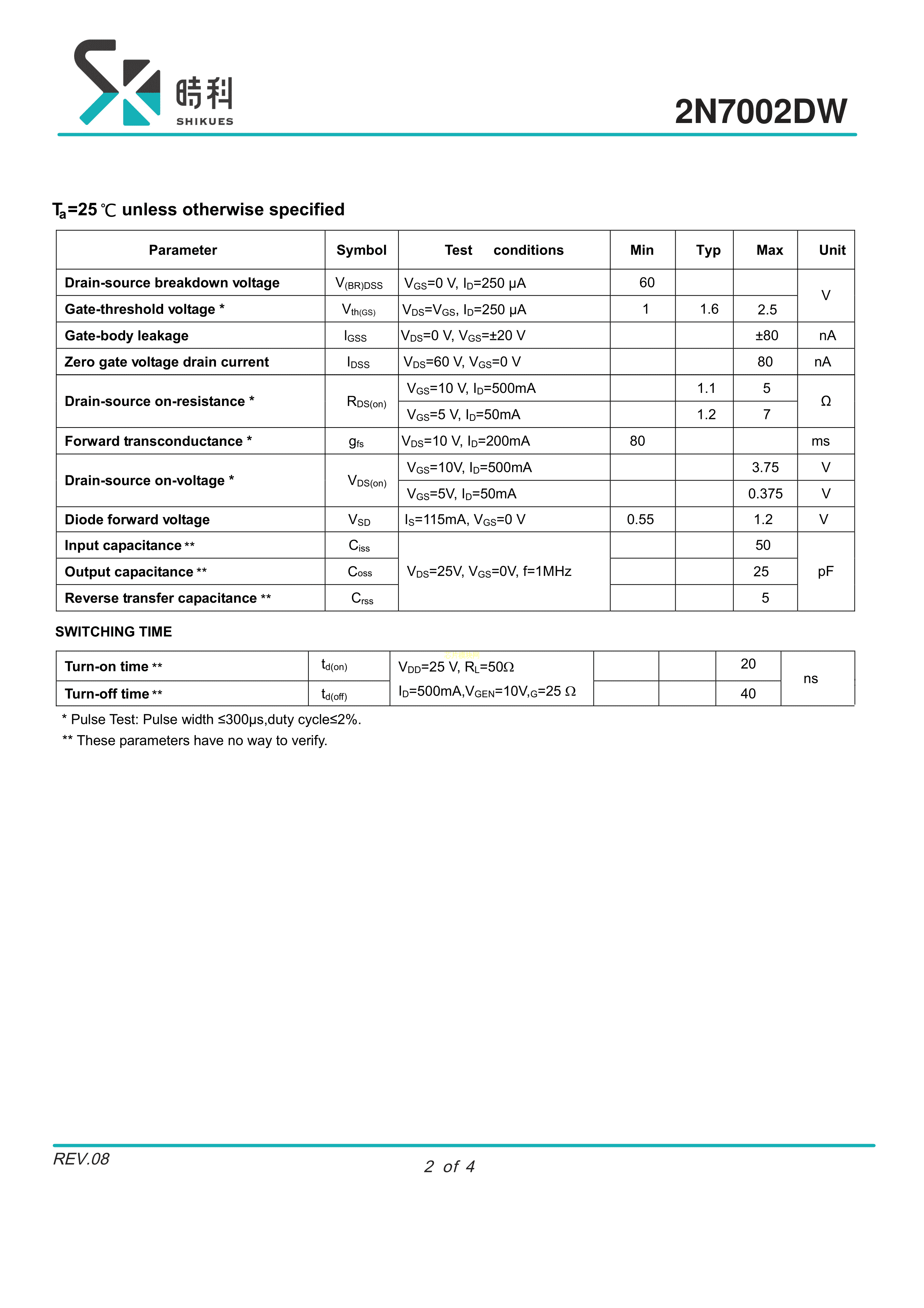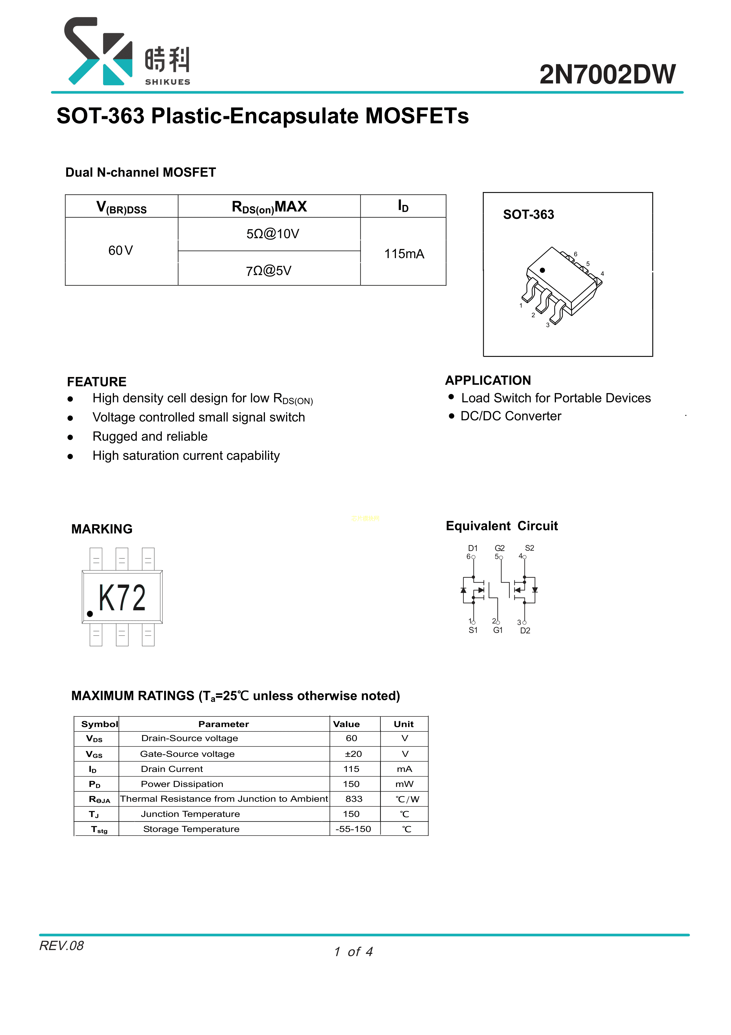 2N7002DW数据手册SOT-363封装SHIKUES(时科)PDF规格书,中英文下载