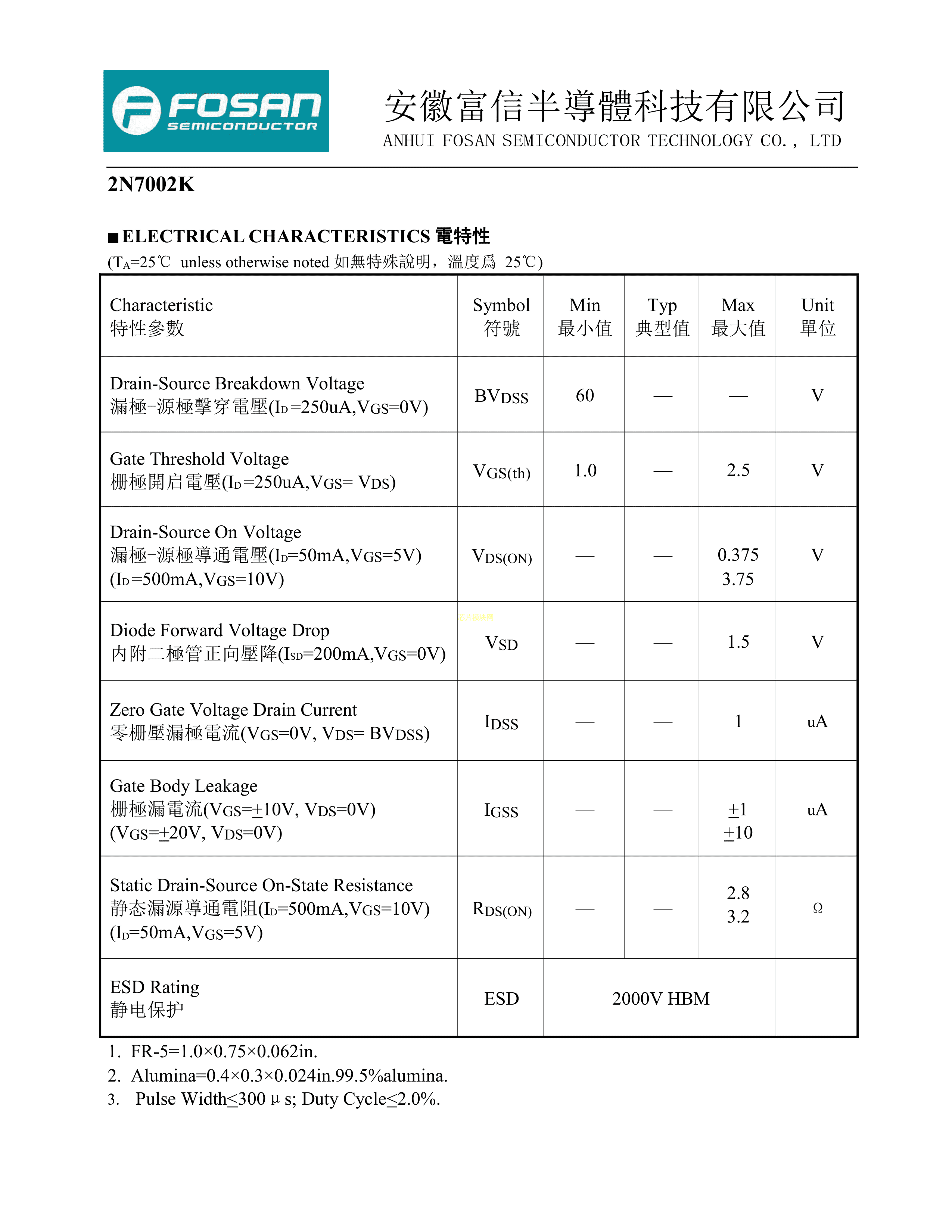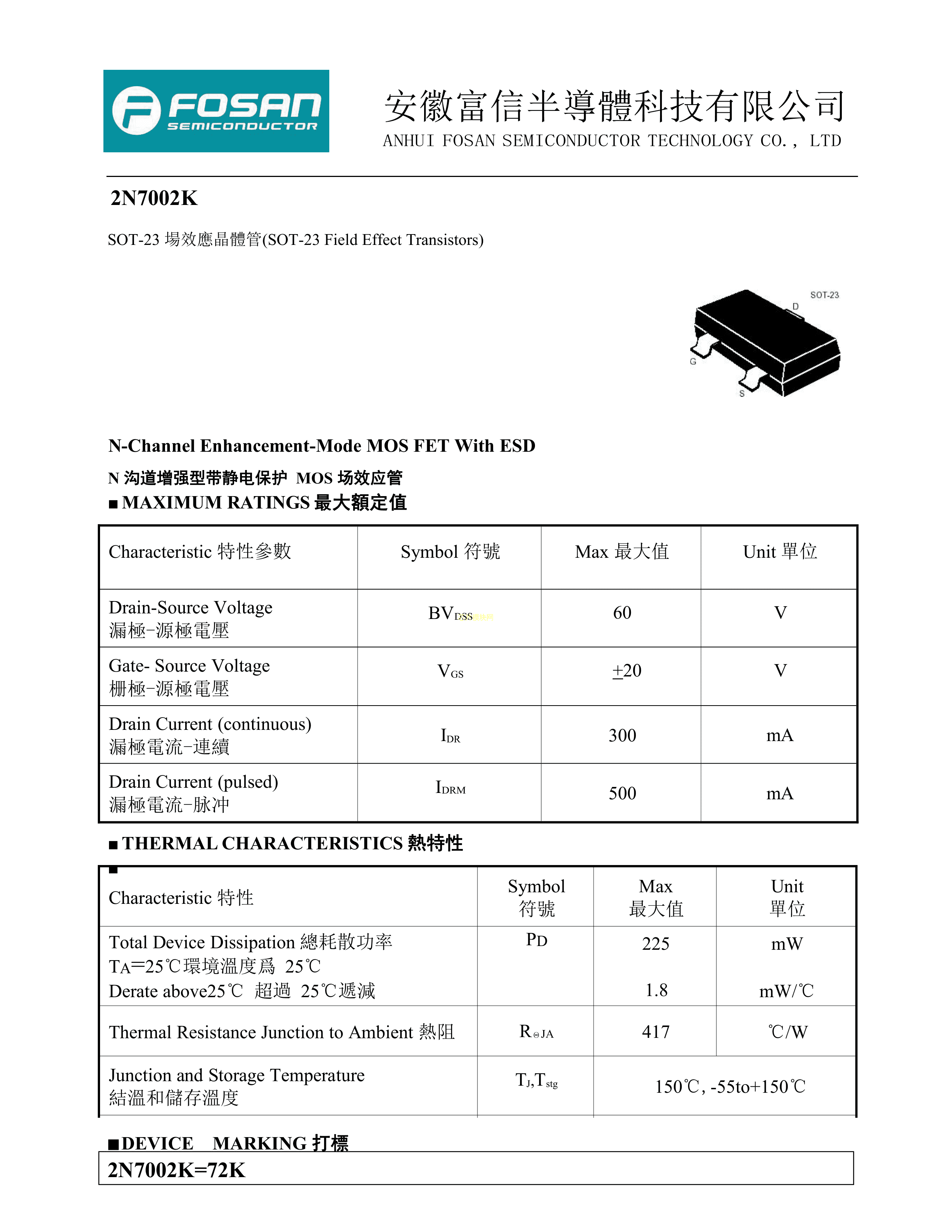 2N7002K72K数据手册SOT-23封装FOSAN(富信)PDF规格书,中英文下载