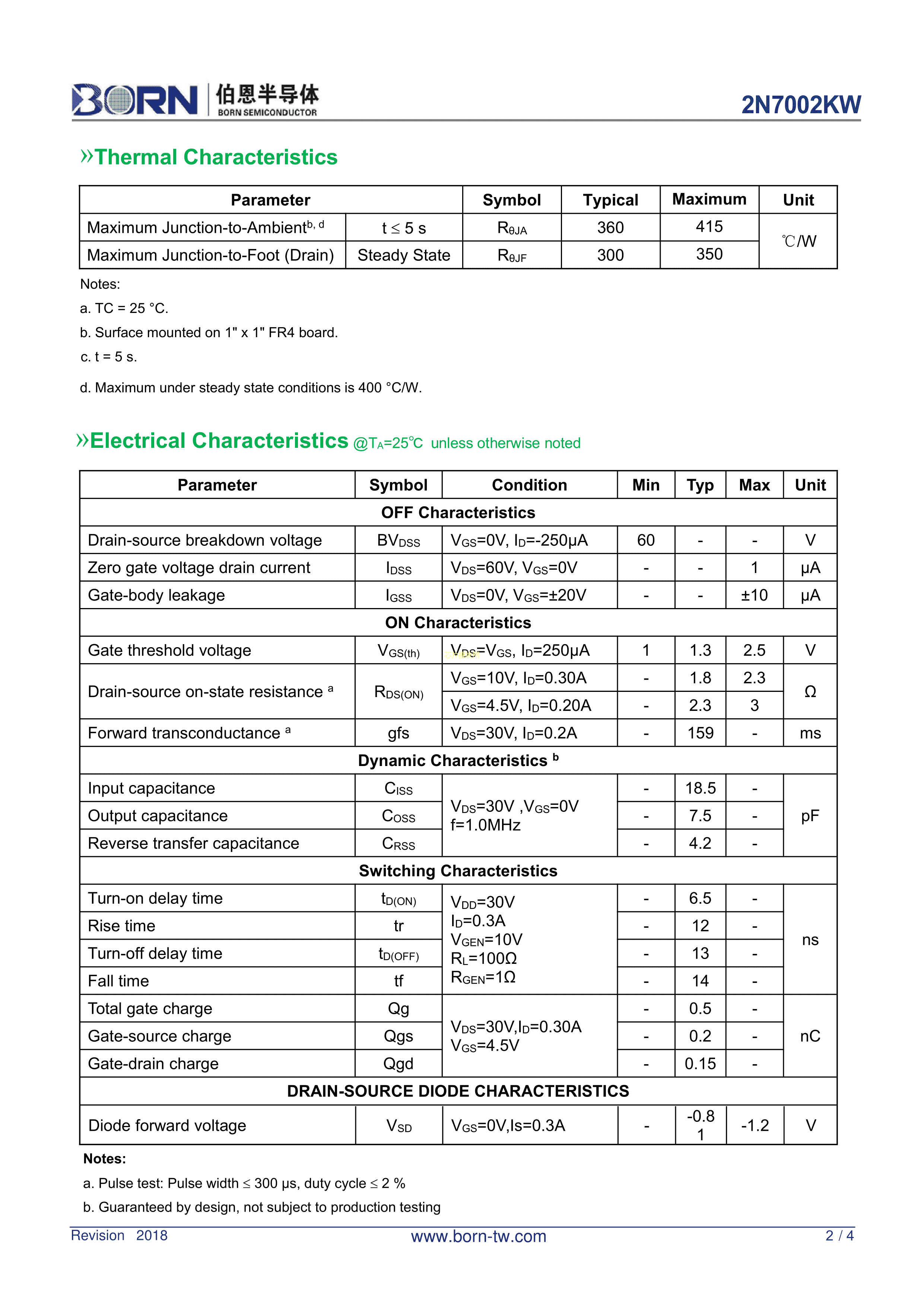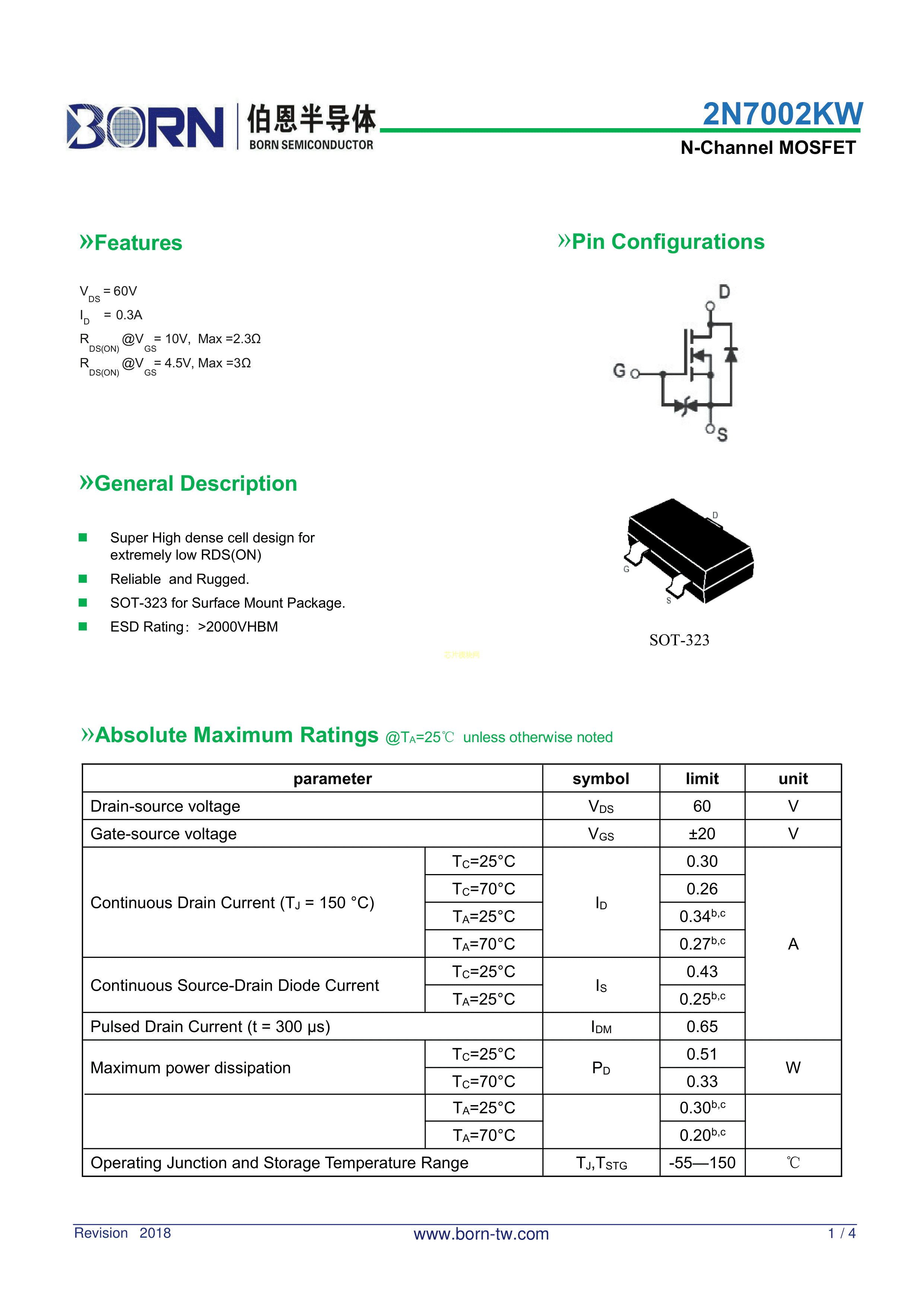 2N7002KW数据手册SOT-323封装BORN(伯恩半导体)PDF规格书,中英文下载