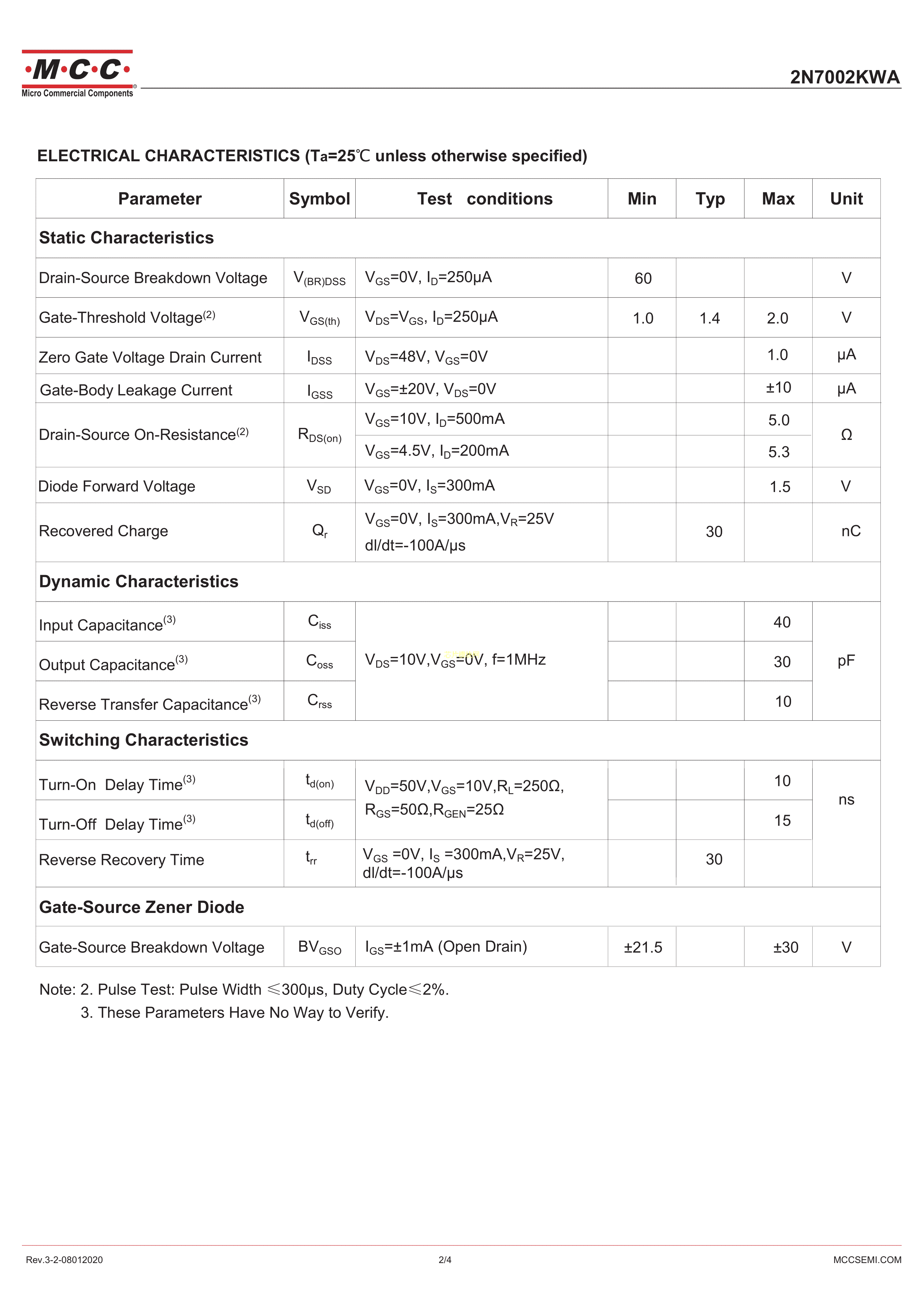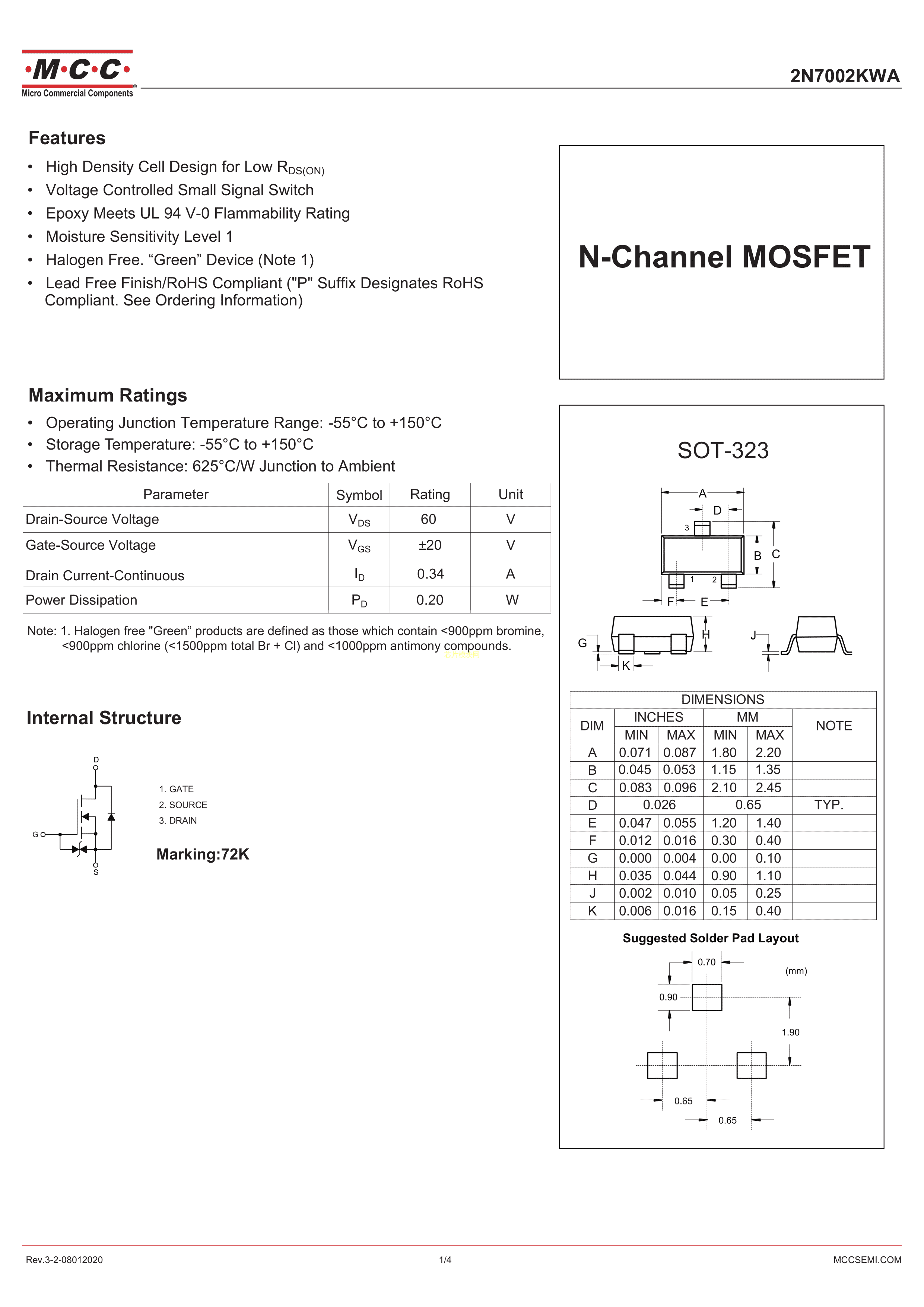 2N7002KWA-TP数据手册SOT-323封装MCC(美微科)PDF规格书,中英文下载