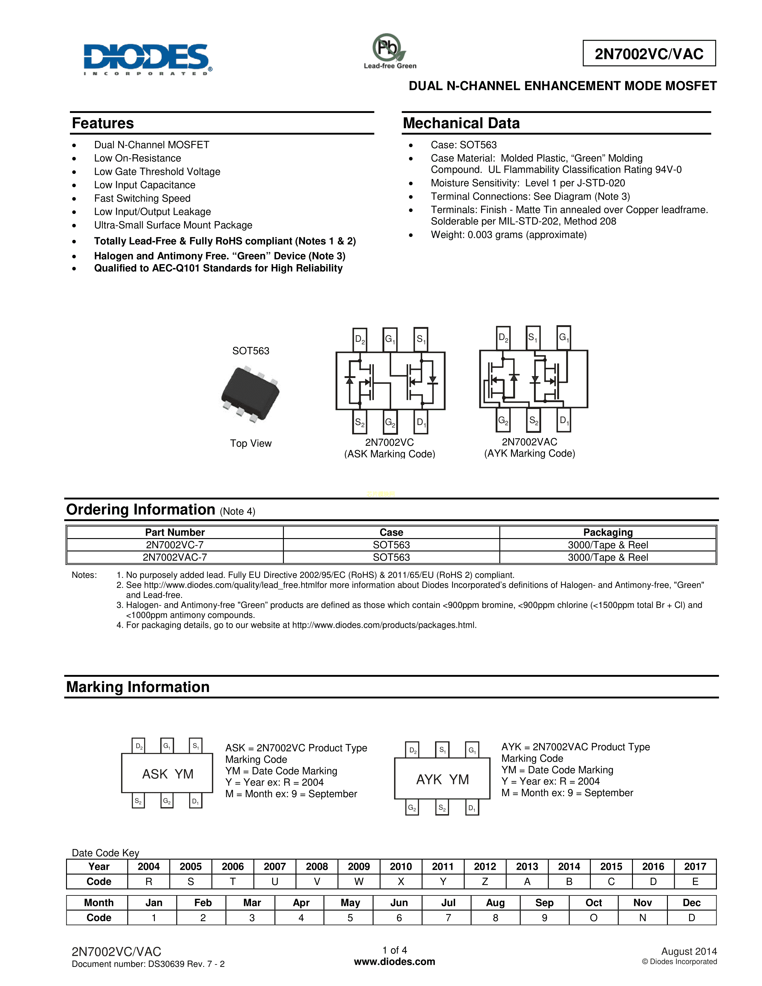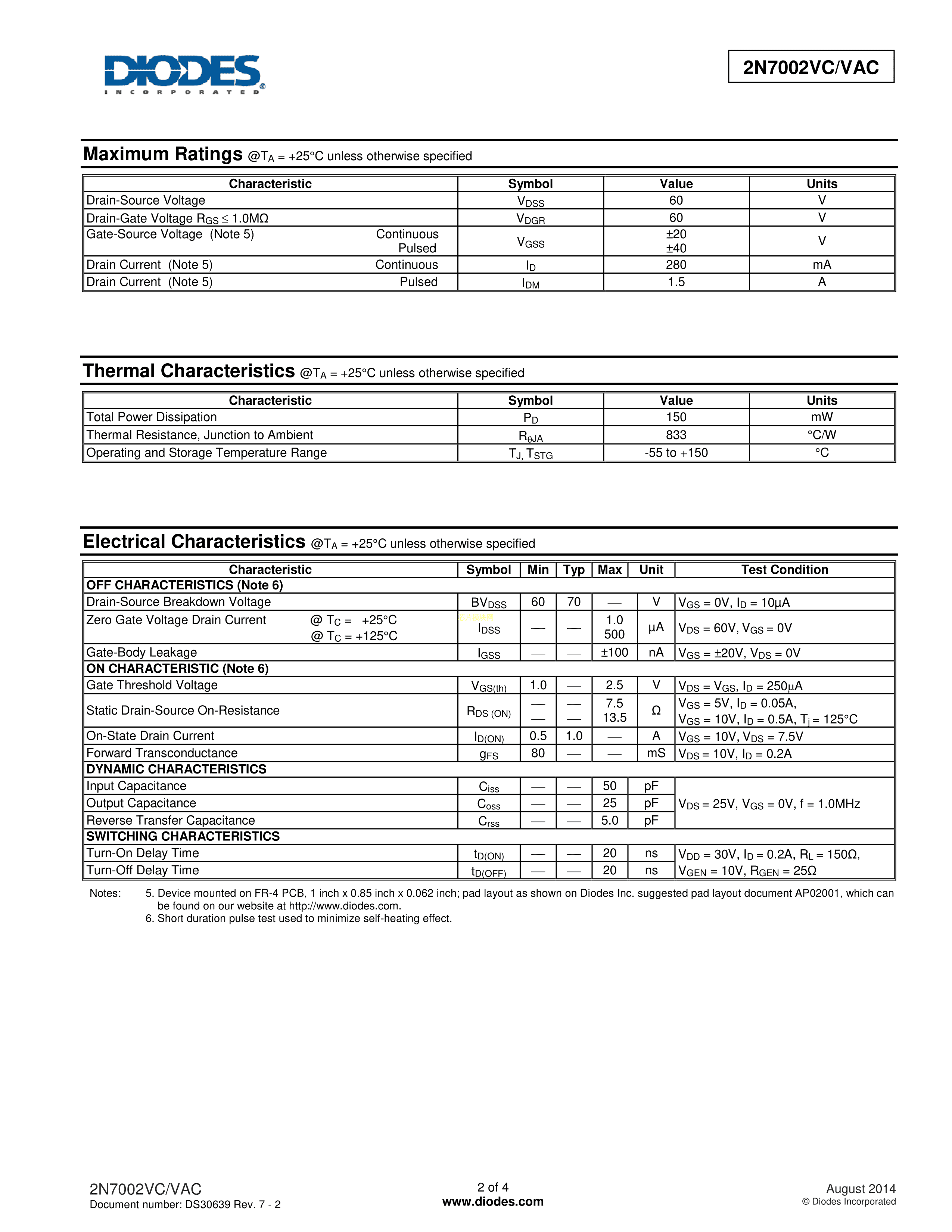 2N7002VC-7数据手册SOT-563封装DIODES(美台)PDF规格书,中英文下载