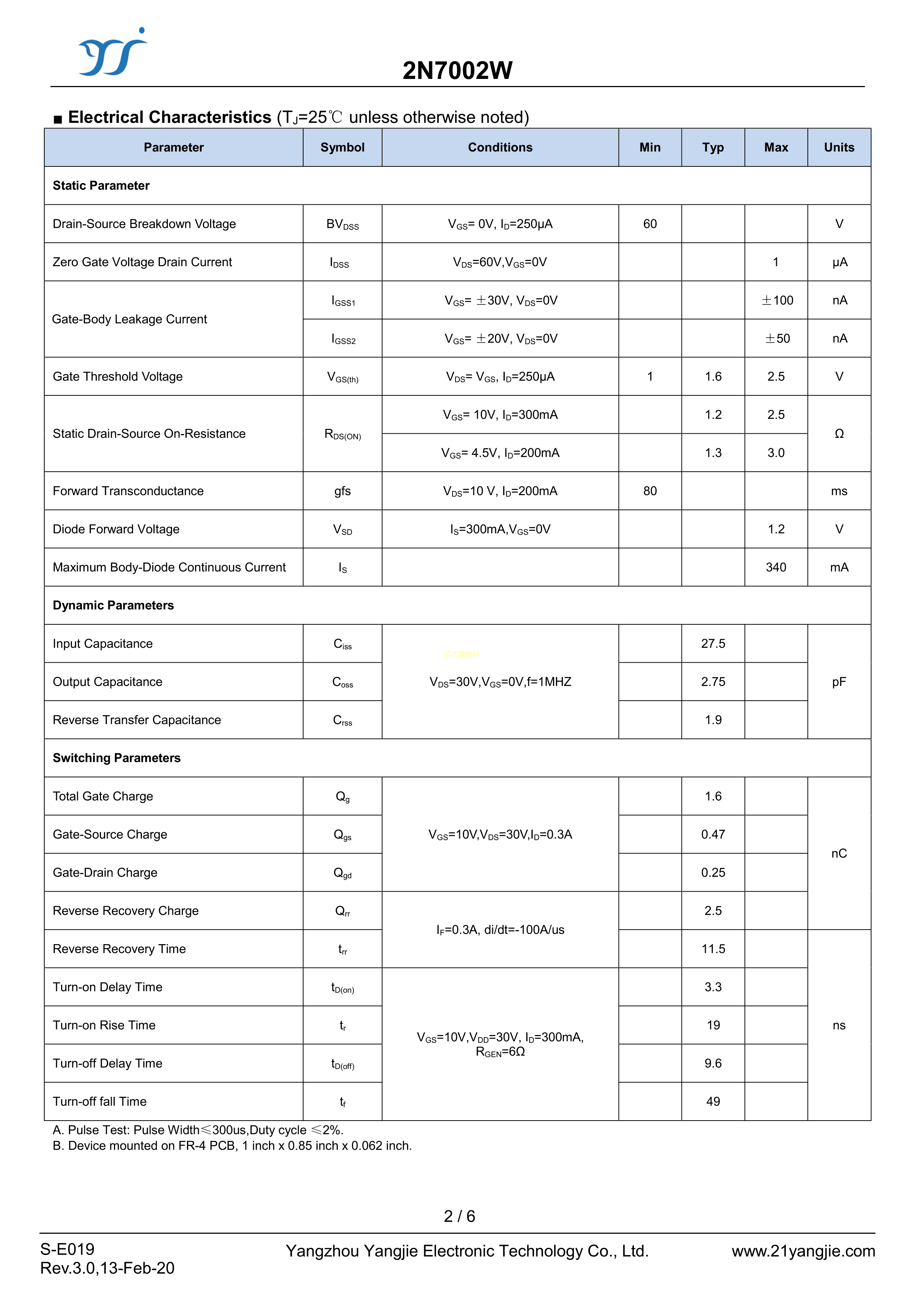 2N7002W数据手册SOT-323封装YANGJIE(扬杰)PDF规格书,中英文下载