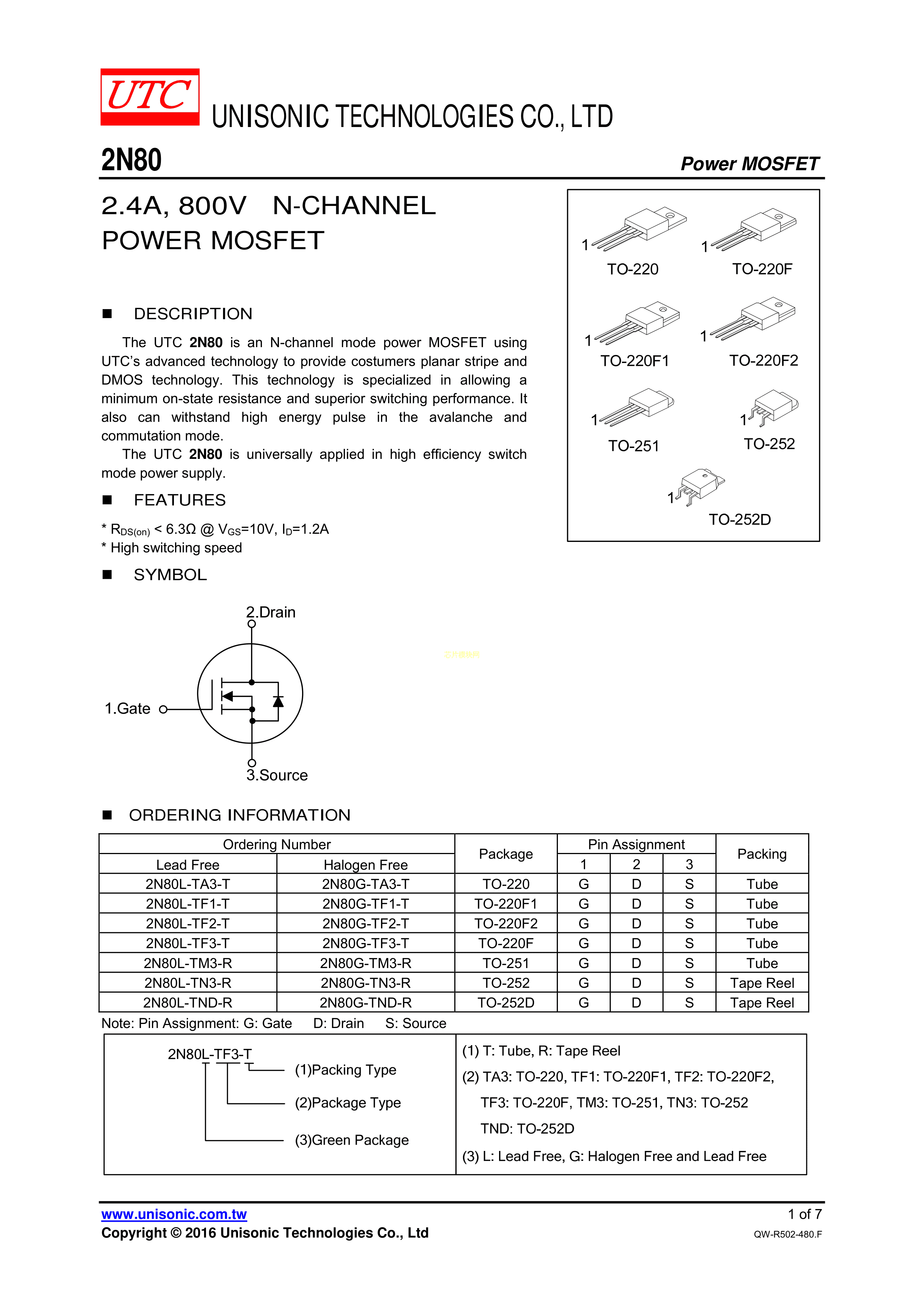 2N80G-TF3-T数据手册T0-220F封装UTC(友顺)PDF规格书,中英文下载