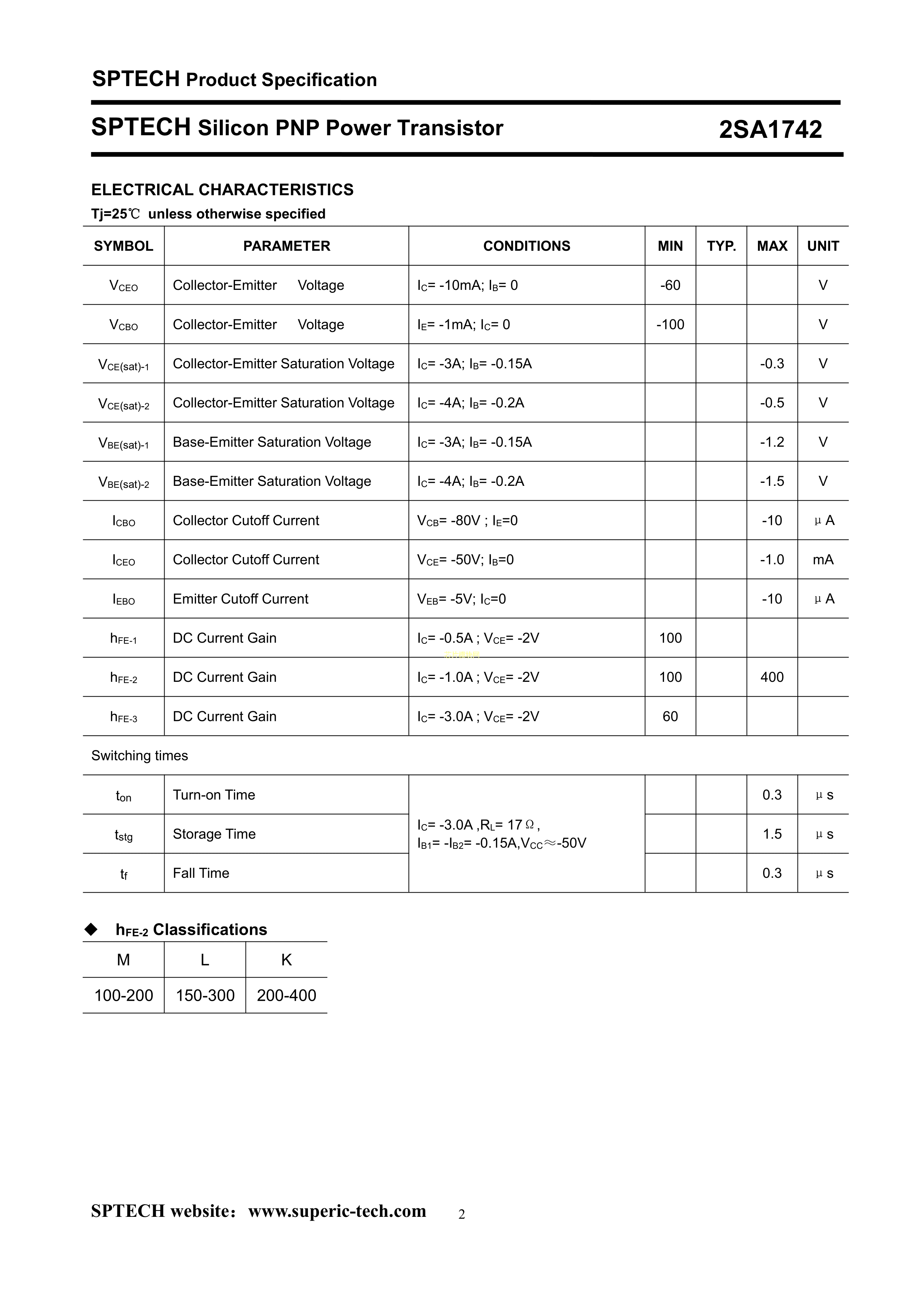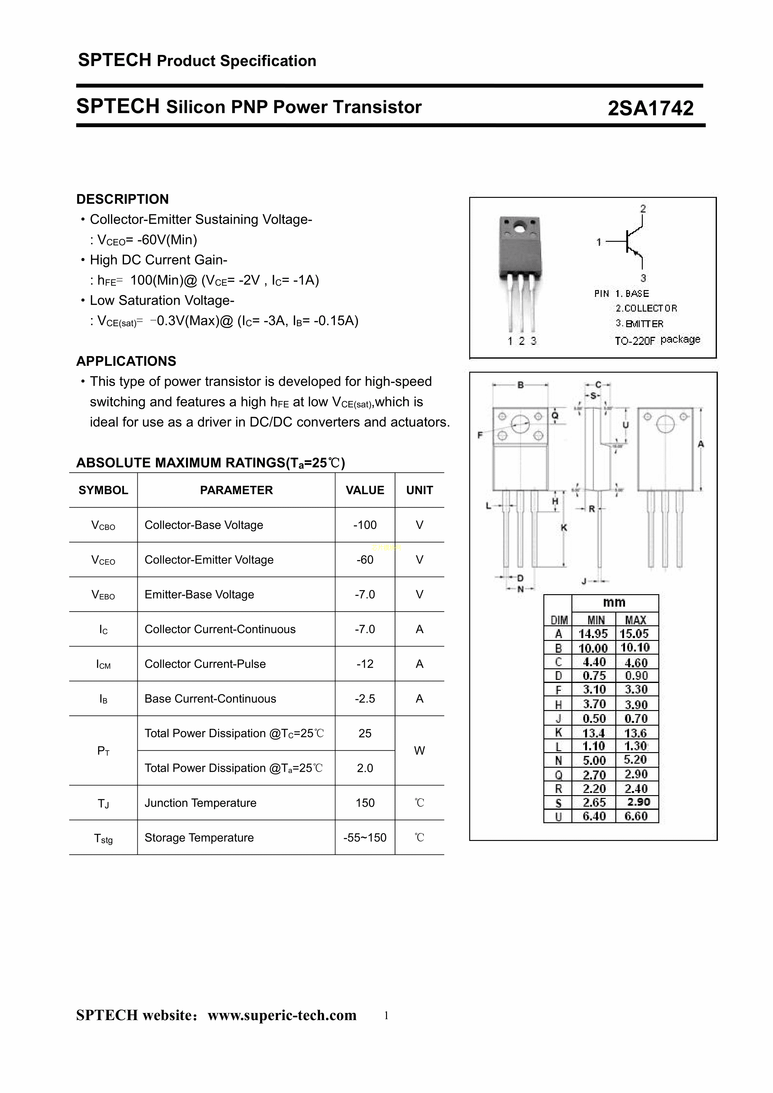 2SA1742数据手册TO-220F封装SPTECH(深圳质超)PDF规格书,中英文下载