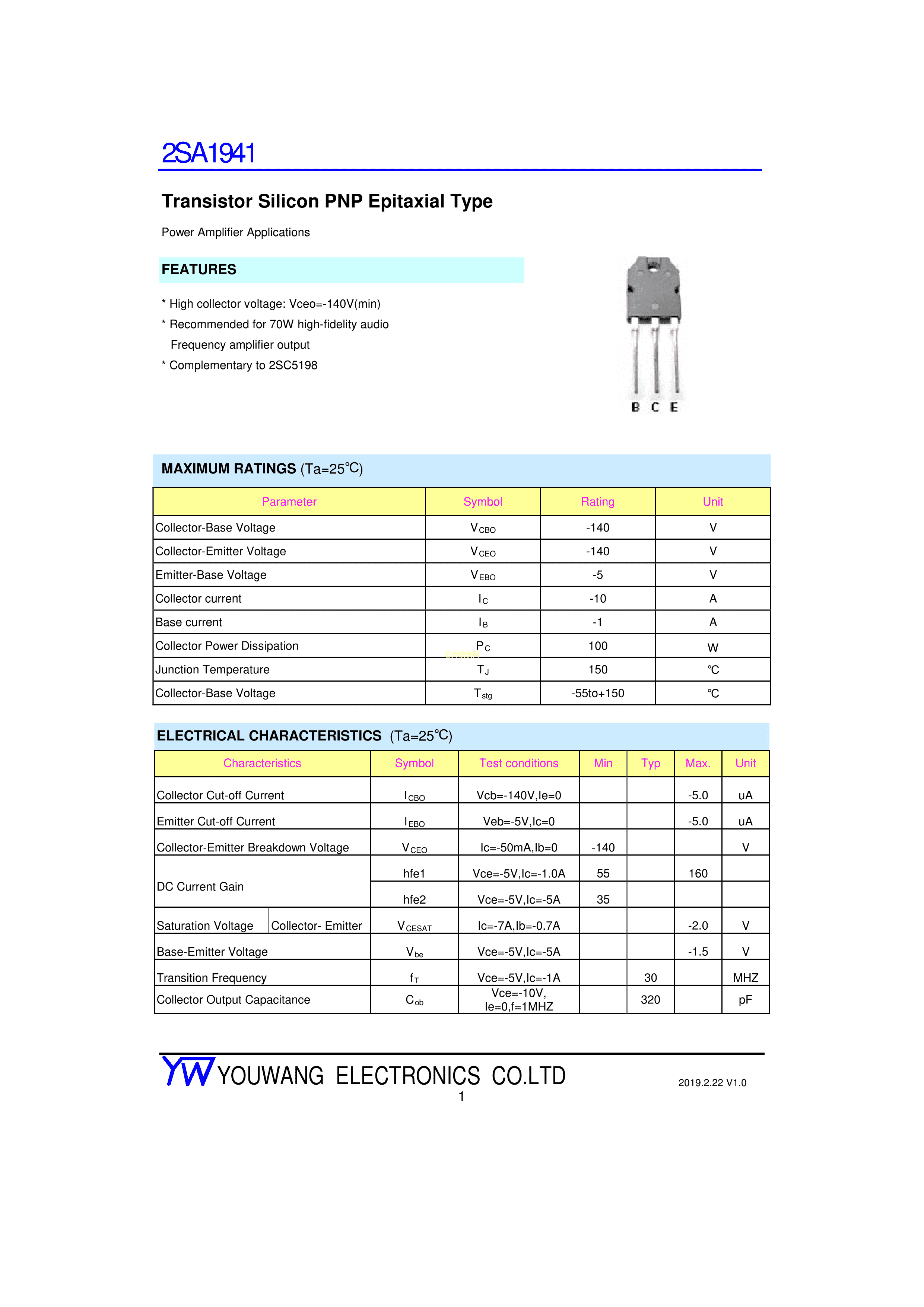 2SA1941数据手册TO-3P封装YW(友旺)PDF规格书,中英文下载