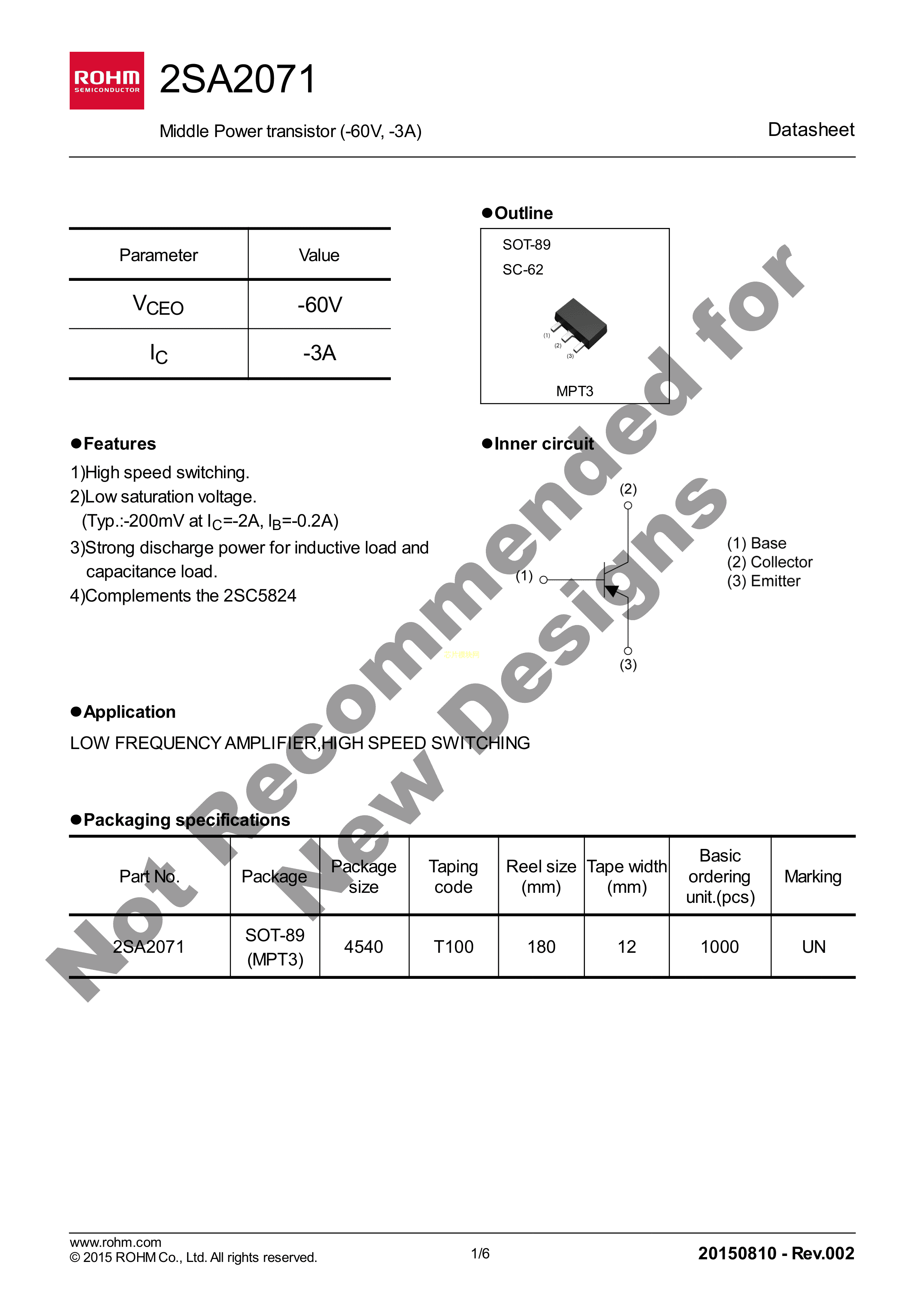 2SA2071T100Q数据手册SOT-89封装ROHM(罗姆)PDF规格书,中英文下载