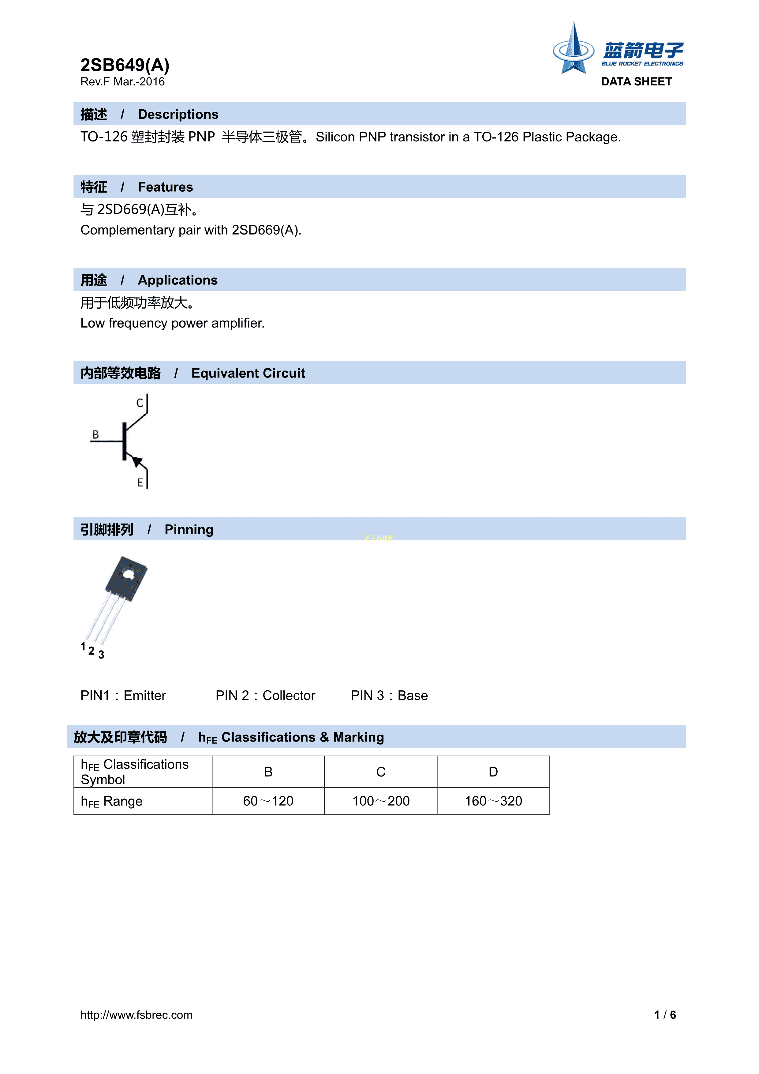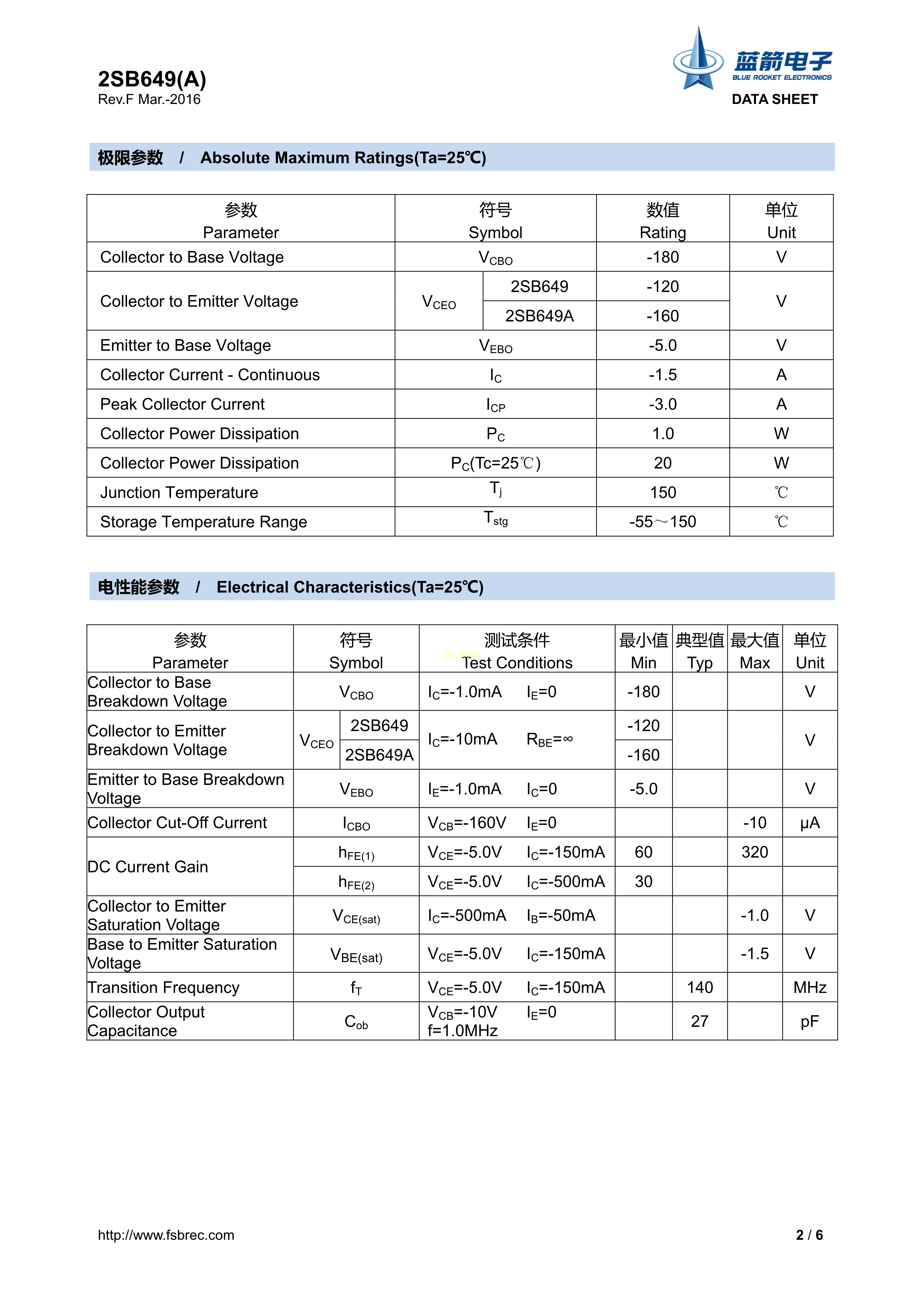 2SB649A-C数据手册TO-126F封装BLUEROCKET(蓝箭)PDF规格书,中英文下载