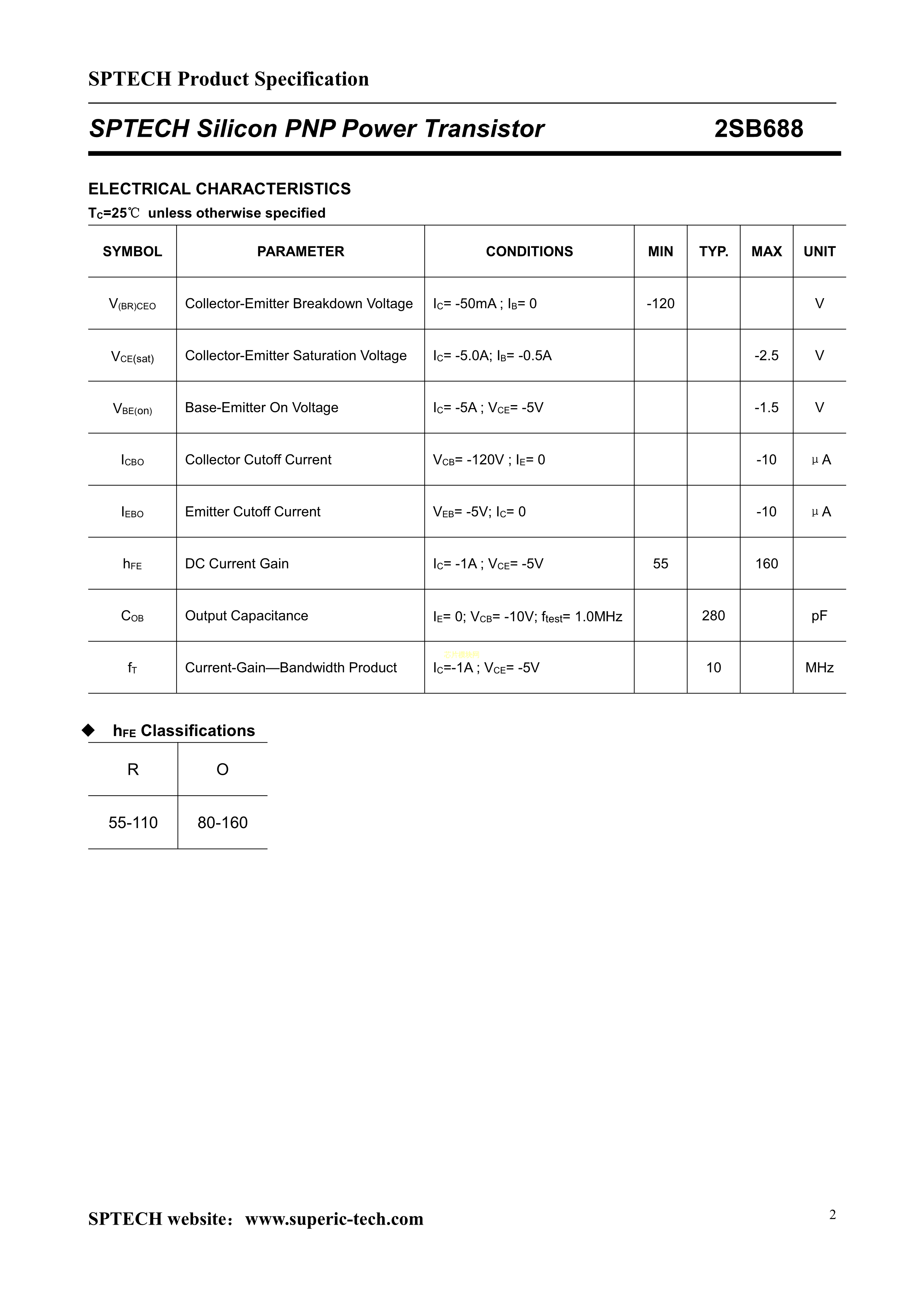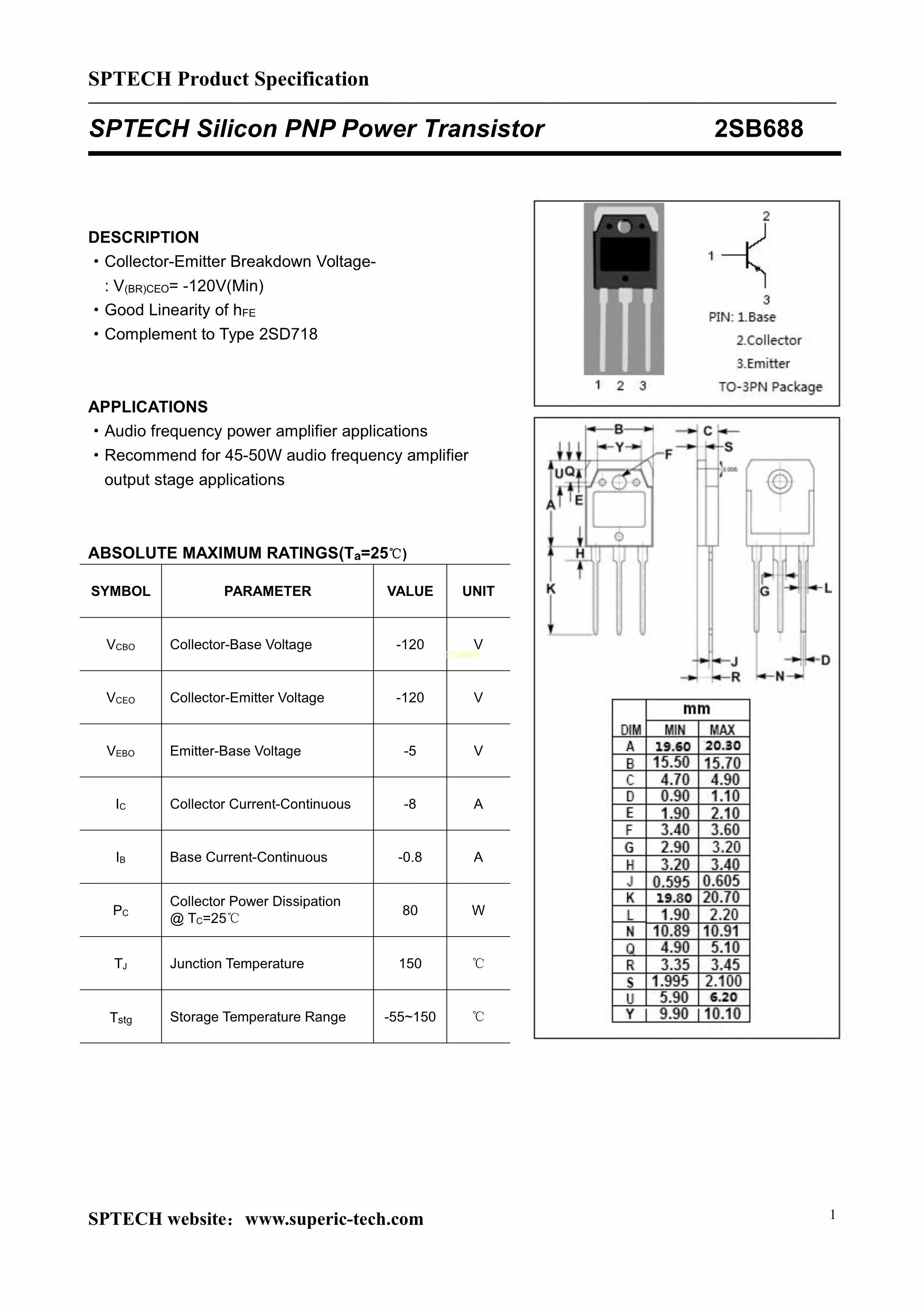 2SB688数据手册TO-3PN封装SPTECH(深圳质超)PDF规格书,中英文下载