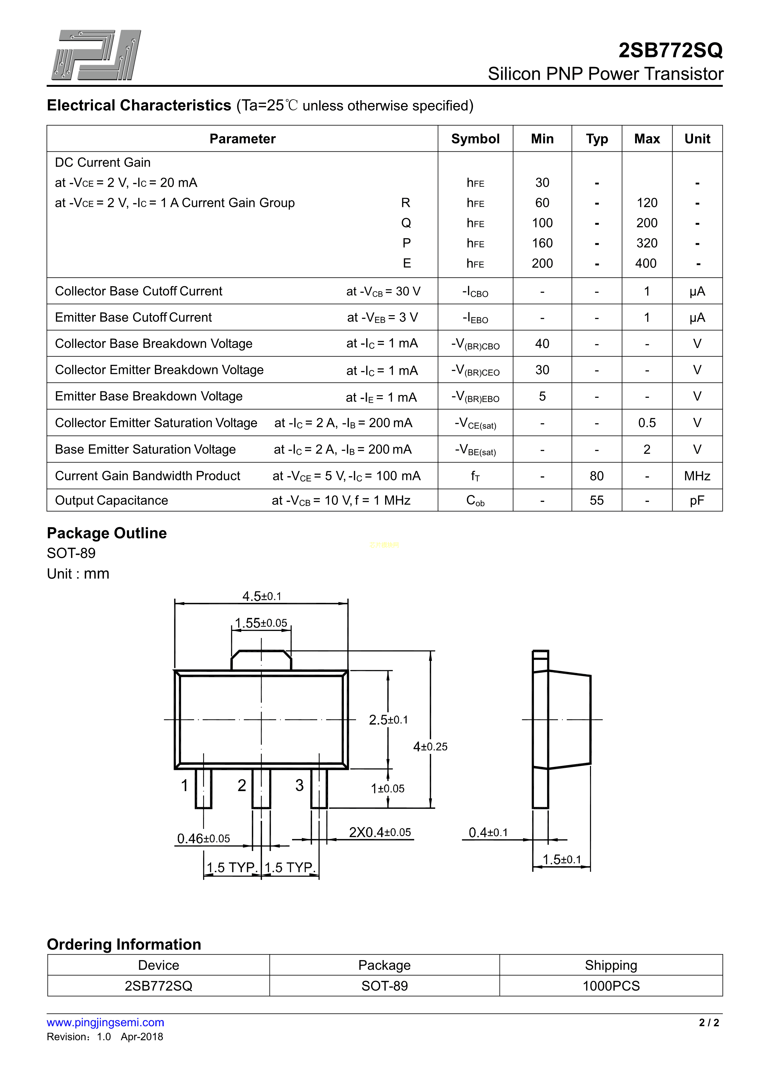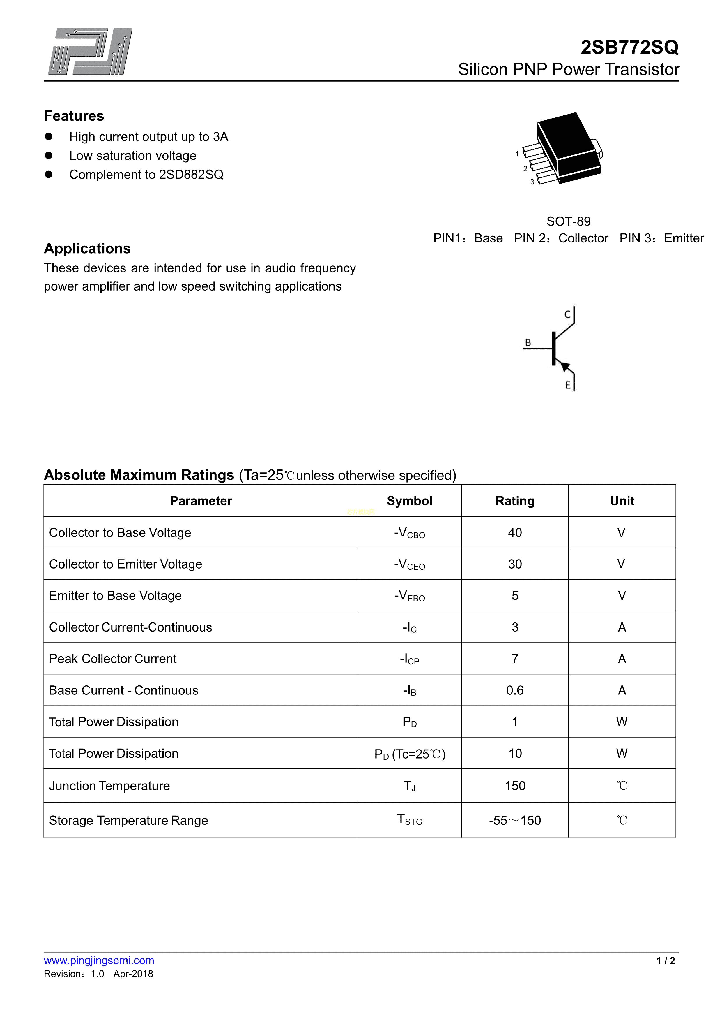 2SB772SQ-P数据手册SOT-89封装PJSEMI(平晶微)PDF规格书,中英文下载