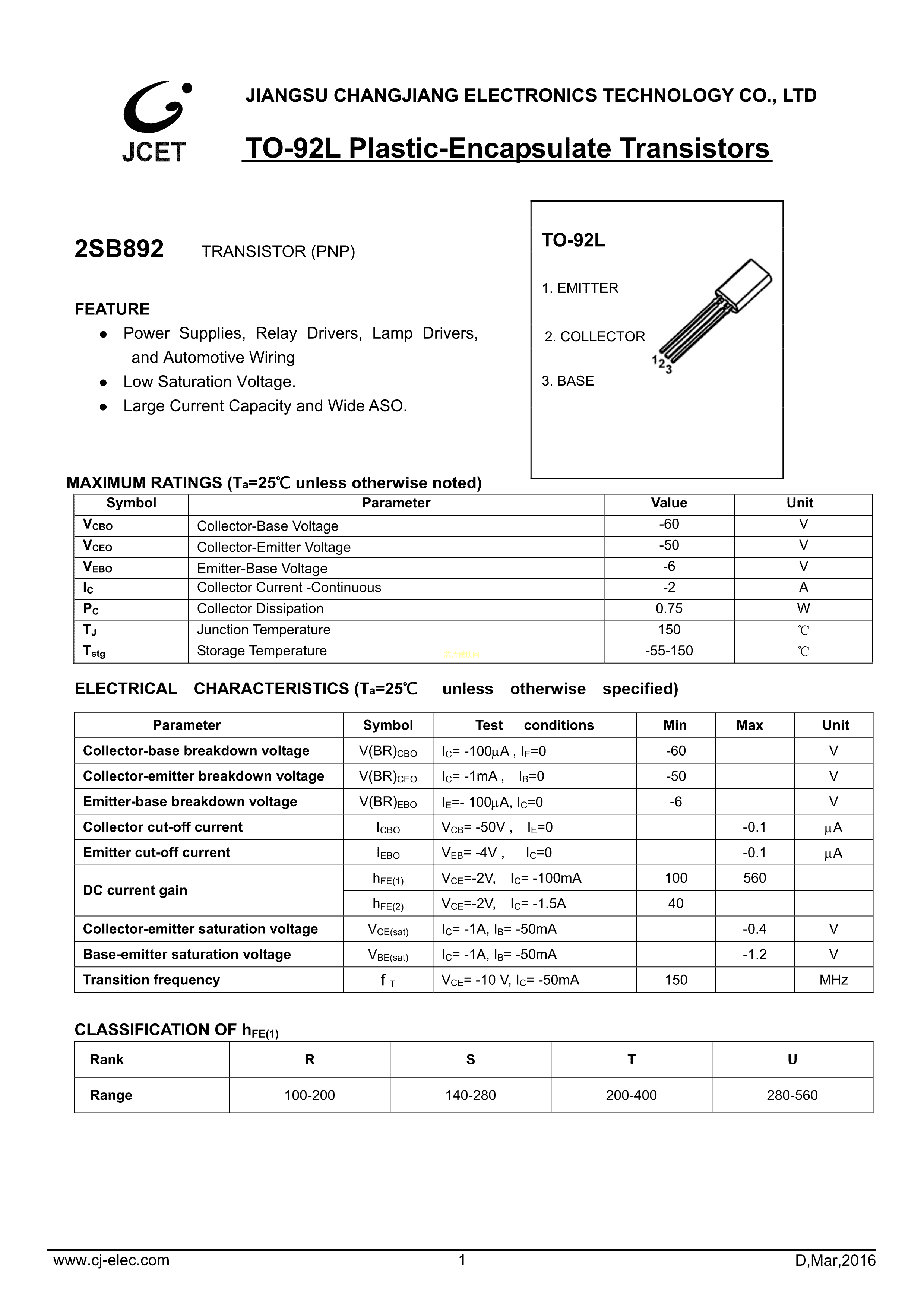 2SB892数据手册TO-92-3L封装CJ(江苏长电-长晶)PDF规格书,中英文下载