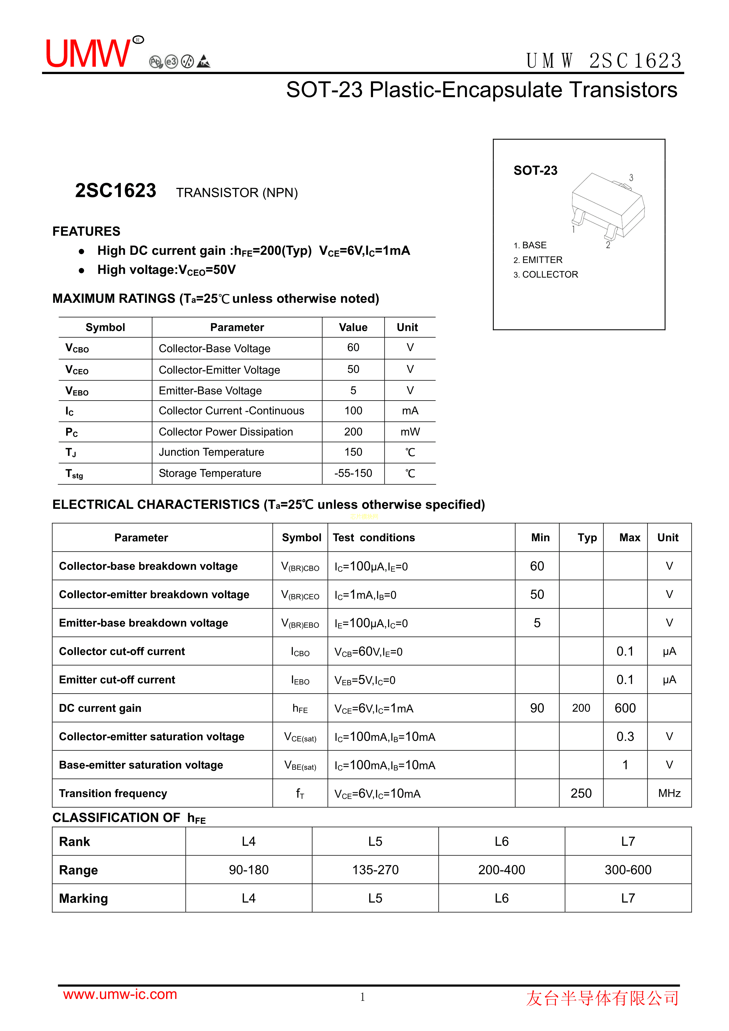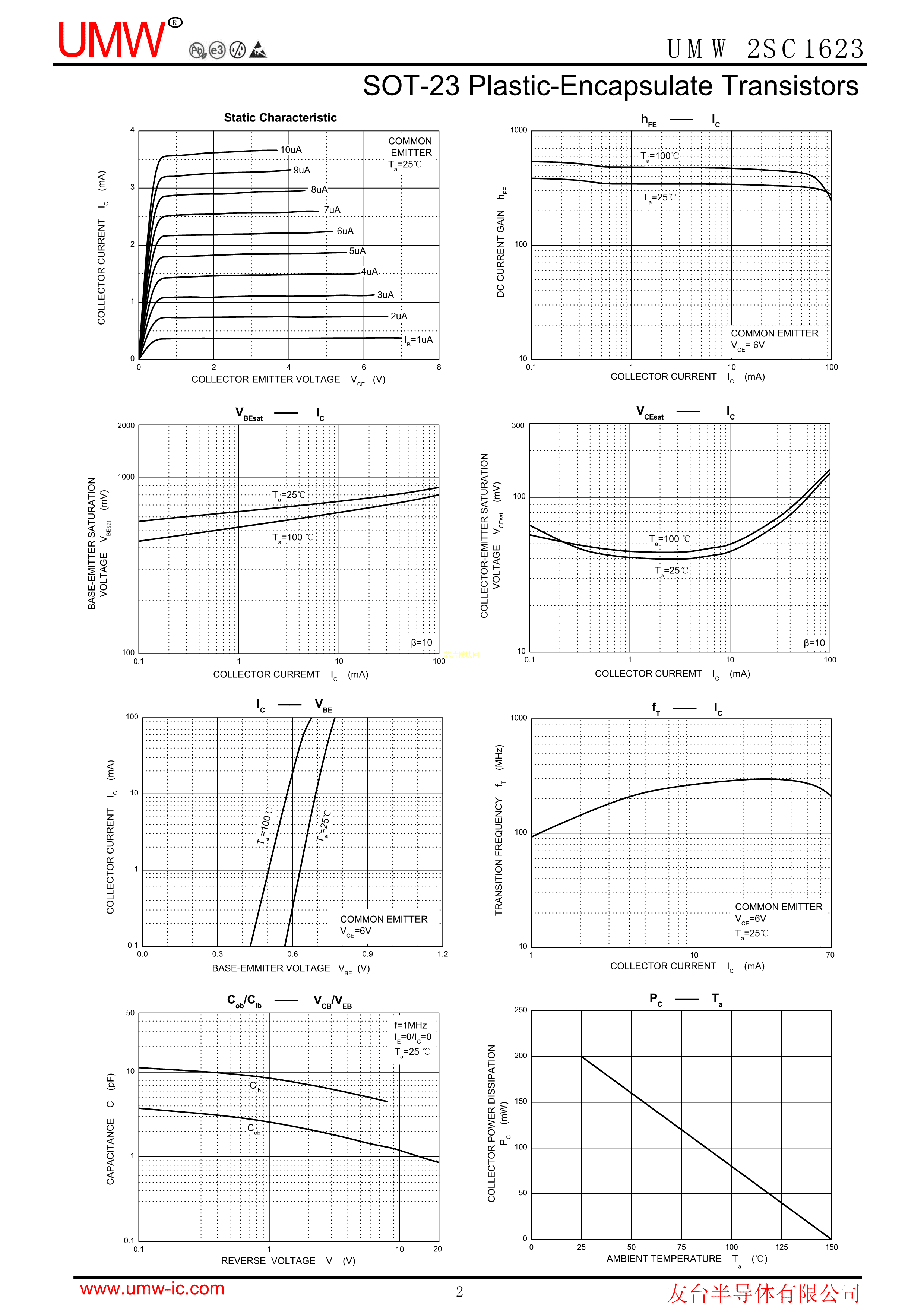 2SC1623数据手册SOT-23-3封装UMW(友台半导体)PDF规格书,中英文下载