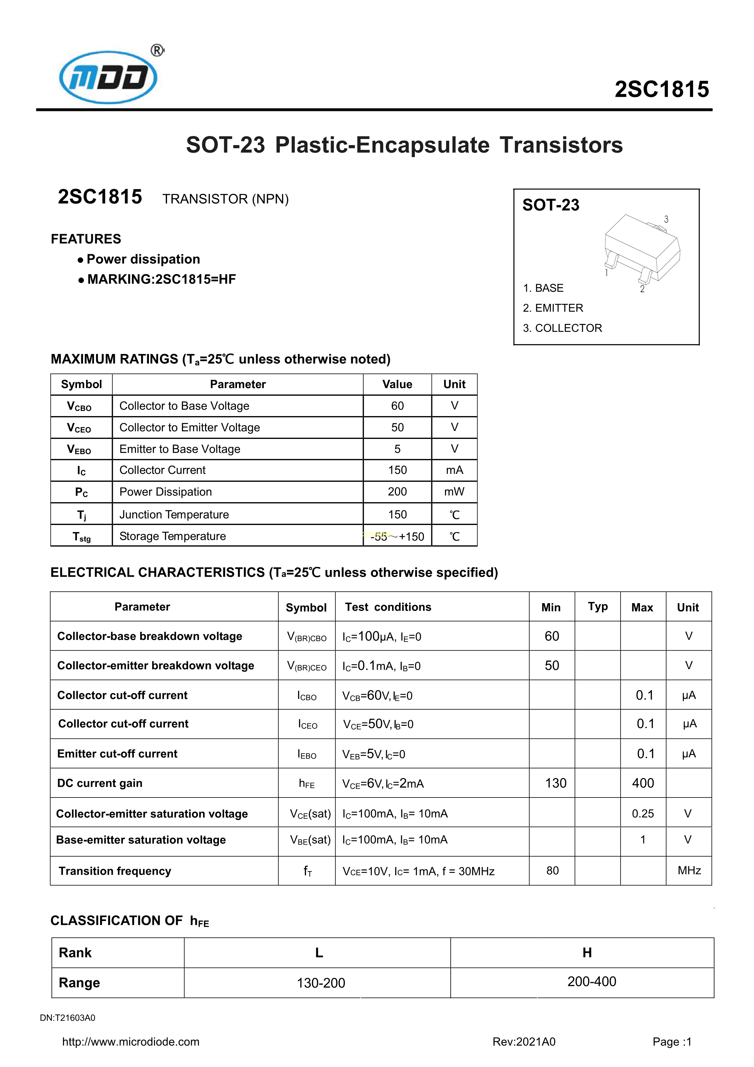 2SC1815数据手册SOT-23封装MDDPDF规格书,中英文下载