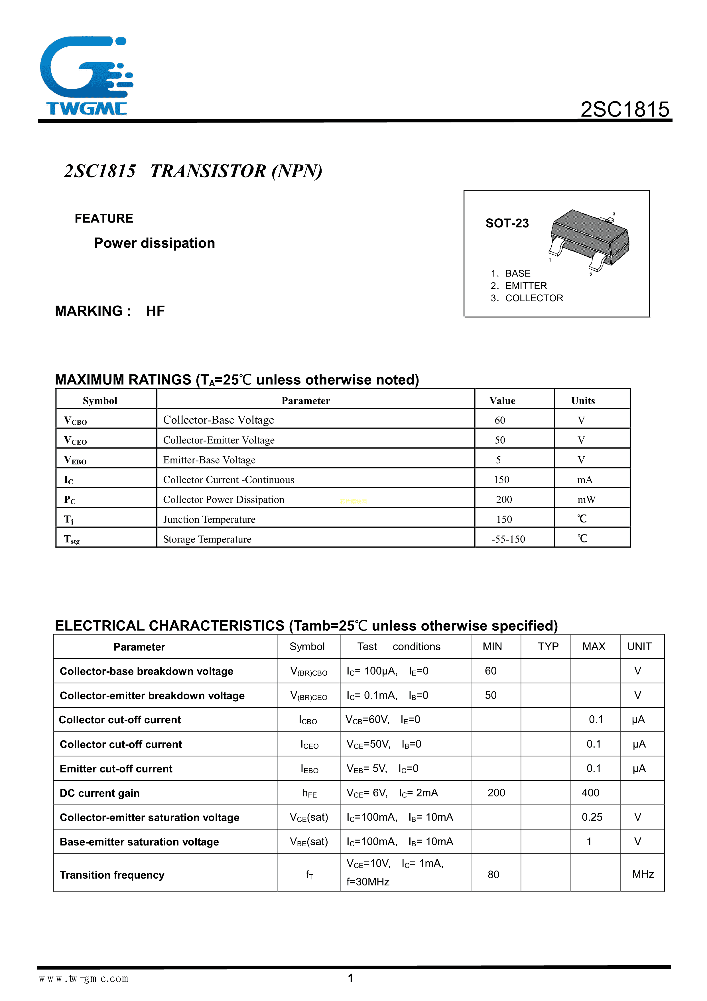 2SC1815数据手册SOT-23封装TWGMC(台湾迪嘉)PDF规格书,中英文下载
