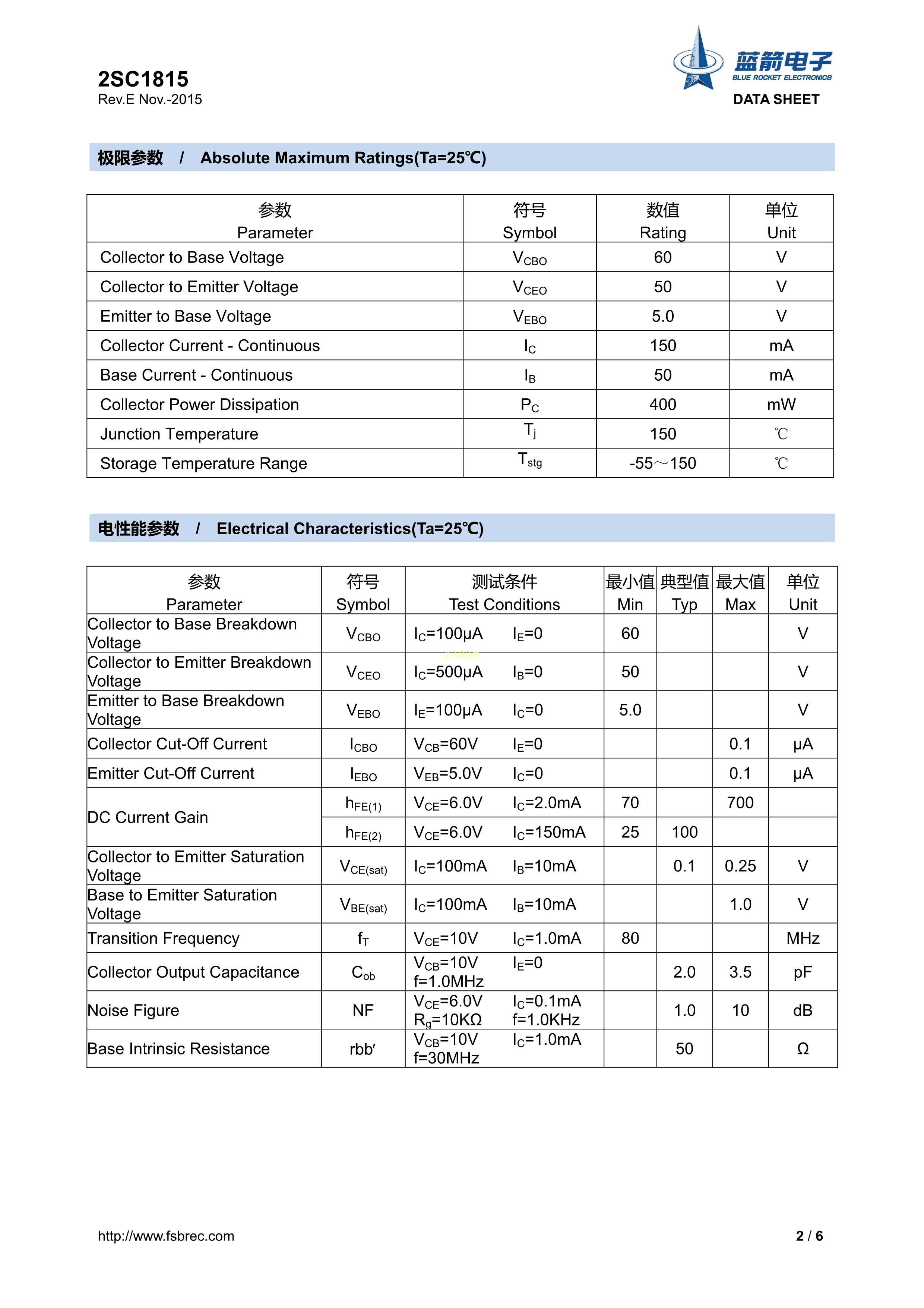 2SC1815-GR数据手册TO-92封装BLUEROCKET(蓝箭)PDF规格书,中英文下载