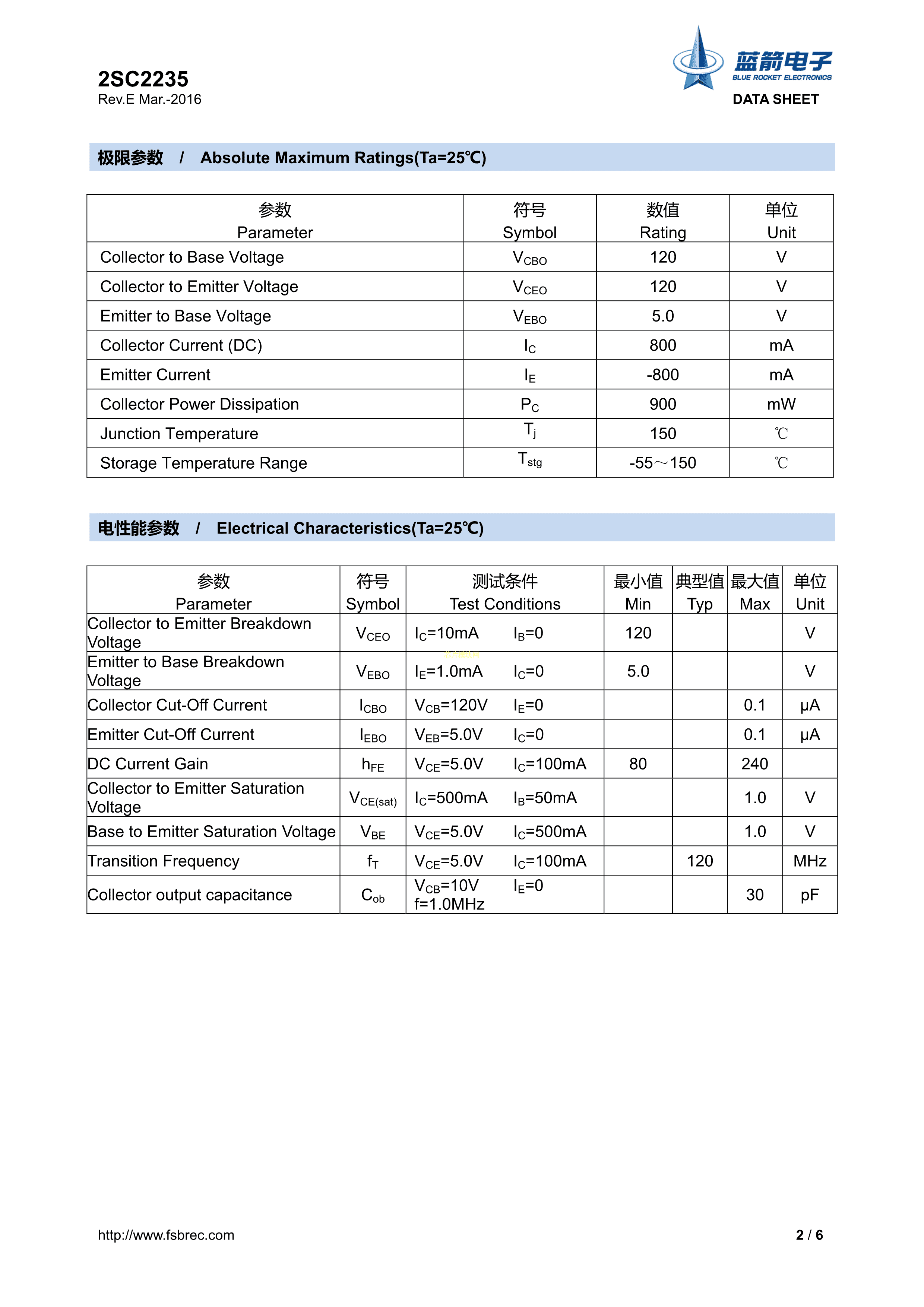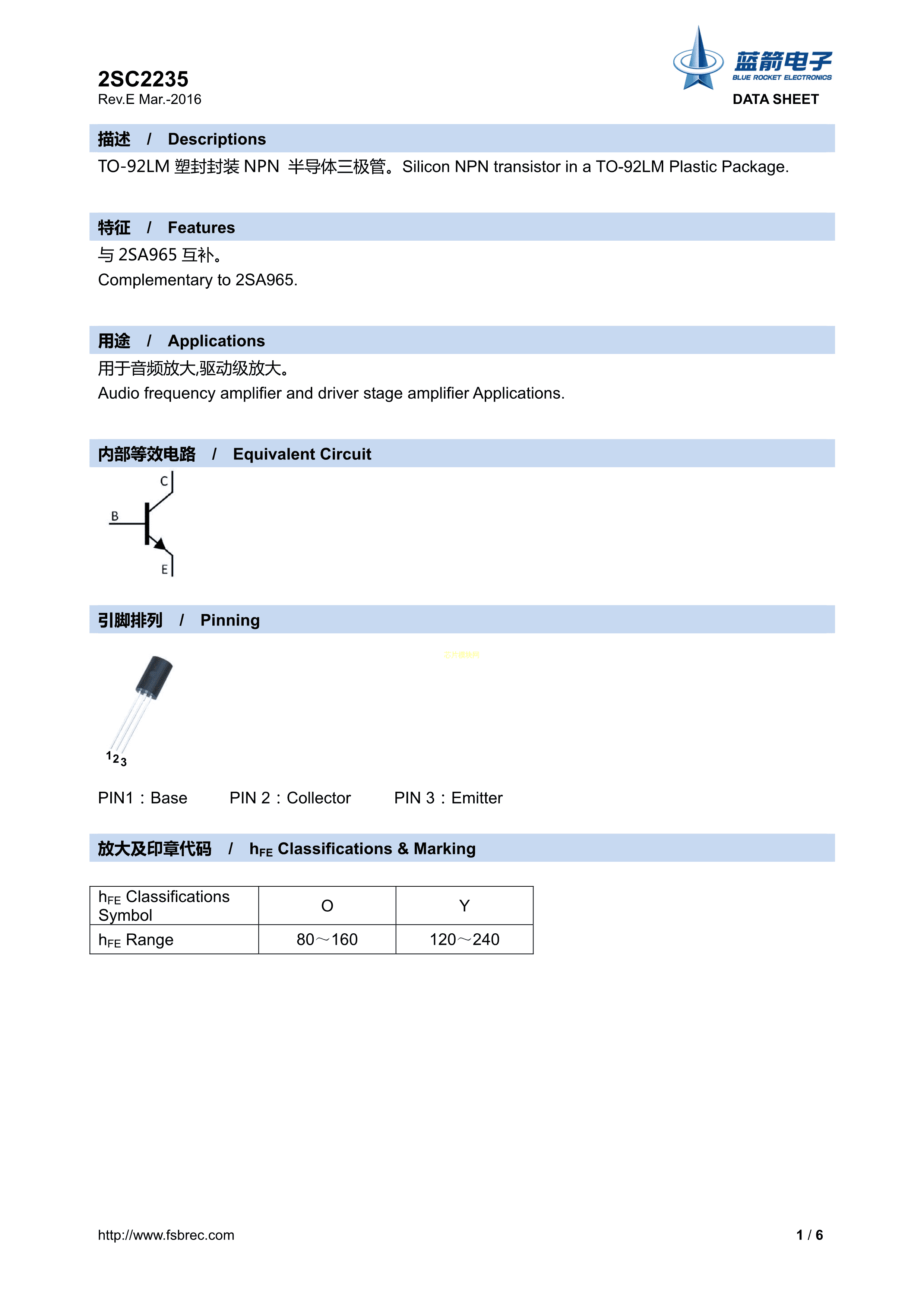 2SC2235数据手册TO-92LM封装BLUE ROCKET(蓝箭)PDF规格书,中英文下载