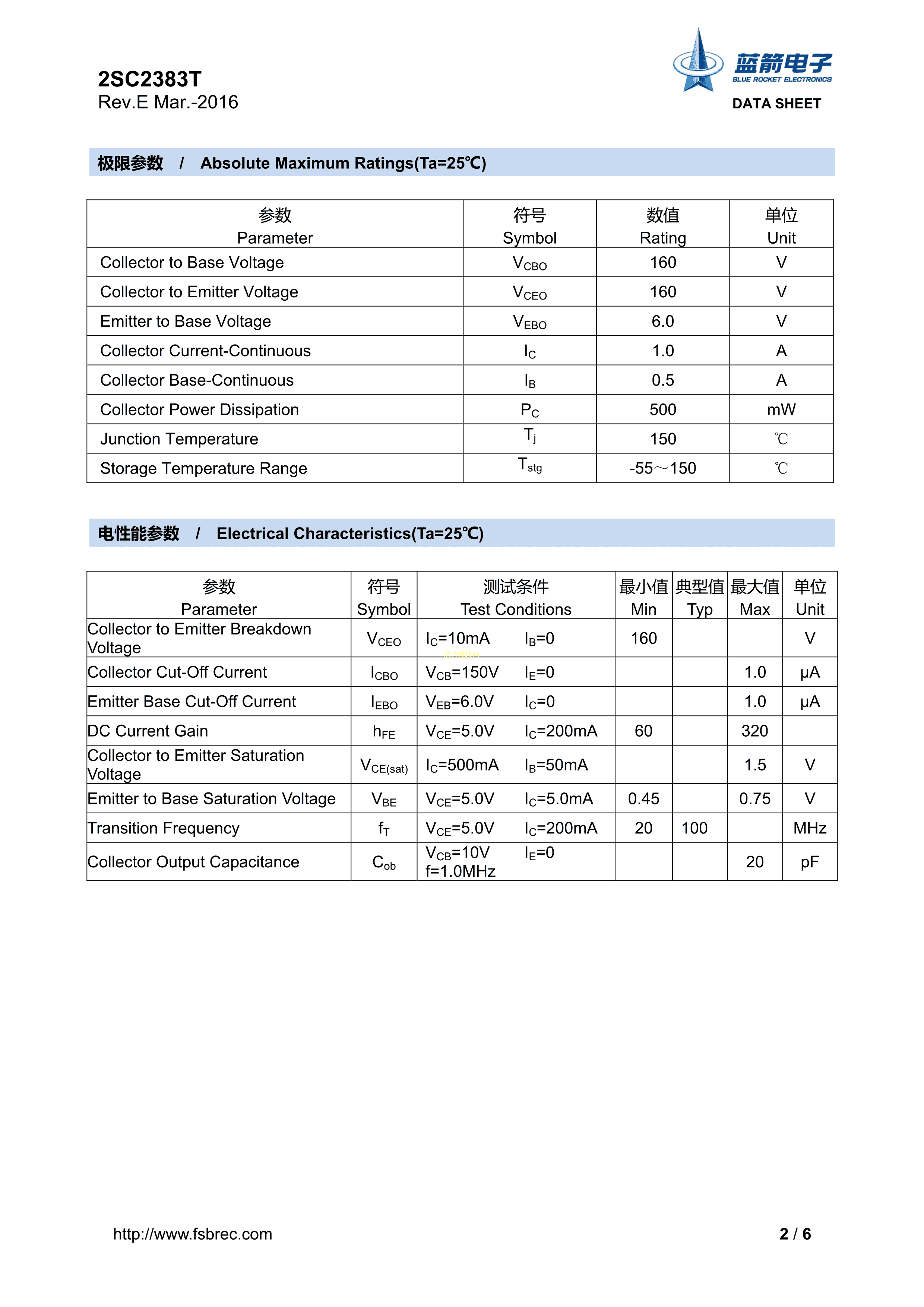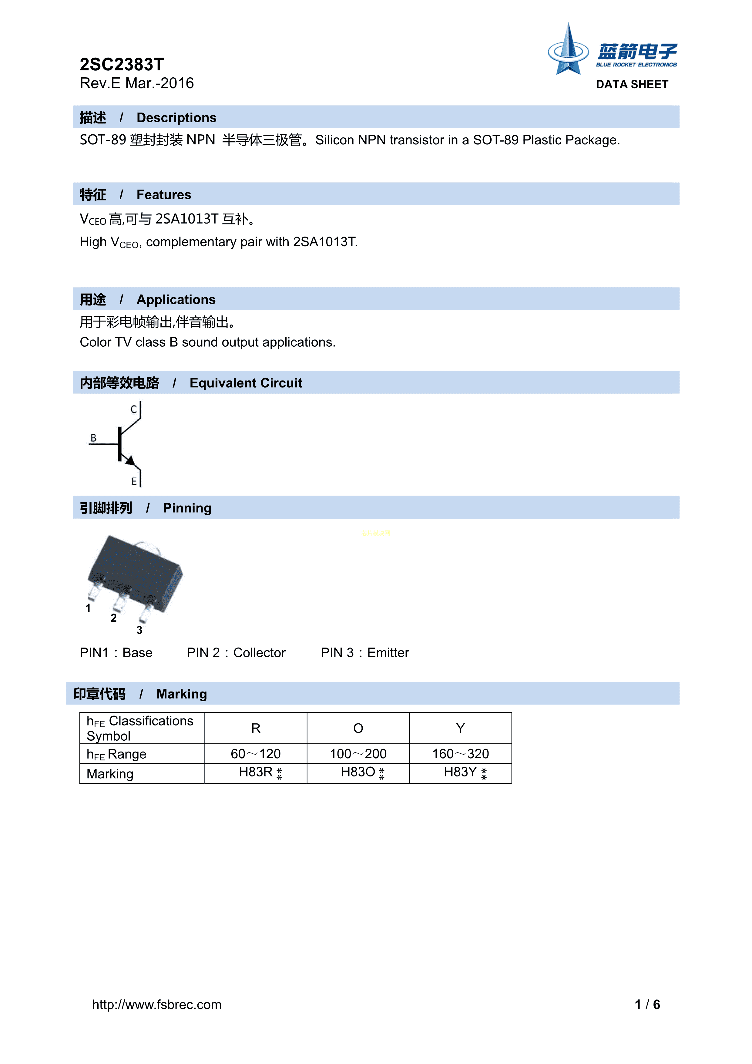 2SC2383T-Y数据手册SOT-89封装BLUE ROCKET(蓝箭)PDF规格书,中英文下载