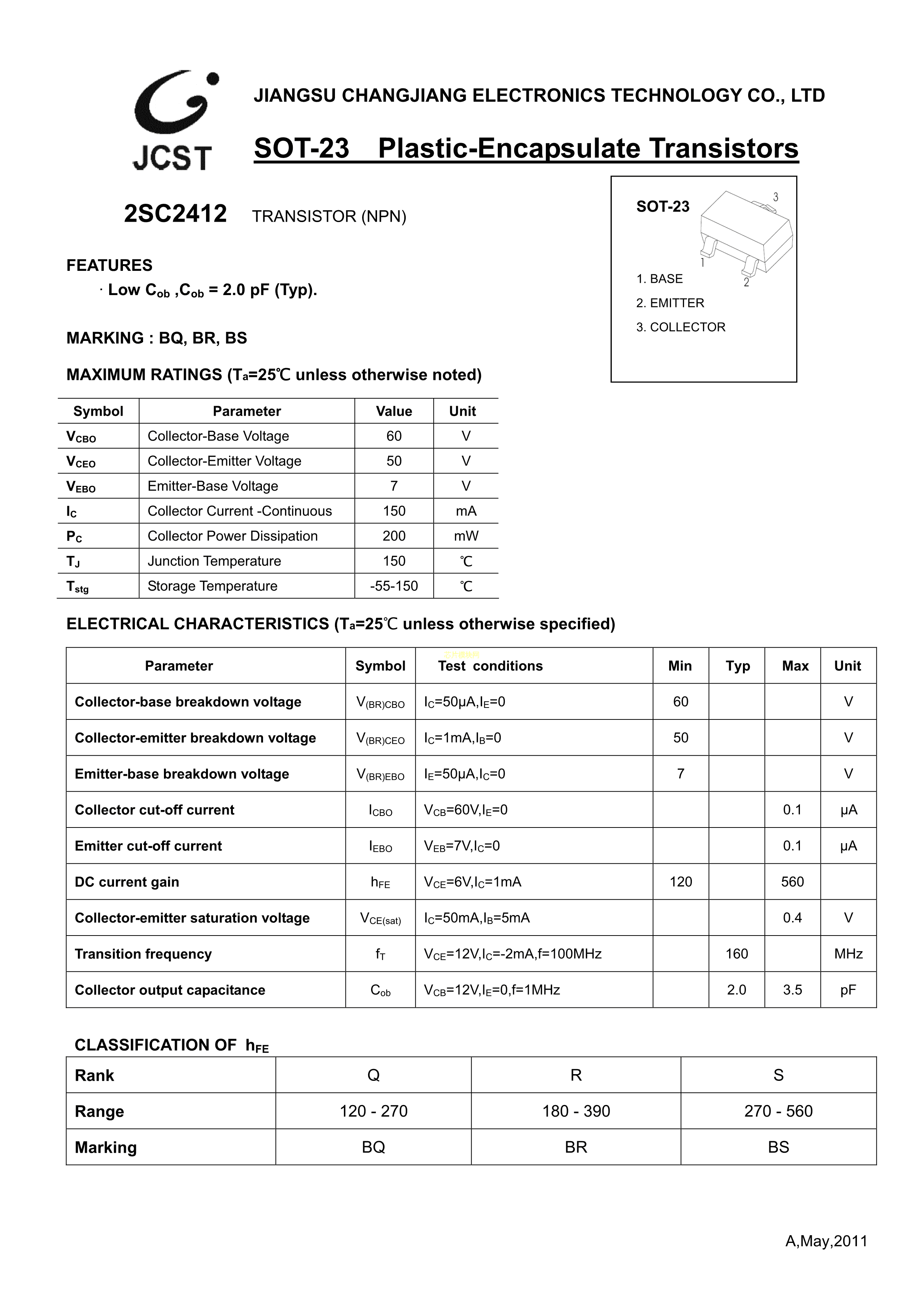 2SC2412数据手册SOT-23(SOT-23-3)封装CJ(江苏长电-长晶)PDF规格书,中英文