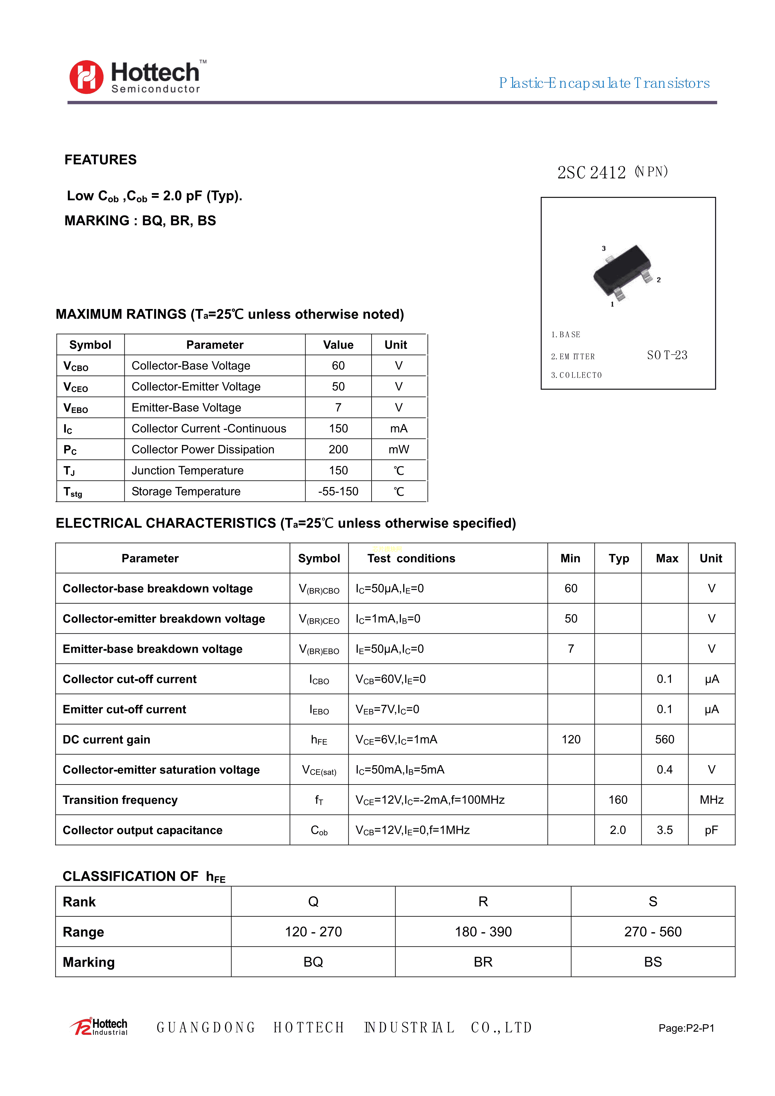2SC2412数据手册SOT-23(SOT-23-3)封装Hottech(合科泰)PDF规格书,中英