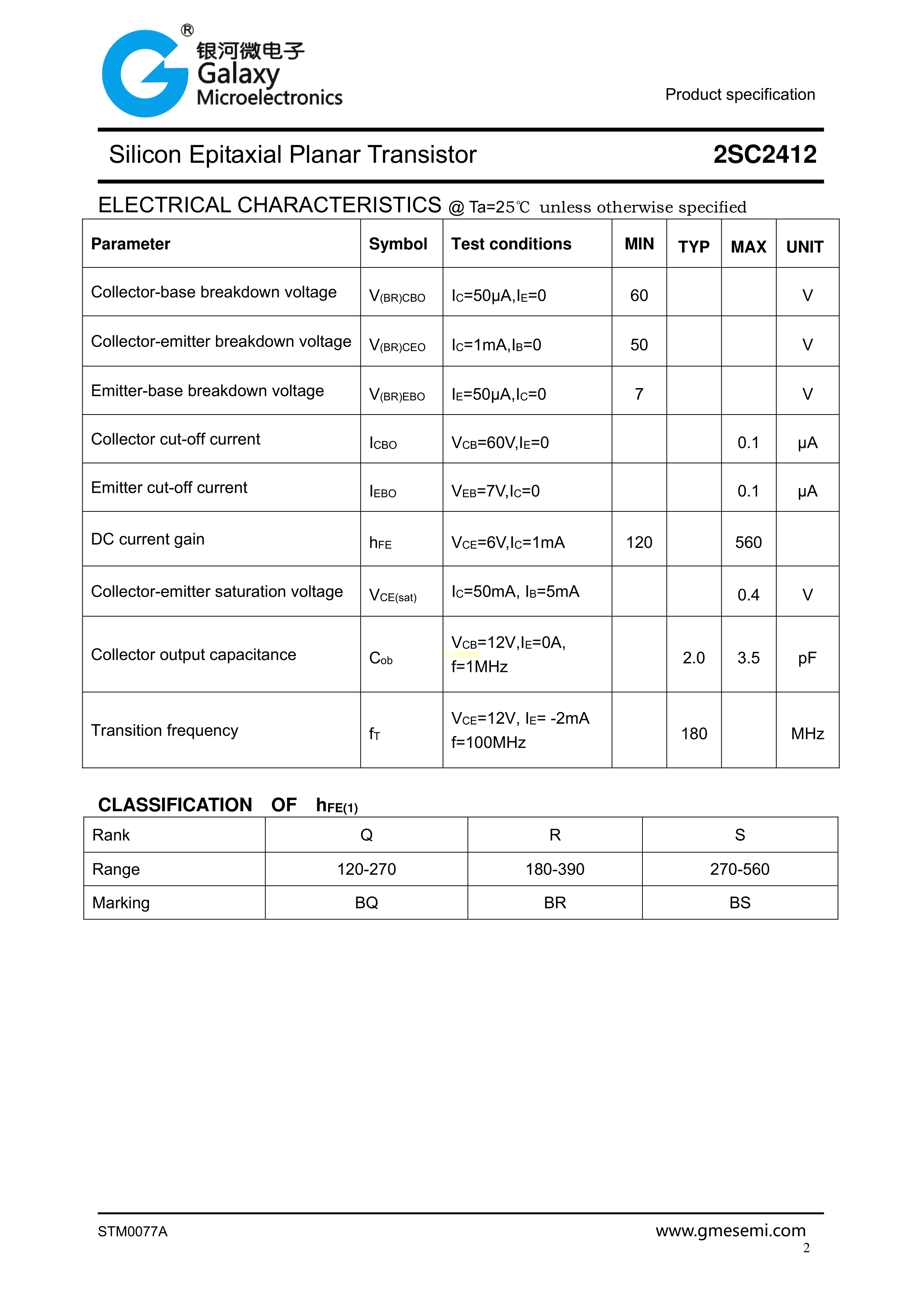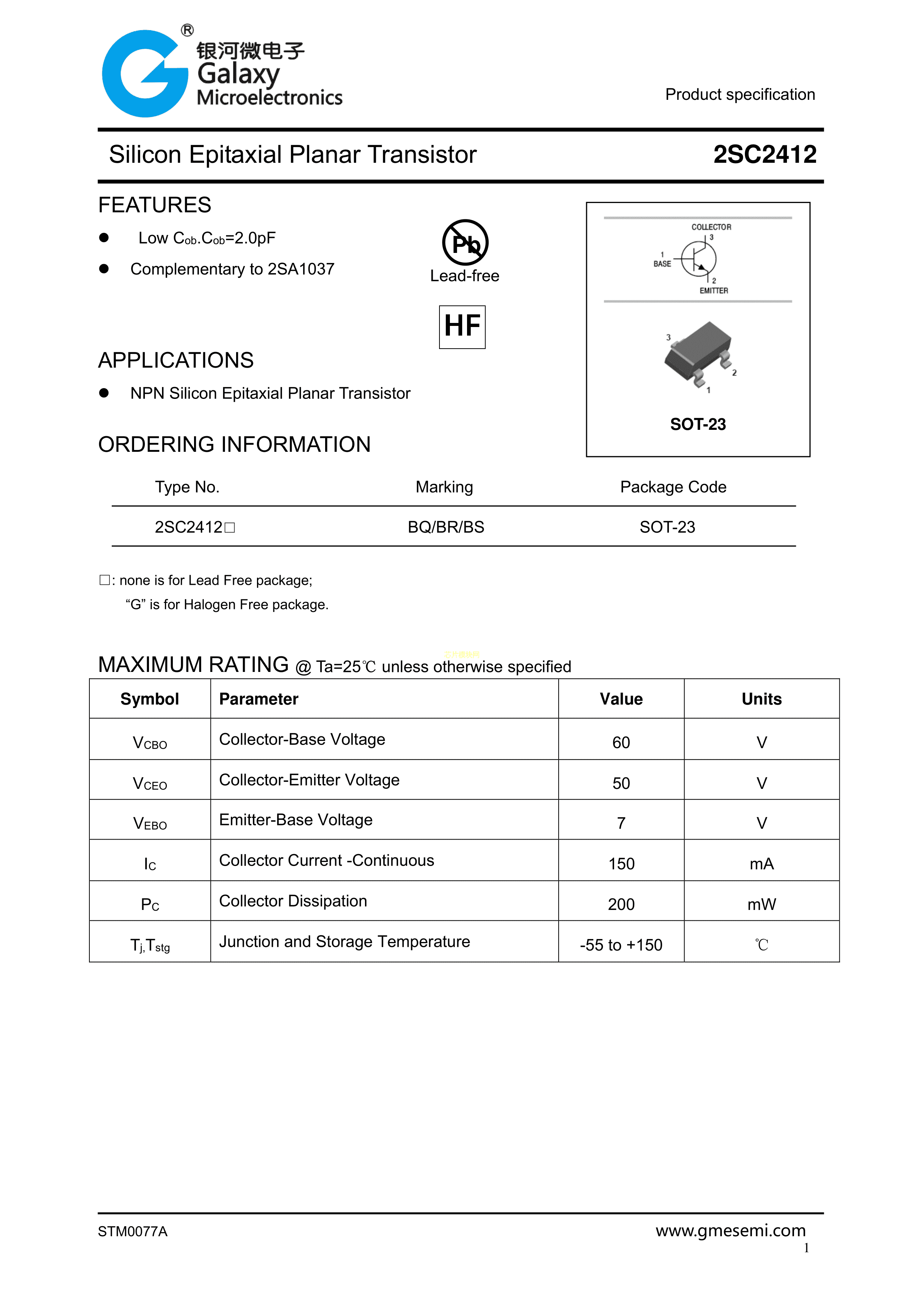 2SC2412G数据手册SOT-23封装银河微电子PDF规格书,中英文下载