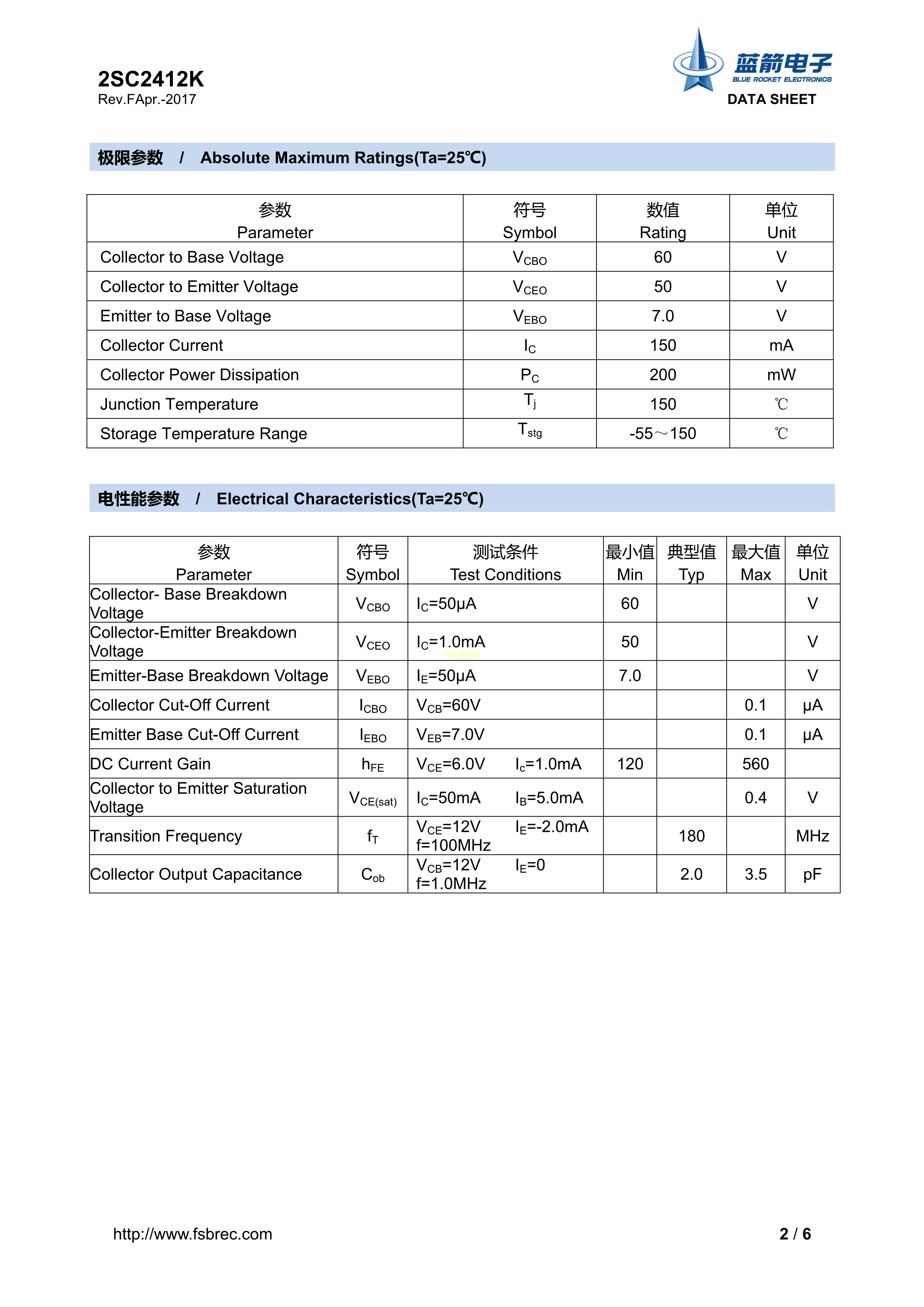 2SC2412K-R数据手册SOT-23封装BLUEROCKET(蓝箭)PDF规格书,中英文下载