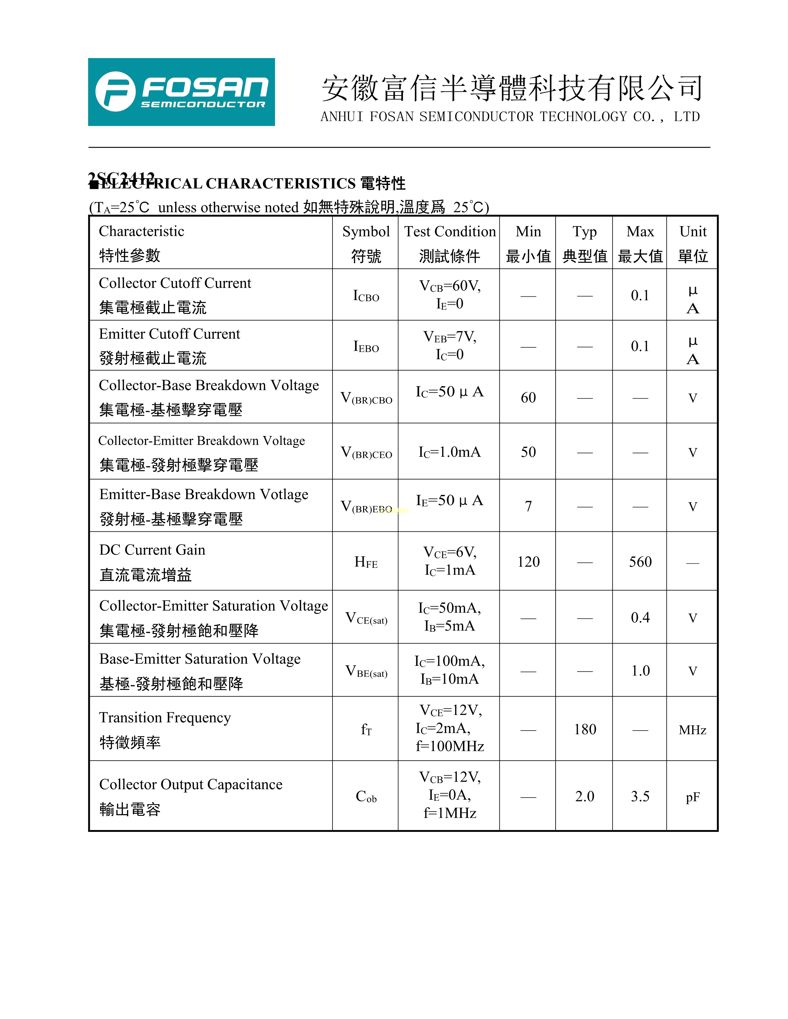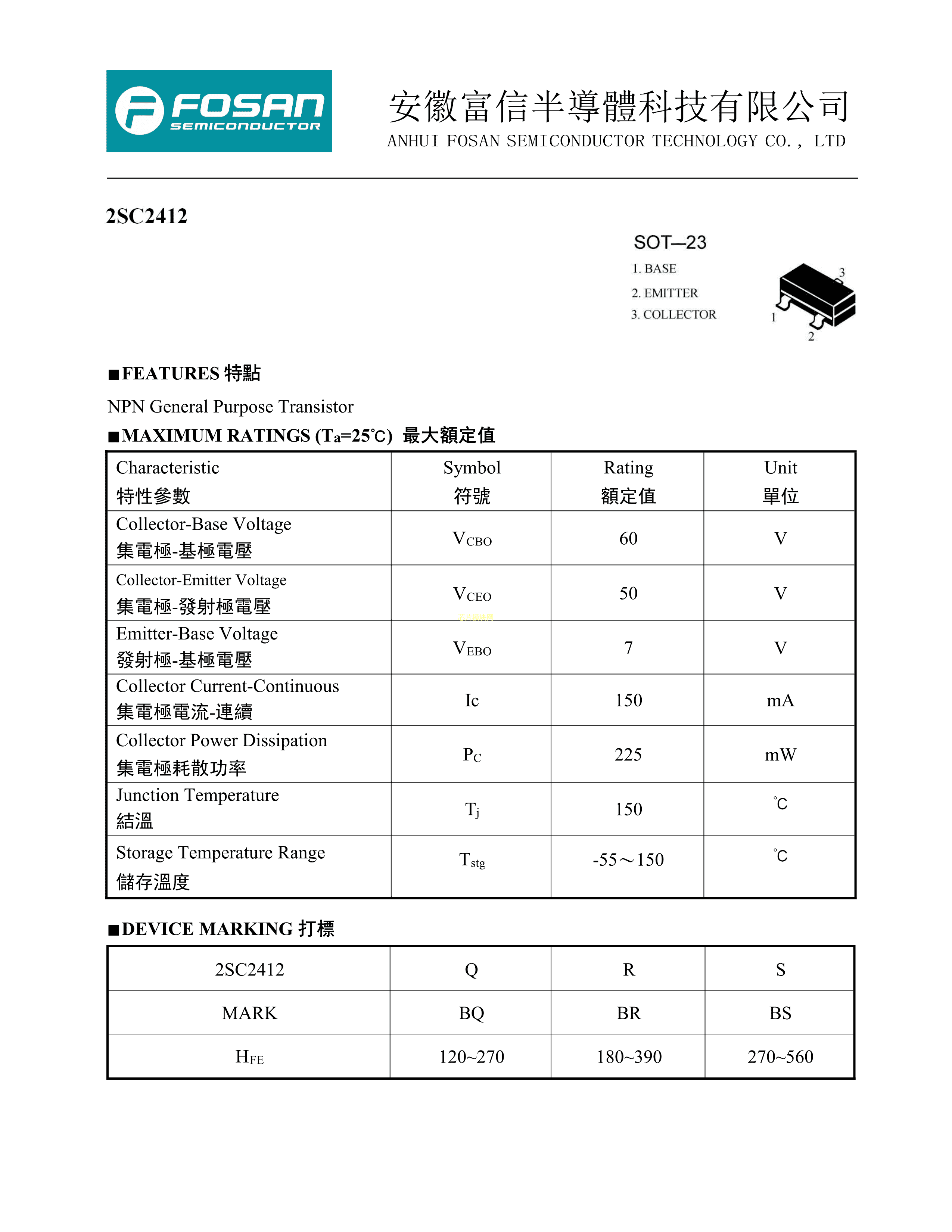 2SC2412L BR数据手册SOT-23封装FOSAN(富信)PDF规格书,中英文下载