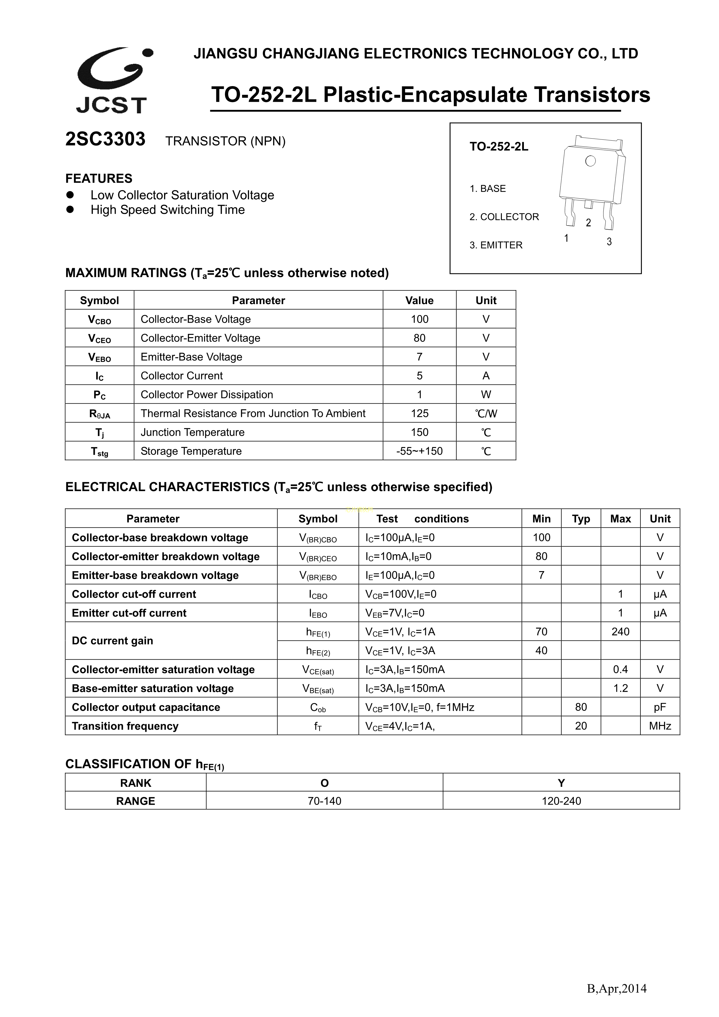 2SC3303数据手册TO-252-2(DPAK)封装CJ(江苏长电-长晶)PDF规格书,中英文下载
