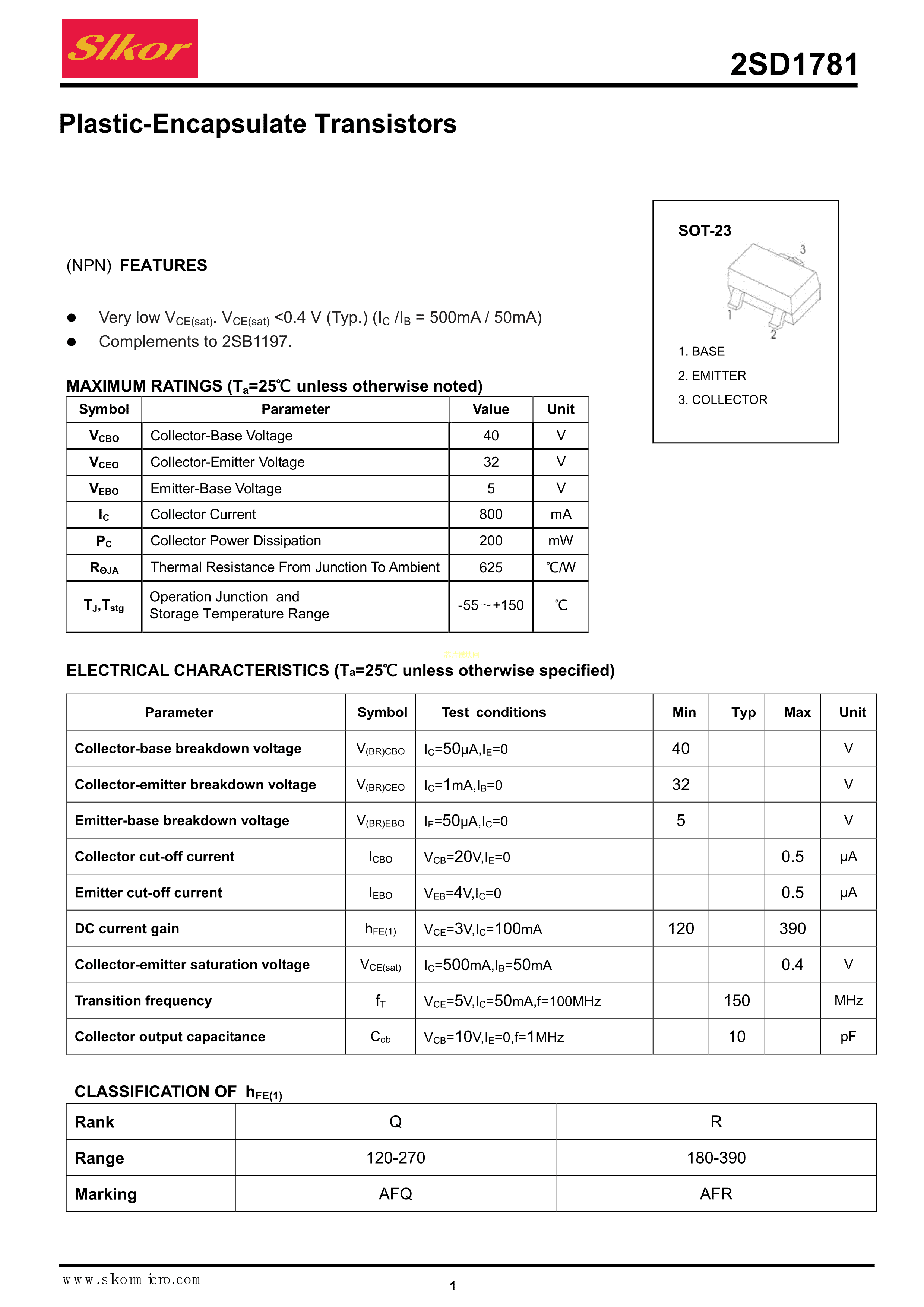 2SD1781R数据手册SOT-23封装Slkor(萨科微)PDF规格书,中英文下载