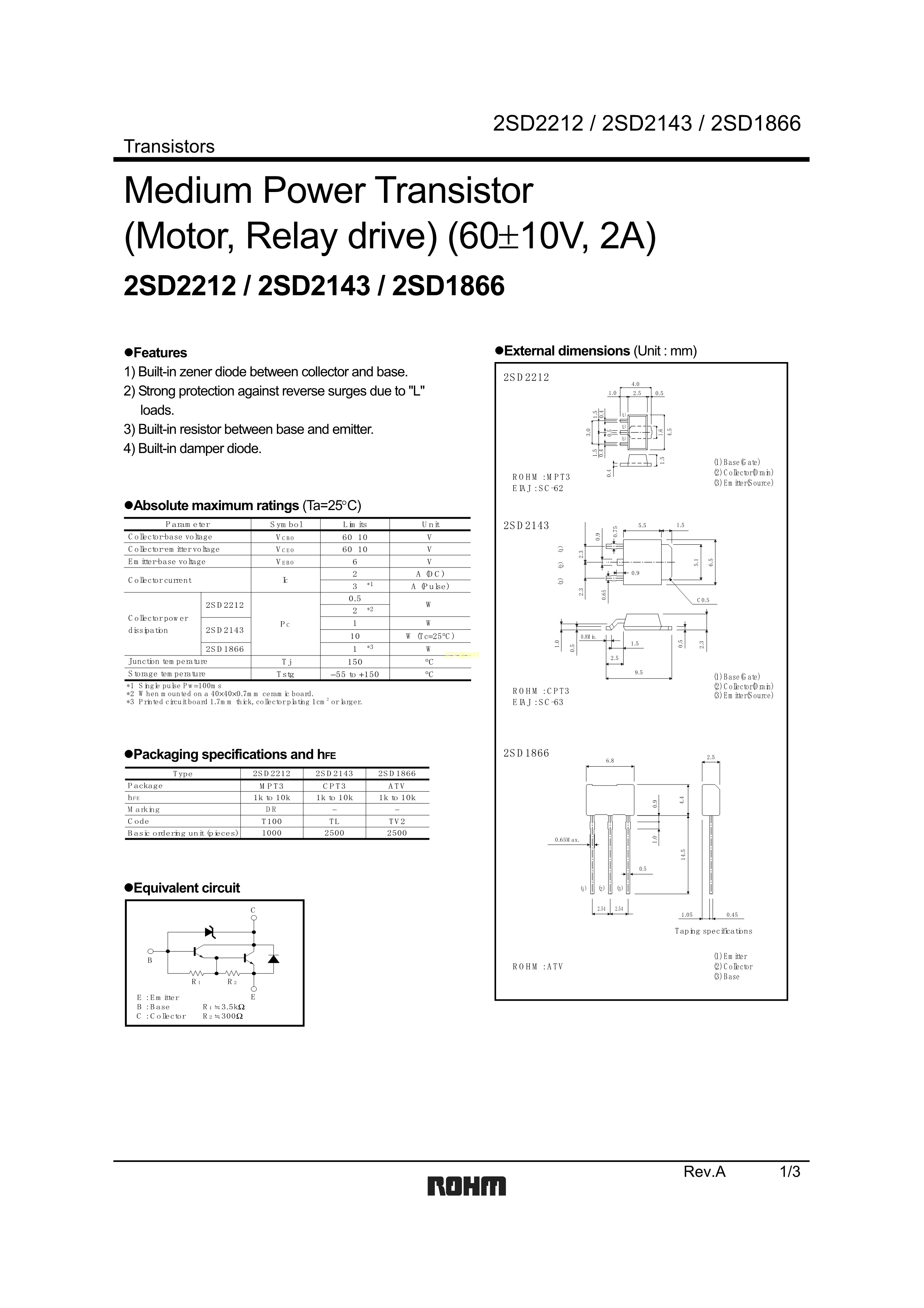 2SD2212T100数据手册TO-243AA封装ROHM(罗姆)PDF规格书,中英文下载
