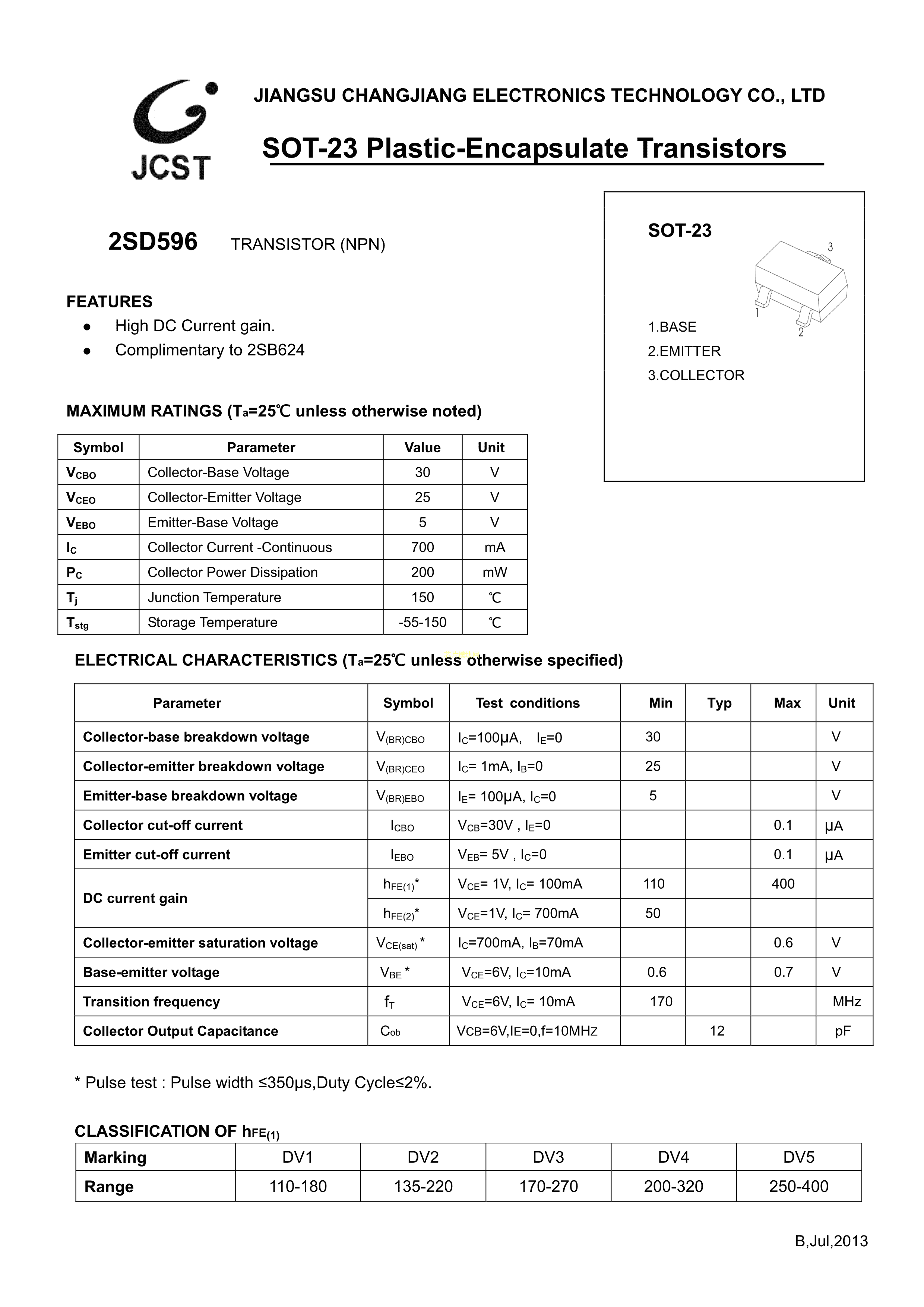 2SD596数据手册SOT-23(SOT-23-3)封装CJ(江苏长电-长晶)PDF规格书,中英文下