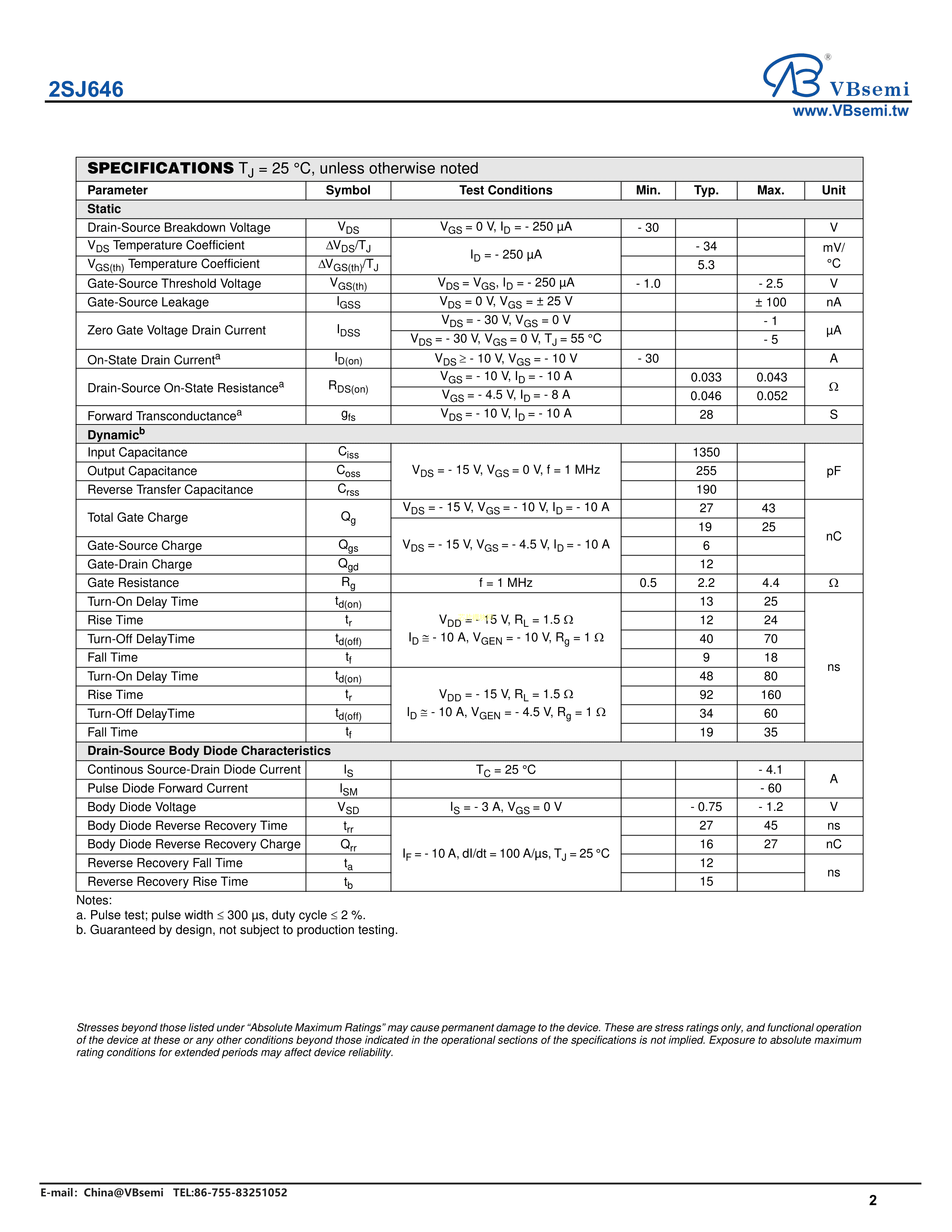 2SJ646数据手册TO-252封装VBsemi(台湾微碧)PDF规格书,中英文下载