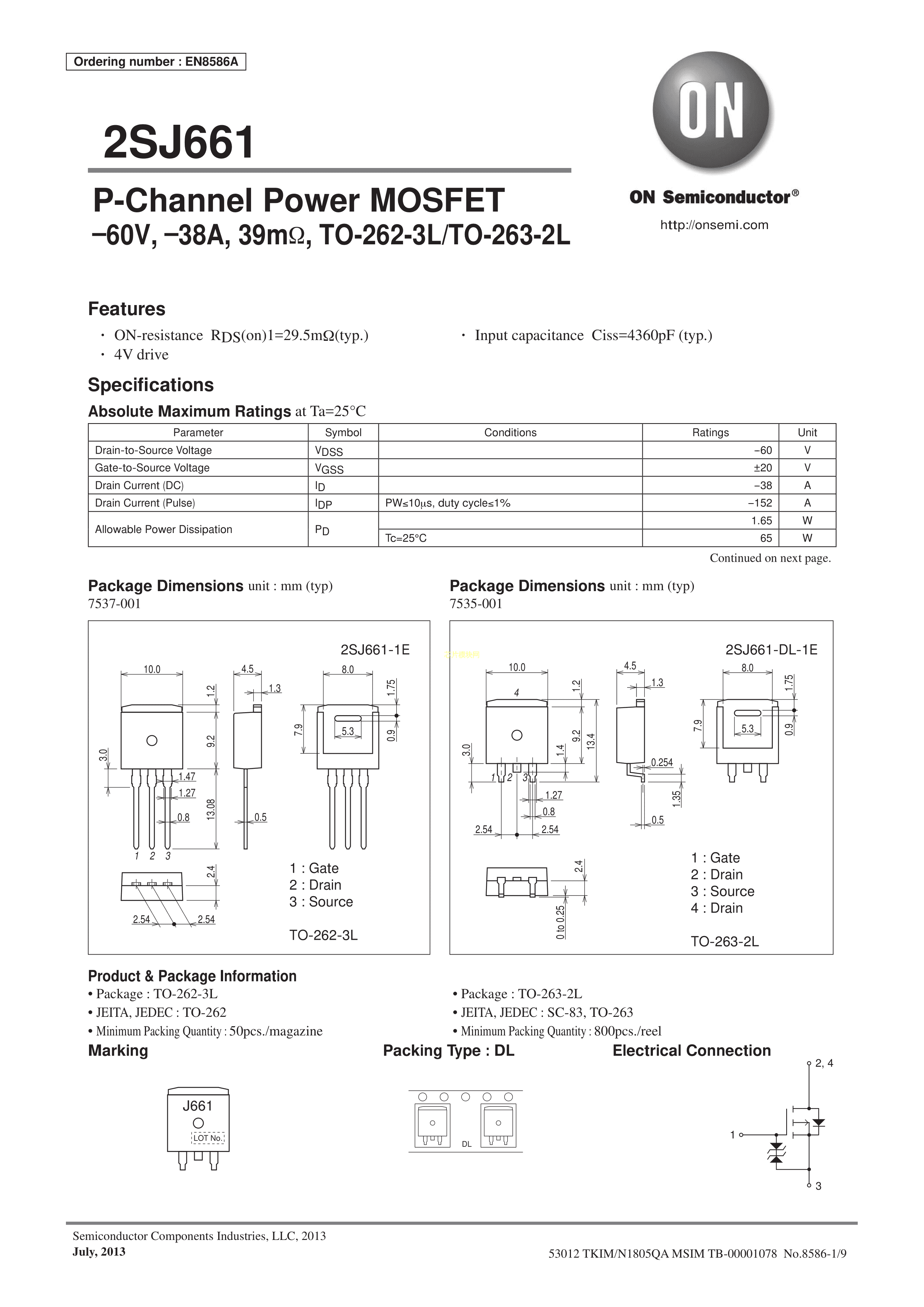 2SJ661-1E数据手册TO-263-3封装onsemi(安森美)PDF规格书,中英文下载