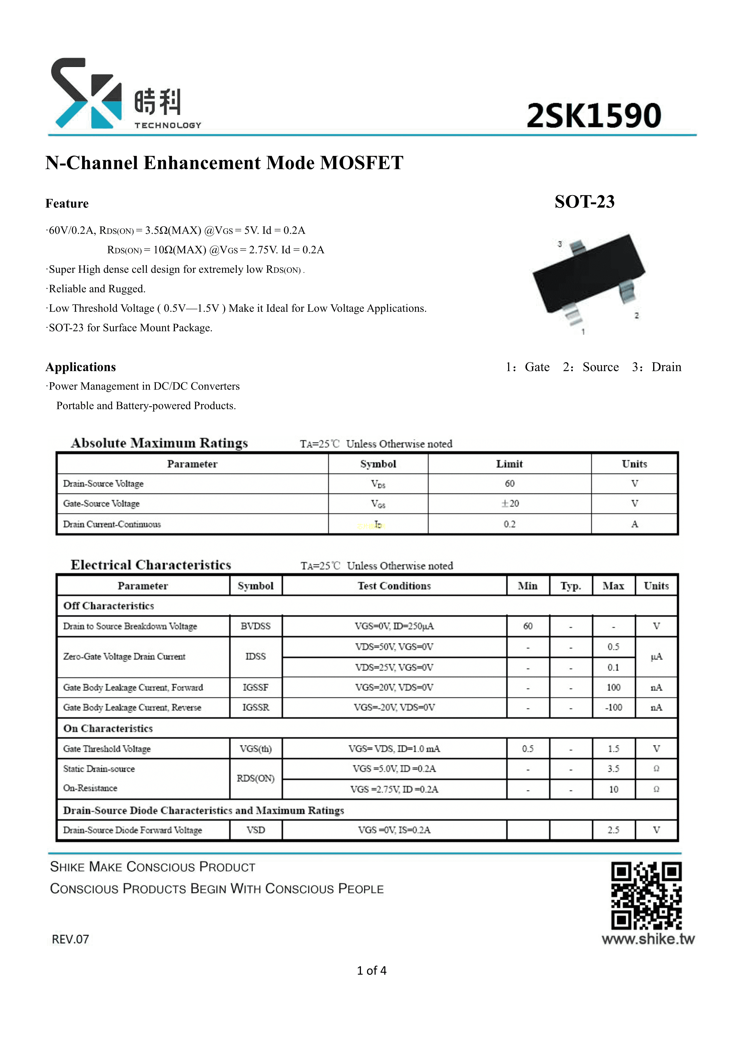 2SK1590数据手册SOT-23(SOT-23-3)封装SHIKUES(时科)PDF规格书,中英文