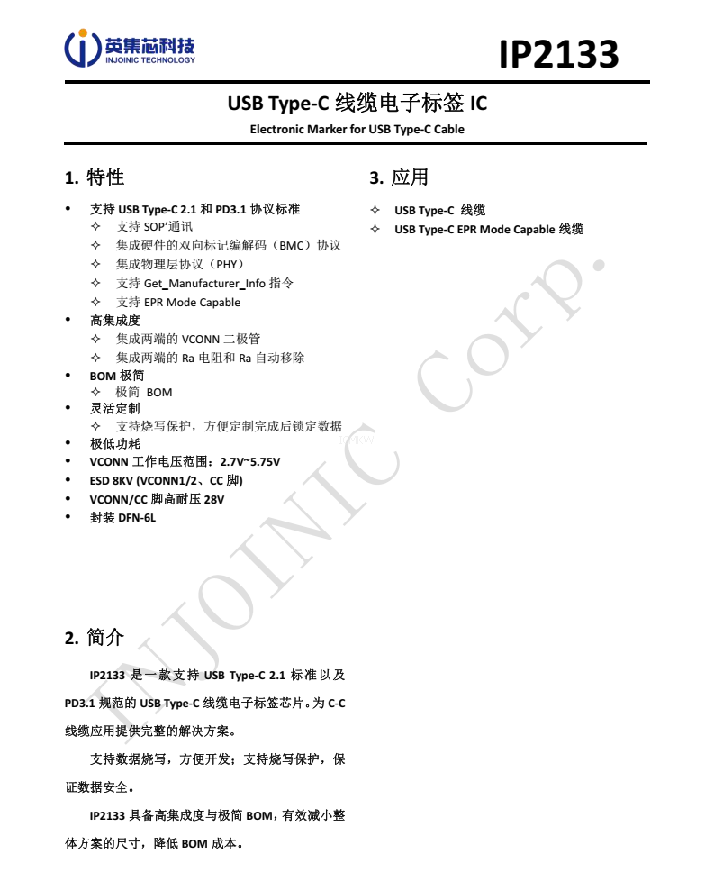 IP2133,USB Type-C 线缆电子标签芯片规格书下载