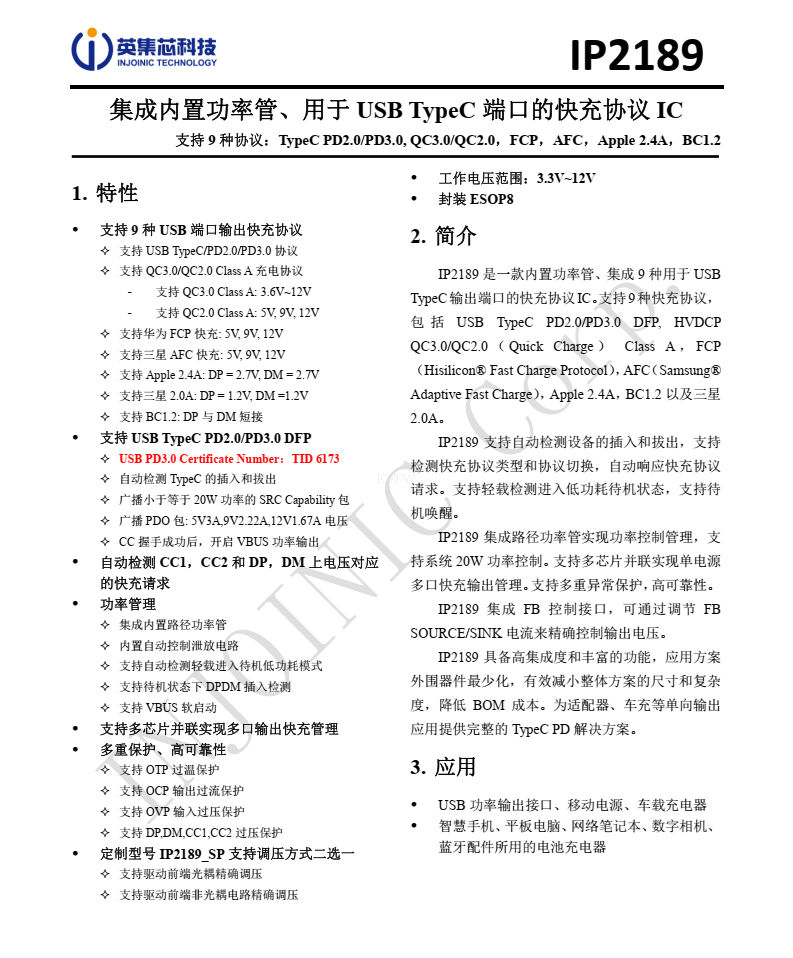 IP2189,集成内置功率管、 用于 USB TypeC 端口的快充协议芯片规格书下载