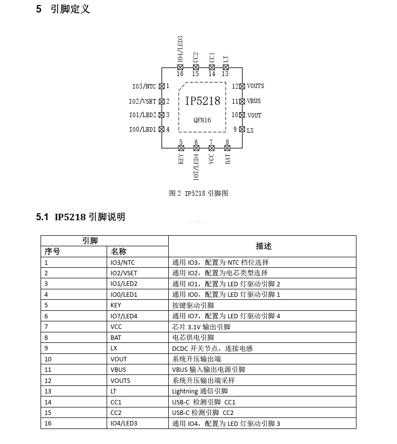 IP5218,集成 TYPE-C 协议 1A 充放电的充电管理 SOC芯片规格书下载