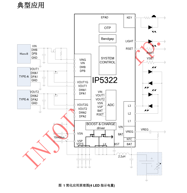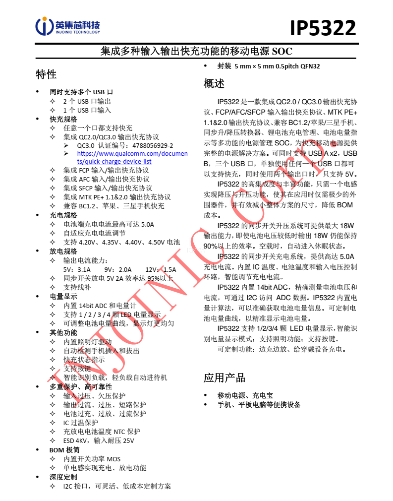 IP5322,集成多种输入输出快充功能的移动电源 SOC芯片规格书下载